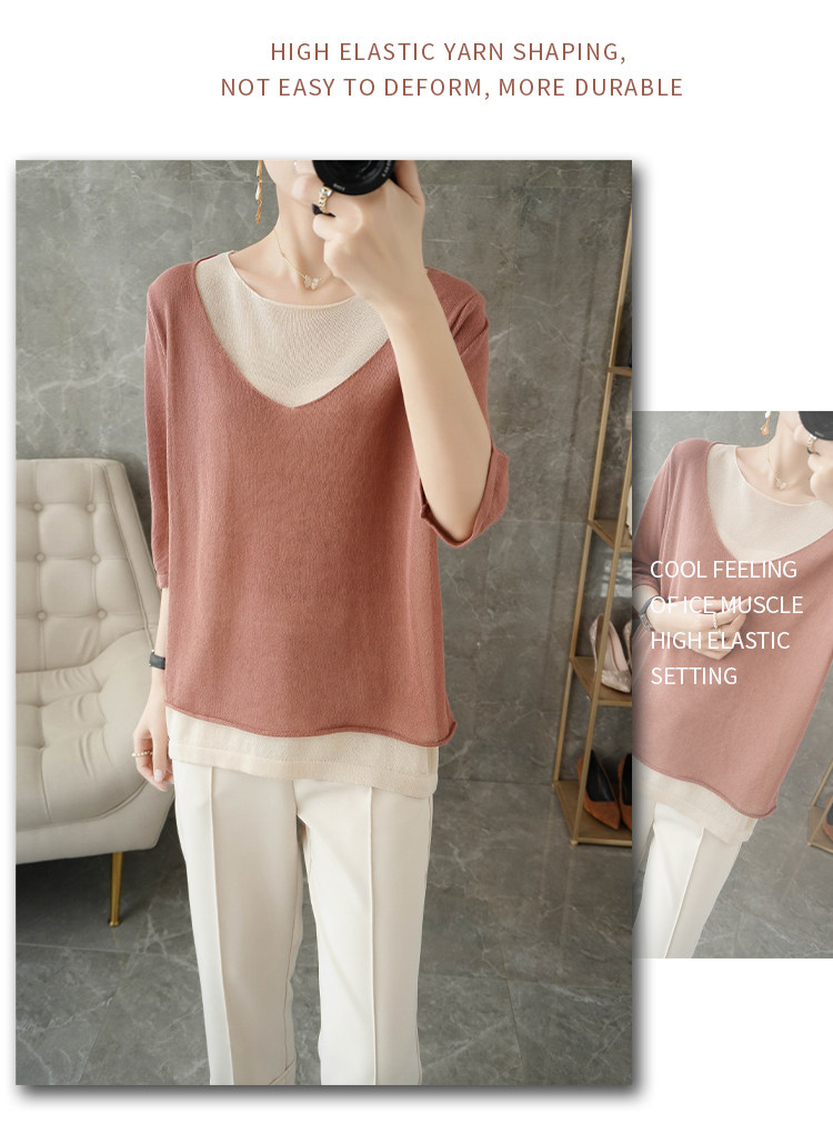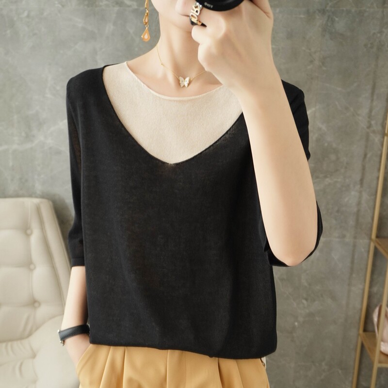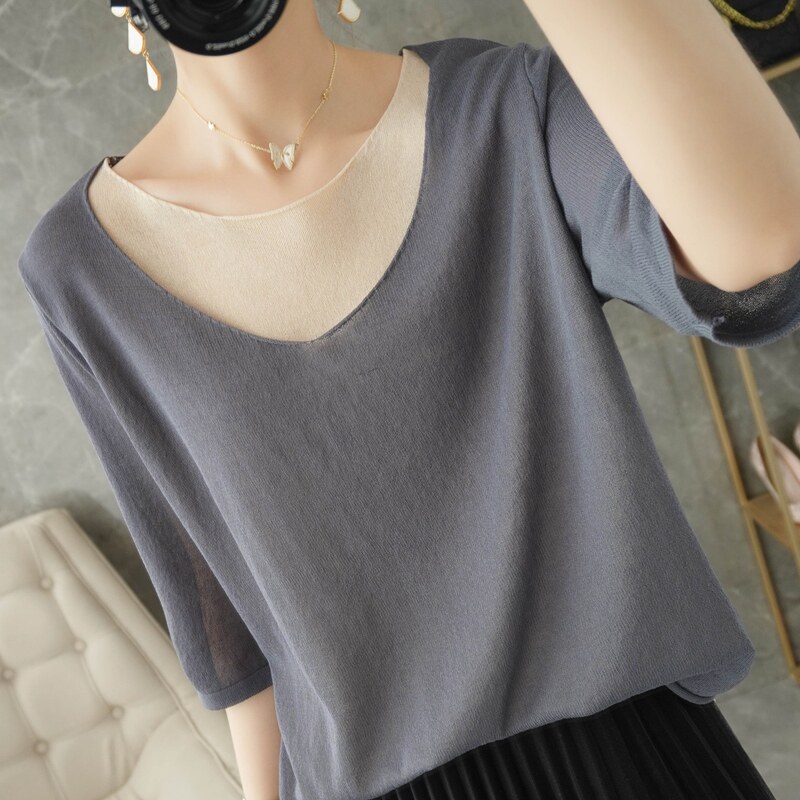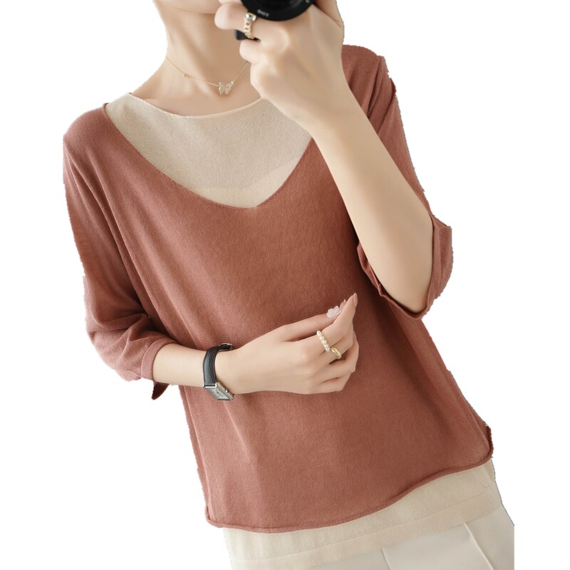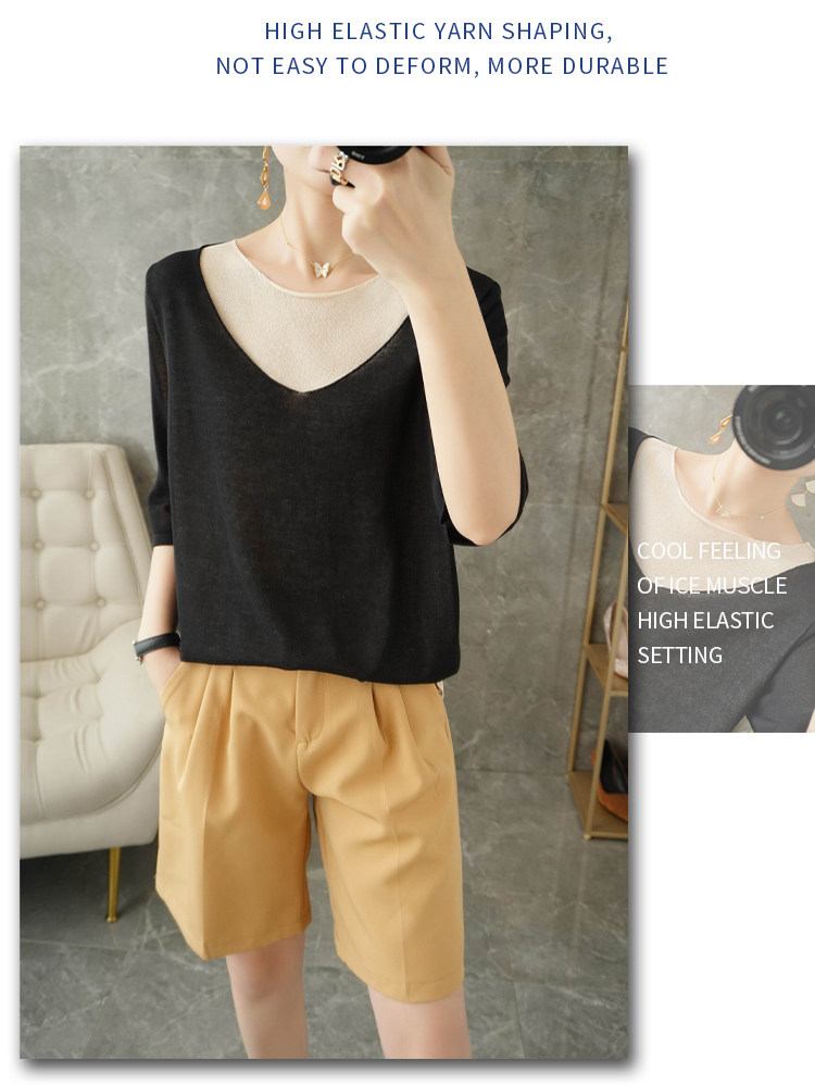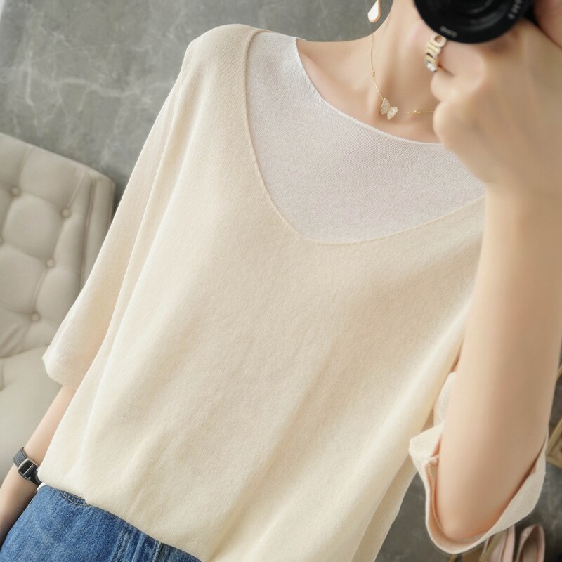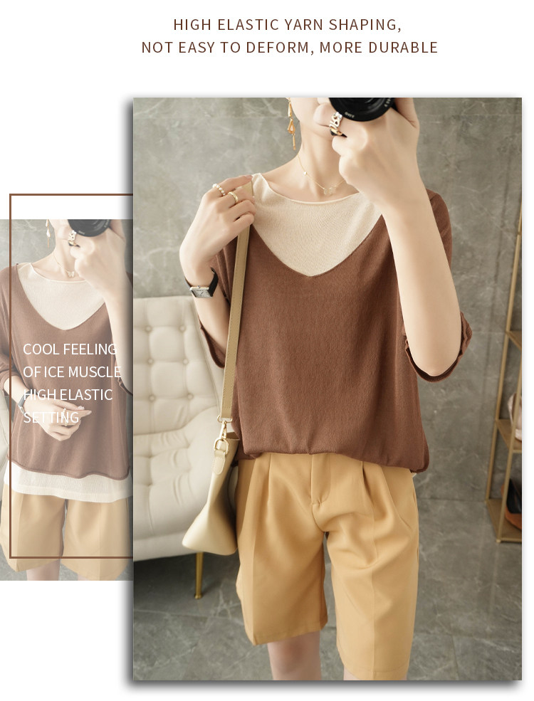 Трикотажный шелковый свитер, универсальный комплект с круглым воротником, футболка, короткий рукав, коллекция 2021, свободный крой