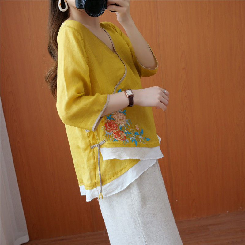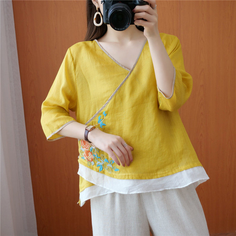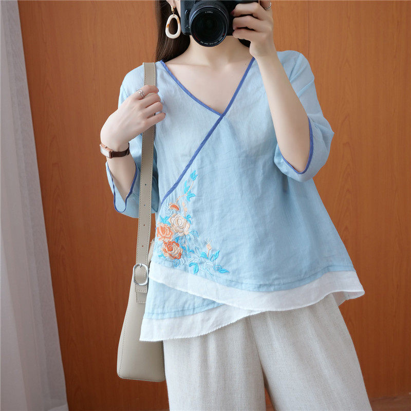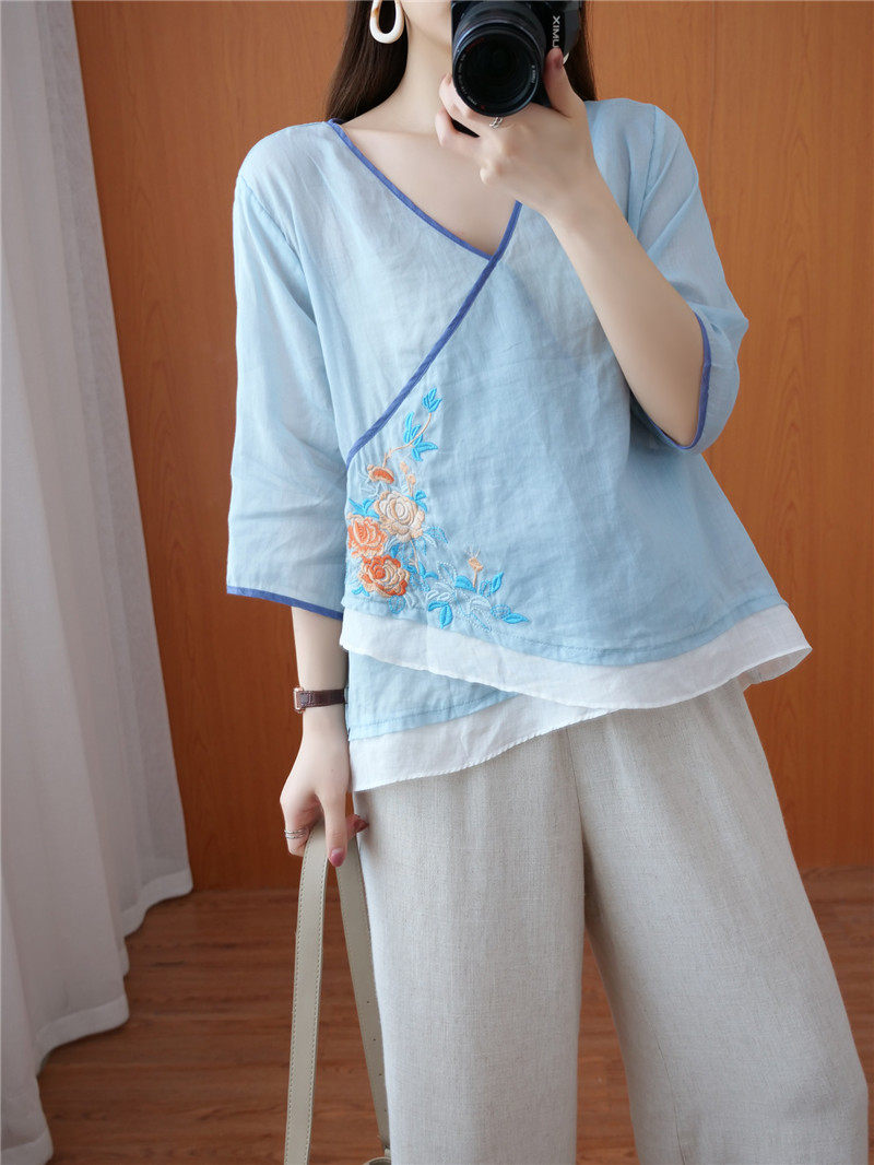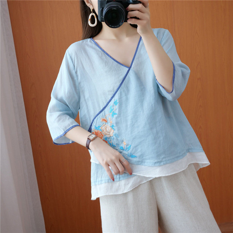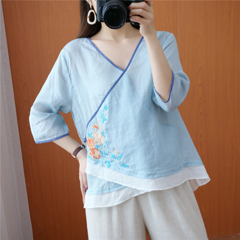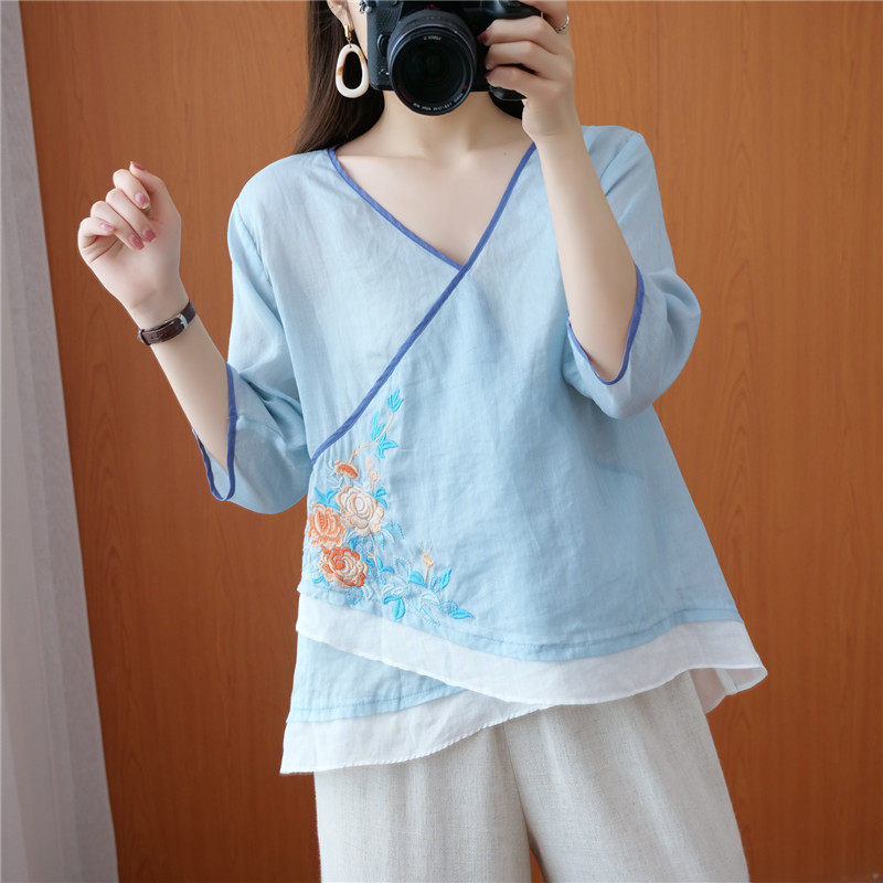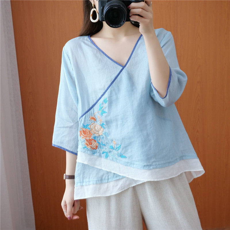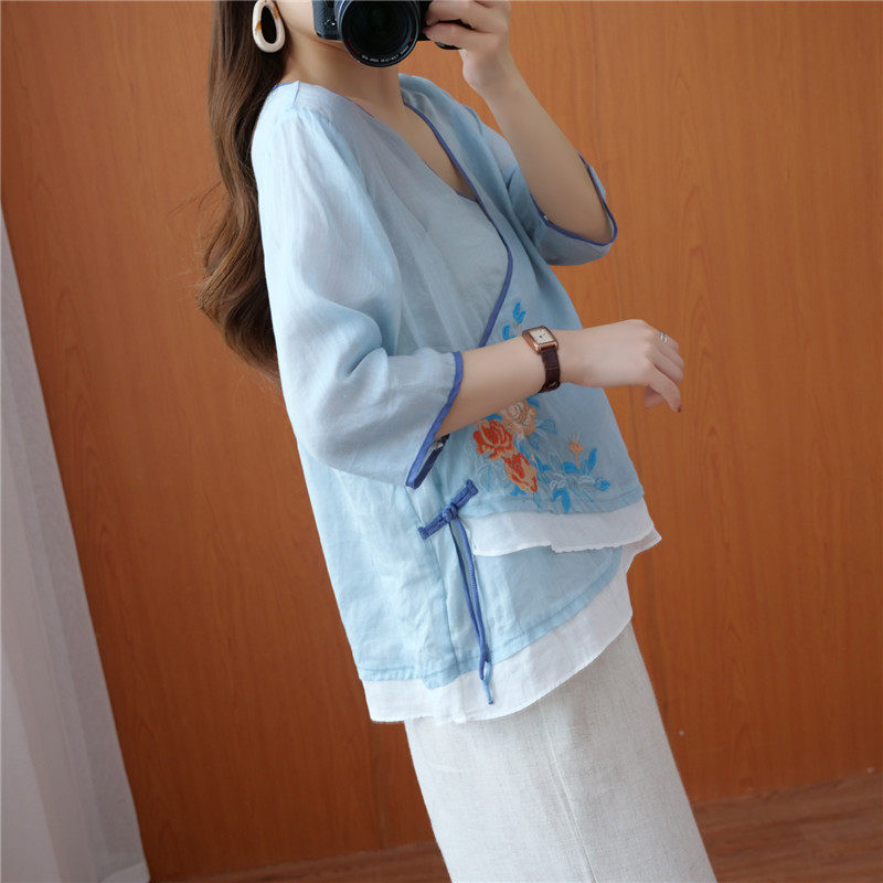 Этнический ретро летний легкий и тонкий кардиган, рубашка, этнический стиль, с вышивкой, V-образный вырез, большой размер, из хлопка и льна