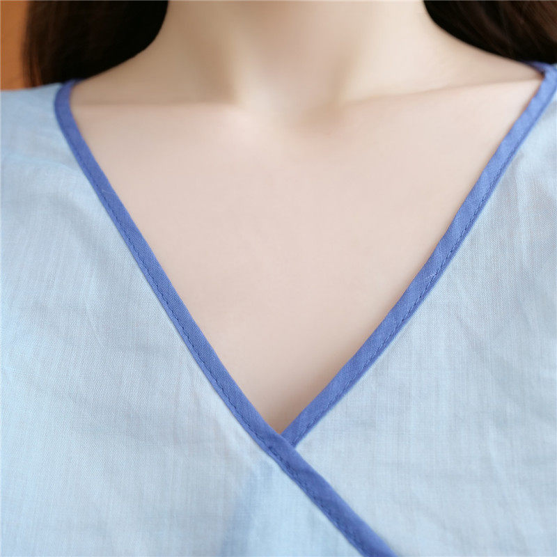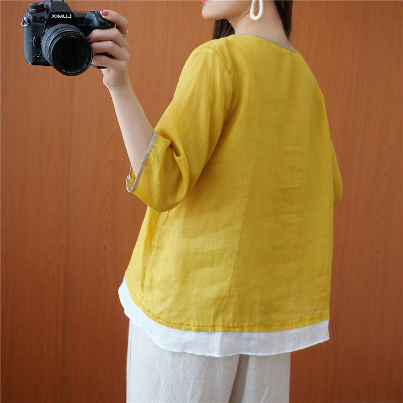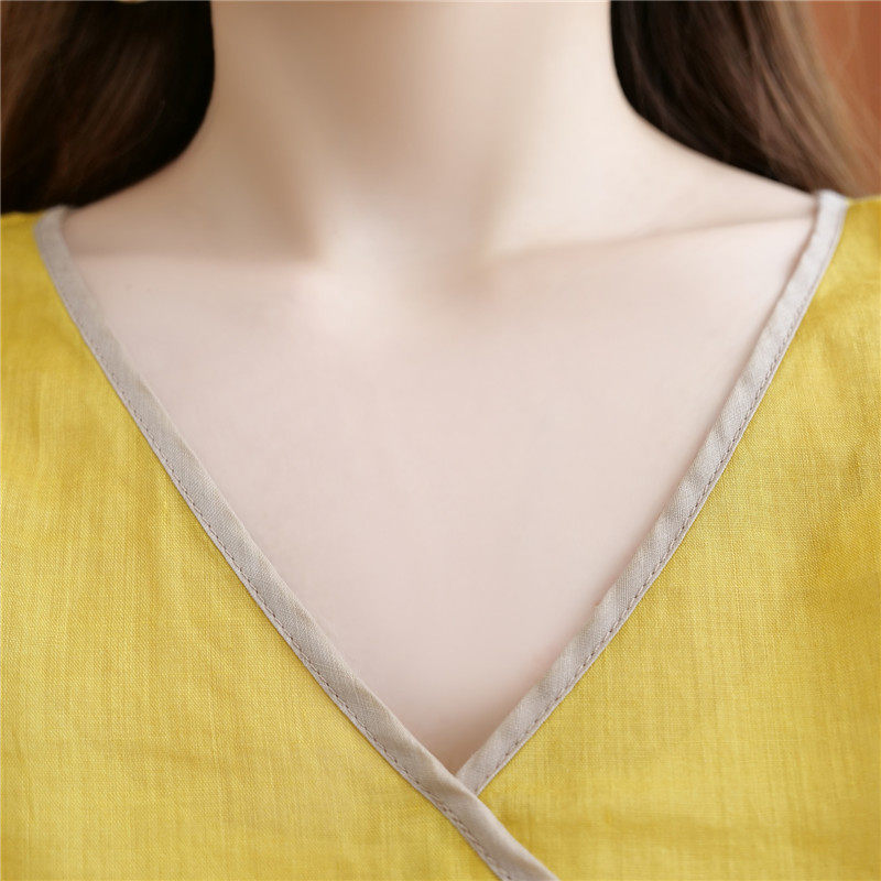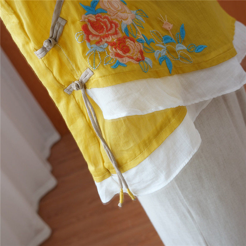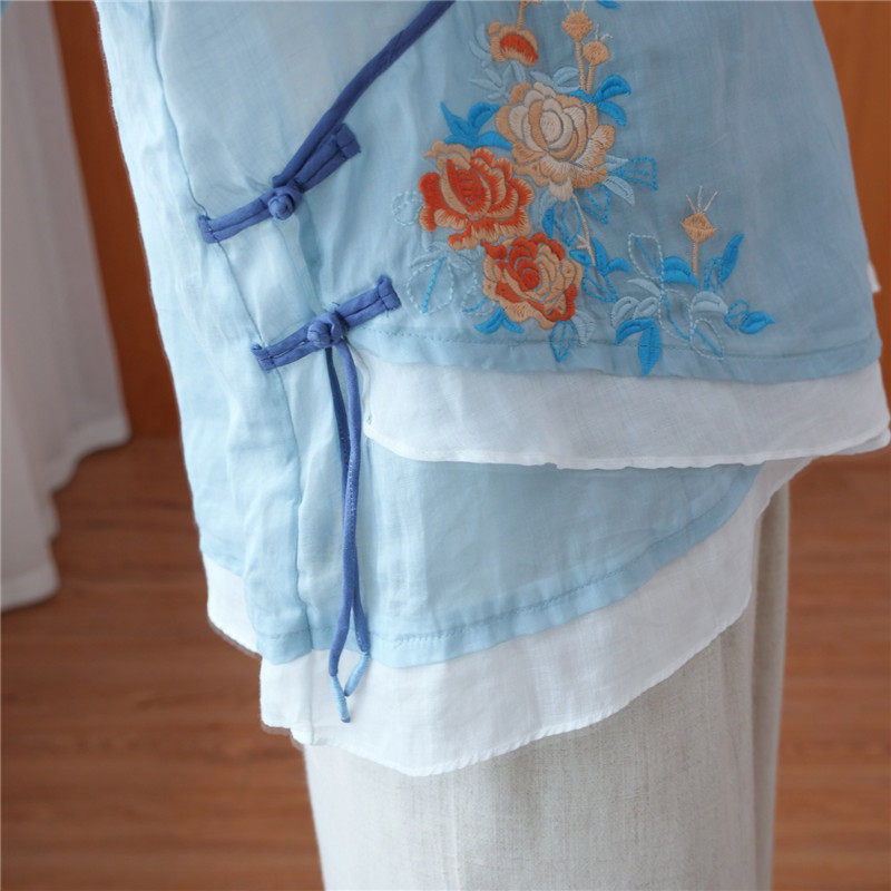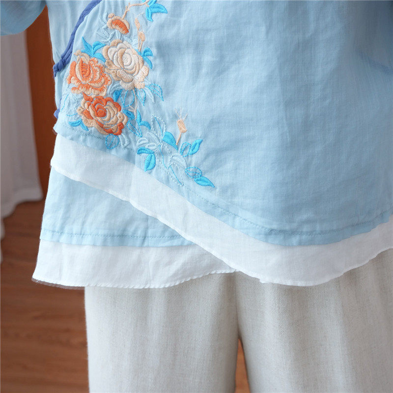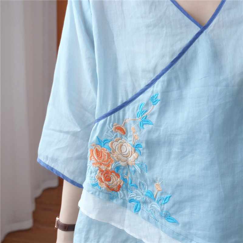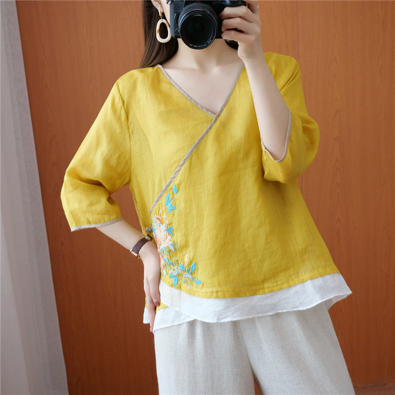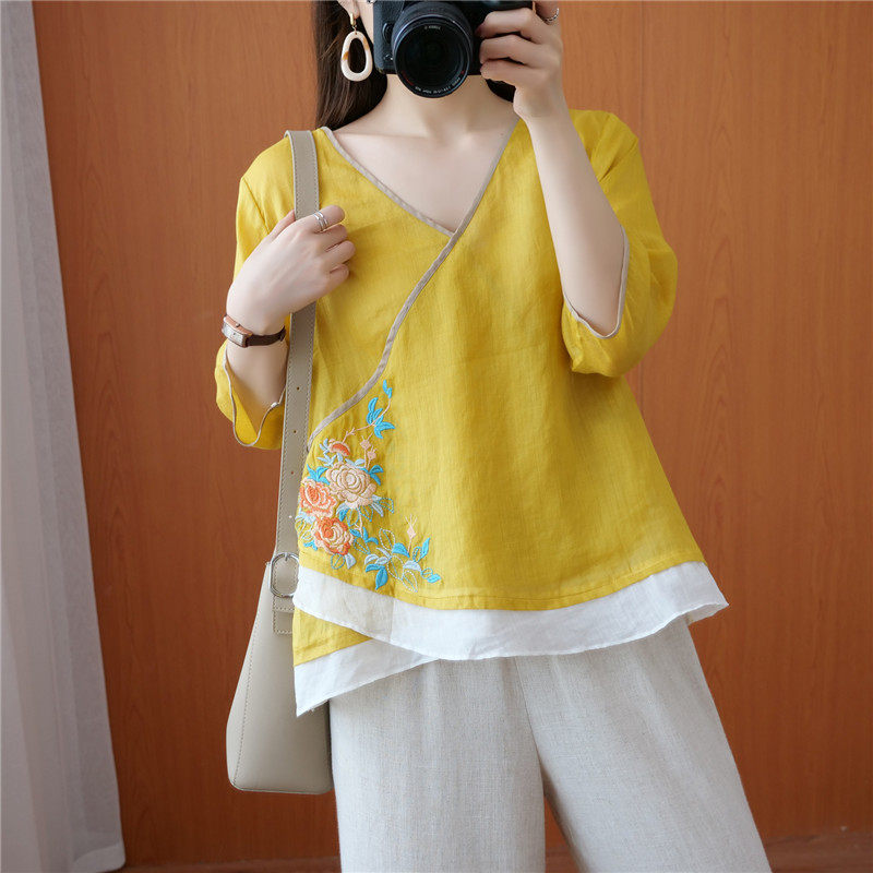 Этнический ретро летний легкий и тонкий кардиган, рубашка, этнический стиль, с вышивкой, V-образный вырез, большой размер, из хлопка и льна