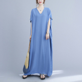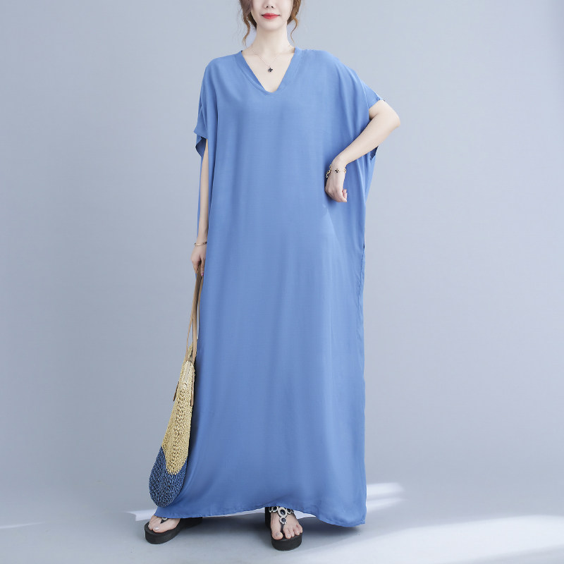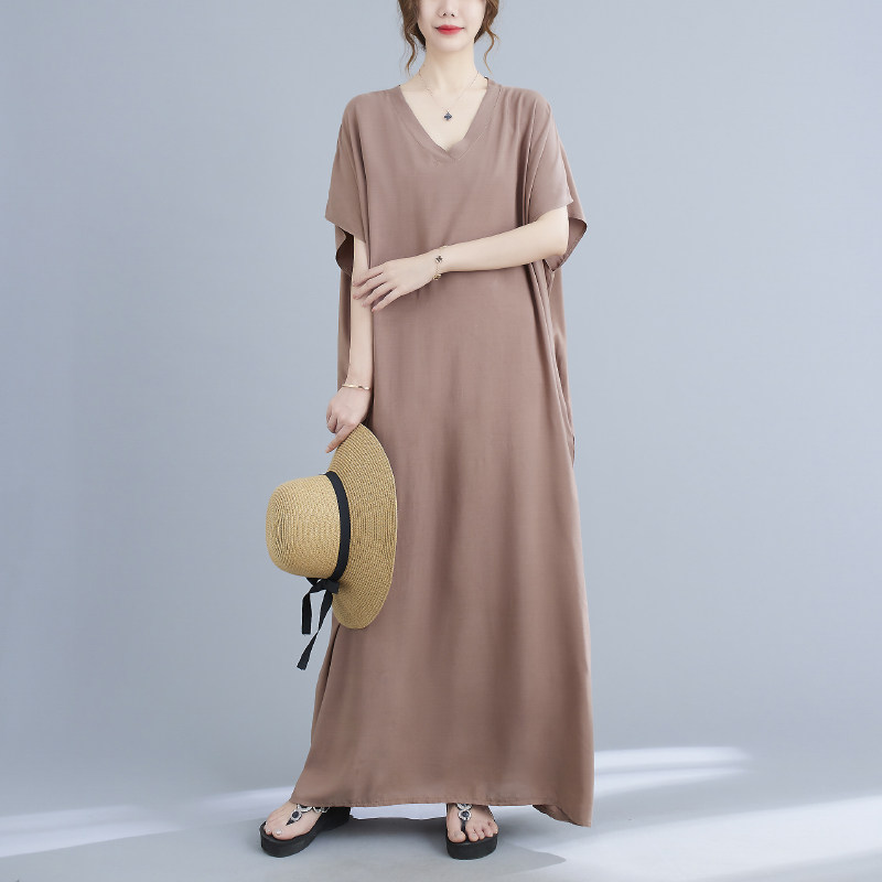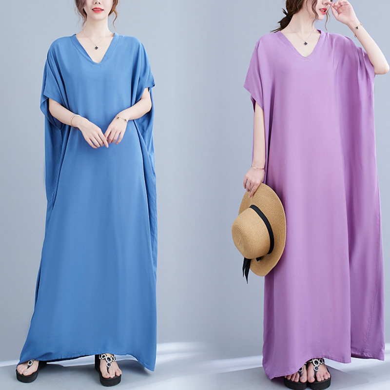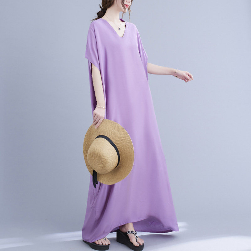 Однотонное платье, длинная юбка, большой размер, подходит для полных девушек, яркий броский стиль, V-образный вырез, подходит для подростков
