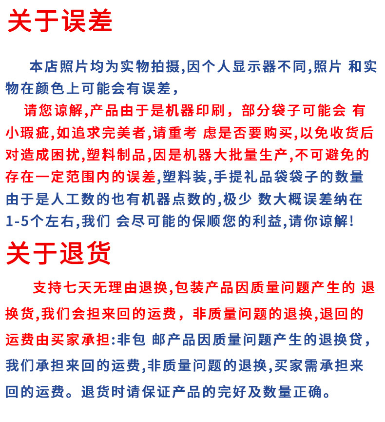 | Цвет: | [9*14CM 100只], [10*16CM 500只], [11*19CM 500只], [12*26CM 500只], [13*21CM 500只], [15*26CM 500只], [15*30CM 200只], [18*30CM 200只], [20*30CM 200只], [22*32CM 200只], [24*34CM 200只], [26*36CM 200只], [26*40CM 200只], [28*36CM 200只], [30*40CM 100只], [32*45CM 100只], [35*45CM 100只], [40*50CM 100只], [43*60CM 100只], [50*60CM 100只], [50*70CM 100只], [收缩袋定制 定制], [脚踩封口机] |