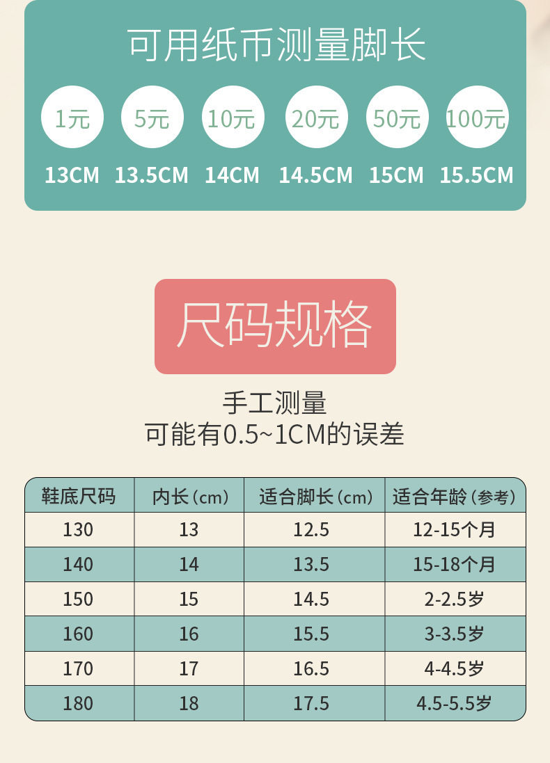 | Размер обуви: | 13см, 12-15 мес., 14см, 15-18 мес., Внутренняя длина 15 см подходит для 2-2,5 лет, Внутренняя длина 16 см подходит для 3-3,5 лет, 17 см. Внутренняя длина подходит для 4-4,5 лет, Внутренняя длина 18 см подходит для 5-5,5 лет, Внутренняя длина 19 см, подходит для детей 6-6,5 лет., Внутренняя длина 20 см, подходит для детей 7-7,5 лет. |