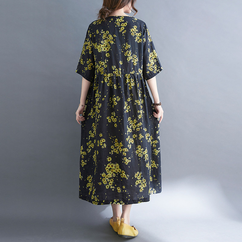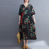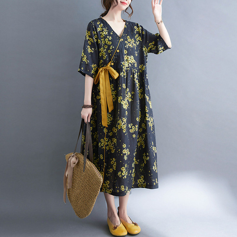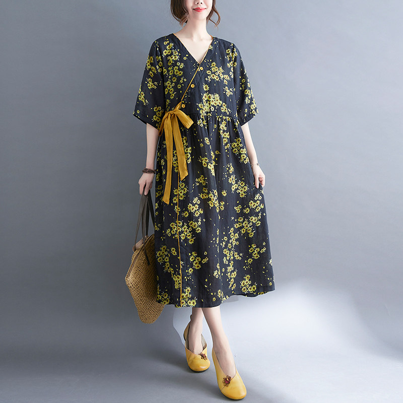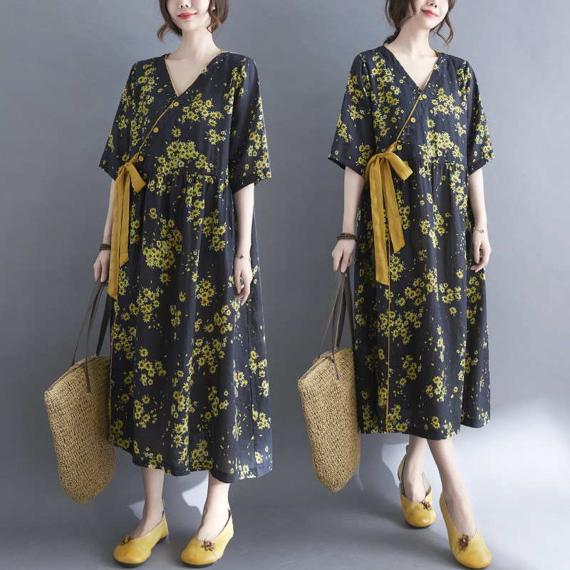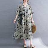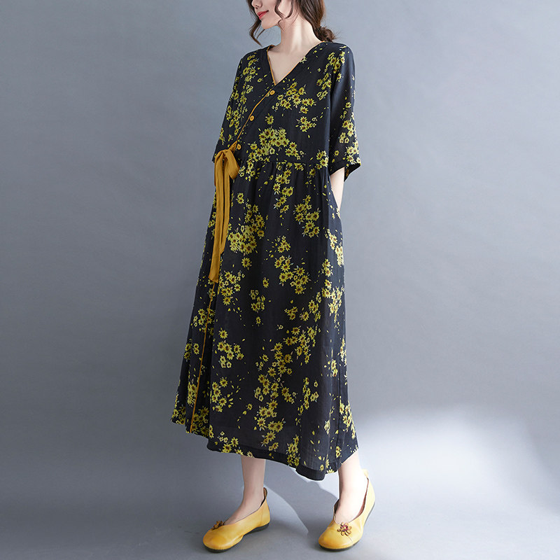 Платье, ремень, длинная юбка, из хлопка и льна, коллекция 2021, оверсайз, V-образный вырез, китайский стиль, средней длины