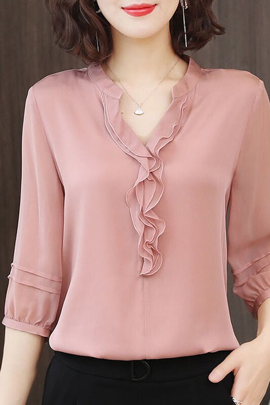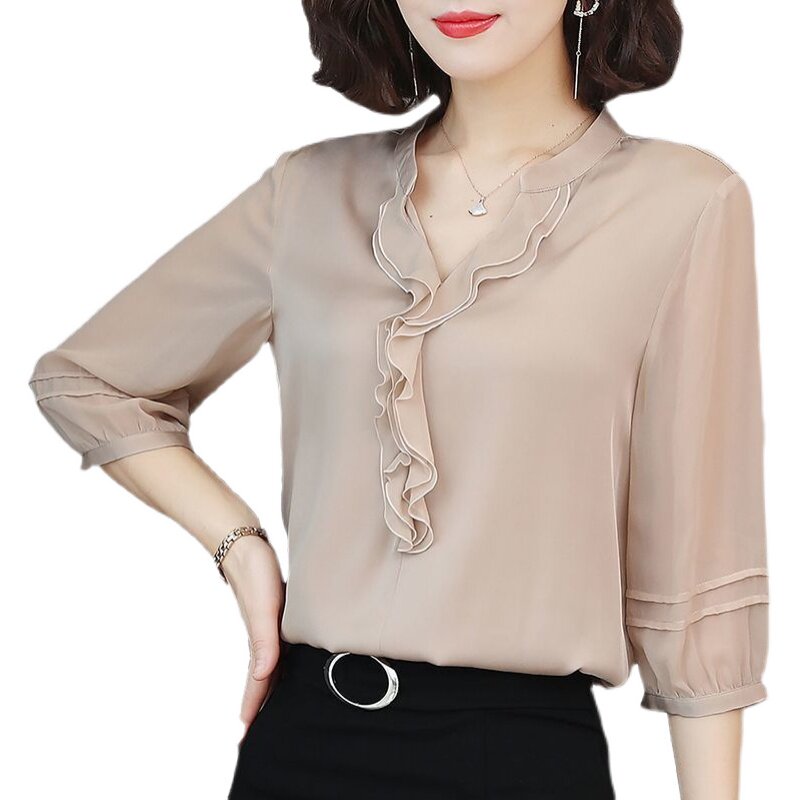 Осенняя рубашка, шифоновая футболка, в корейском стиле, свободный крой, V-образный вырез