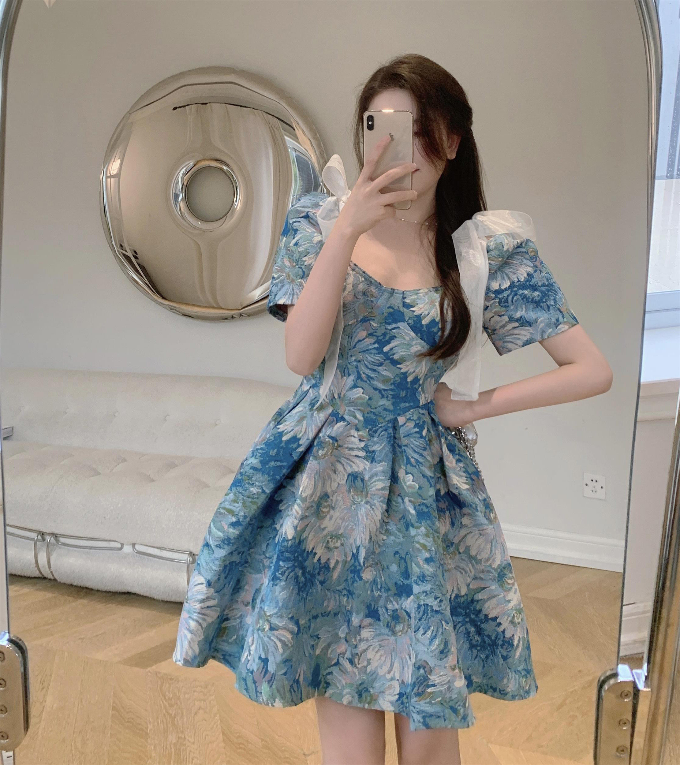 Платье, синий приталенный корсет, большой размер, французский стиль, коллекция 2021, подходит для полных девушек, в цветочек