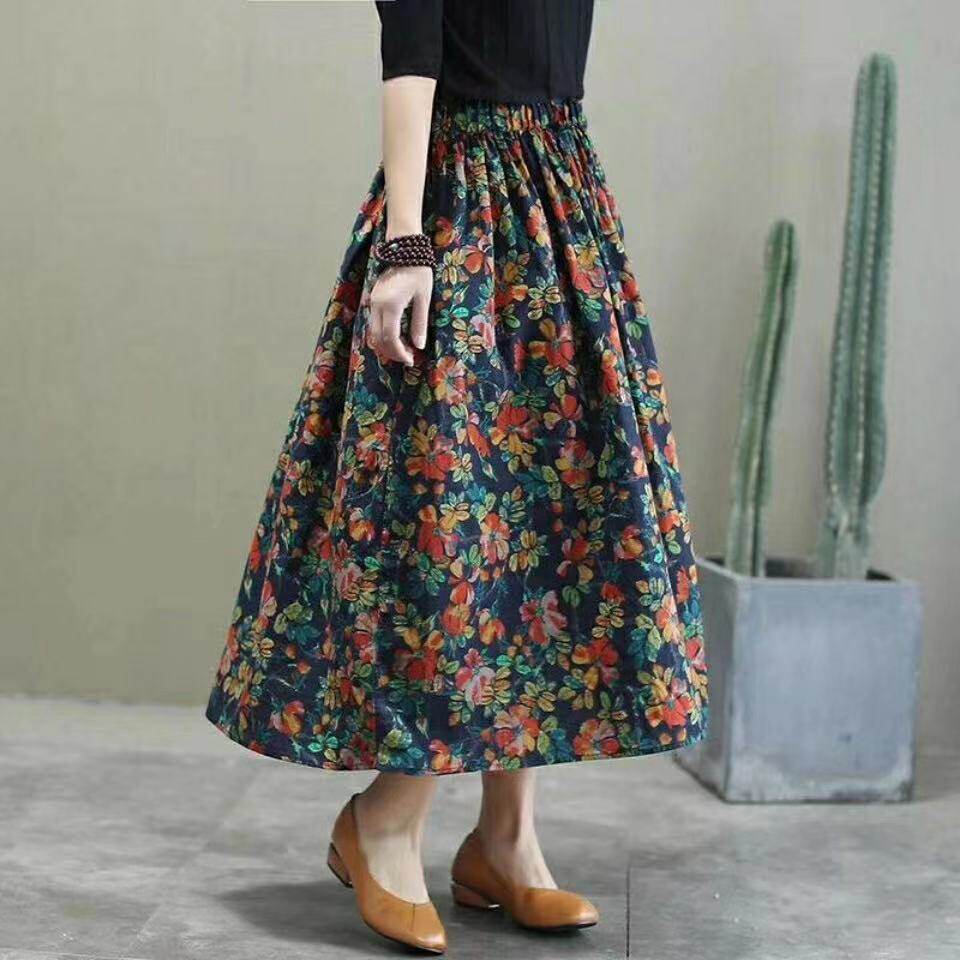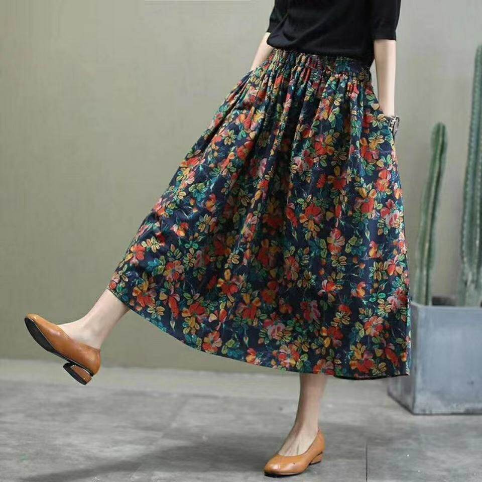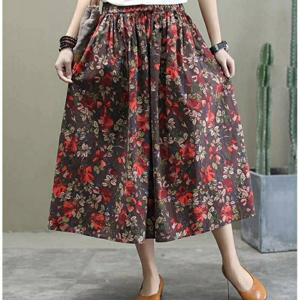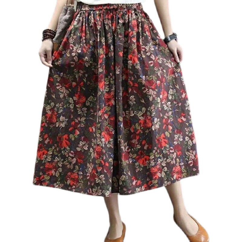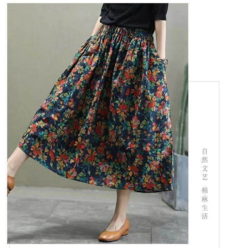 Длинная летняя одежда, приталенная ретро длинная юбка, из хлопка и льна, цветочный принт, коллекция 2021, средней длины, А-силуэт