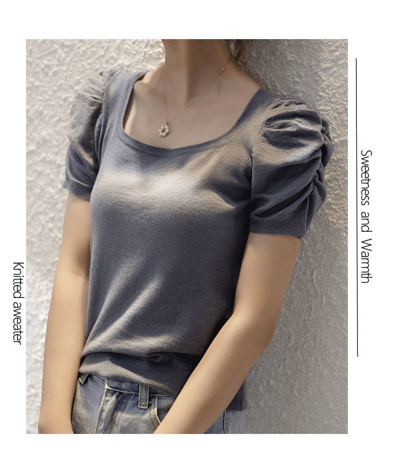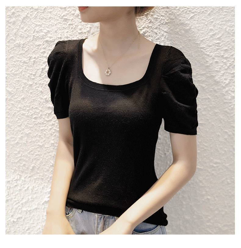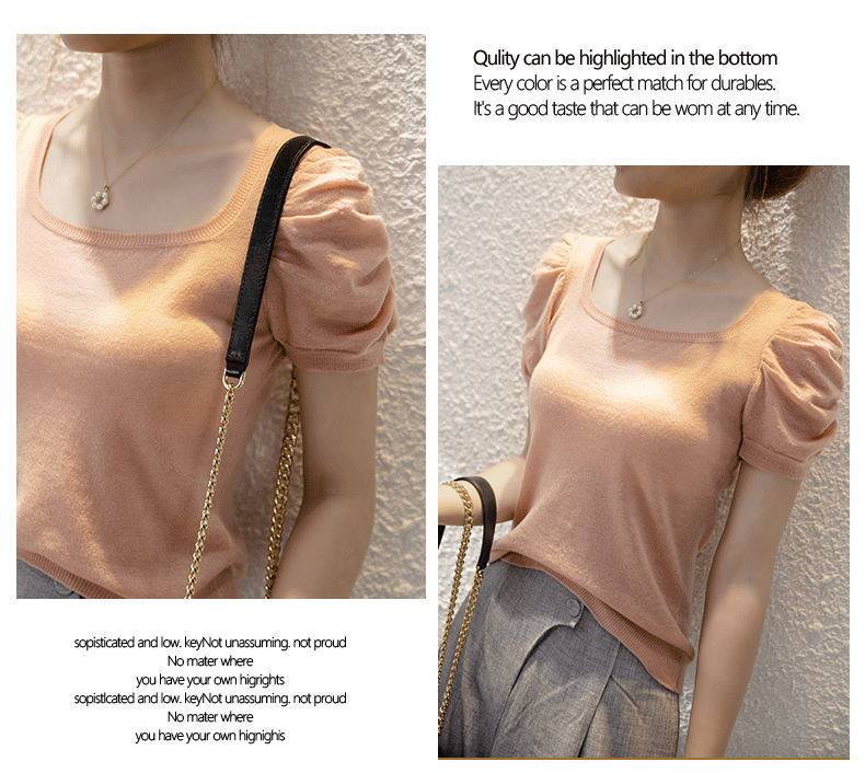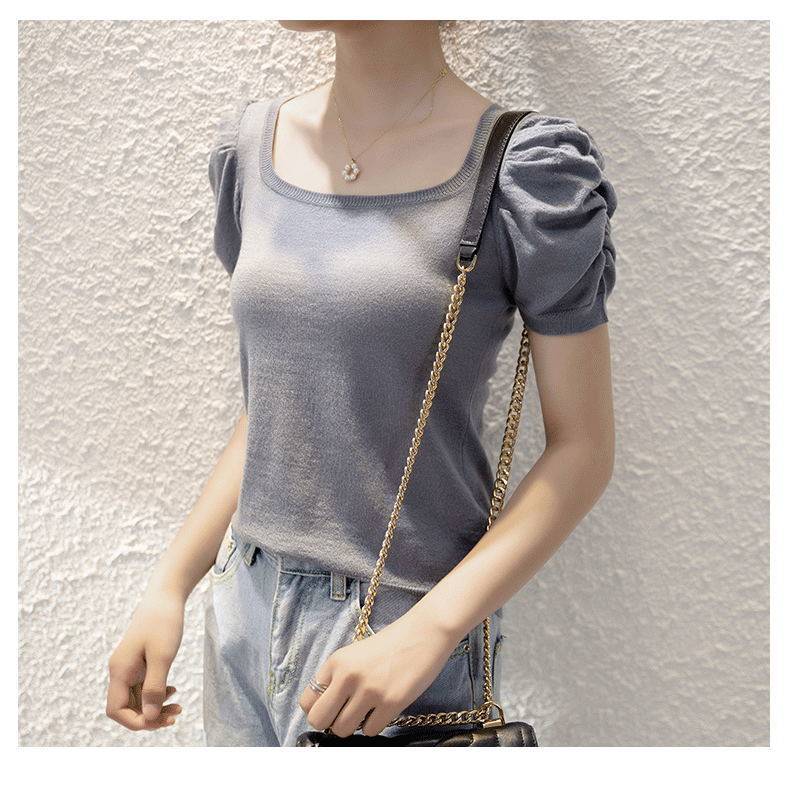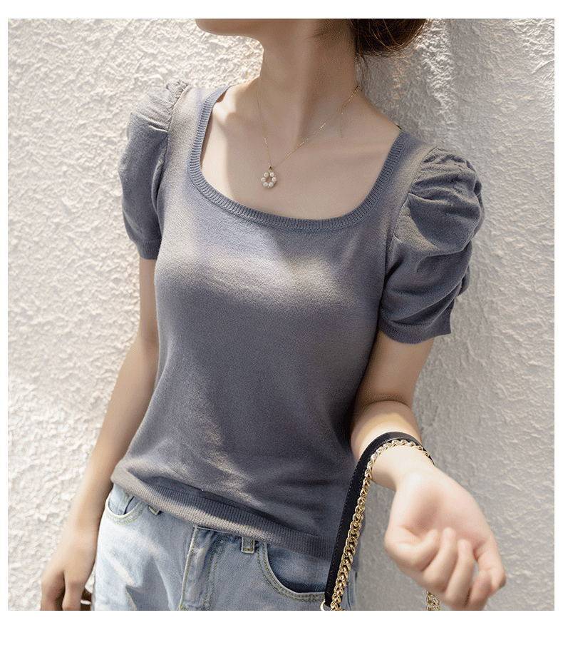 Трикотажный летний тонкий свитер, трикотажная футболка, квадратный вырез, рукава фонарики, облегающий крой