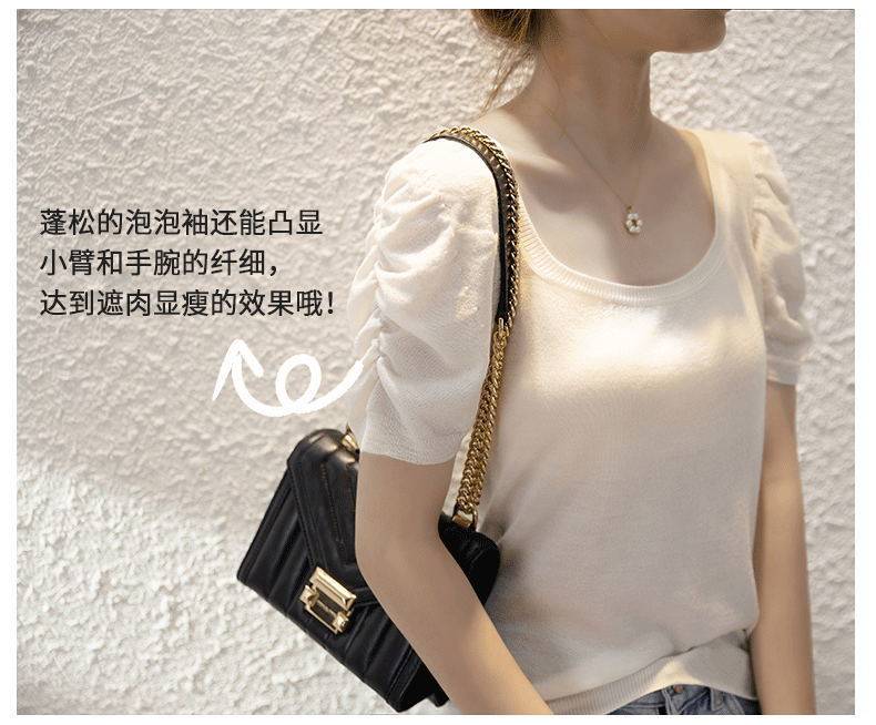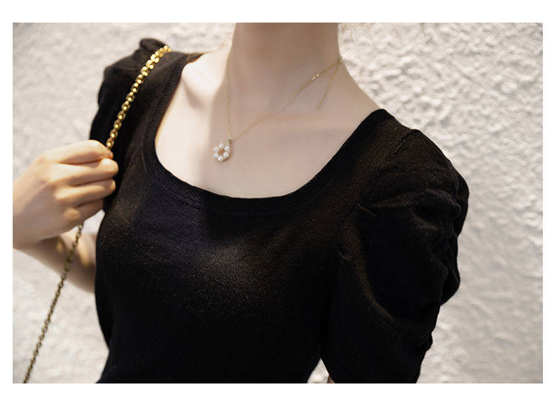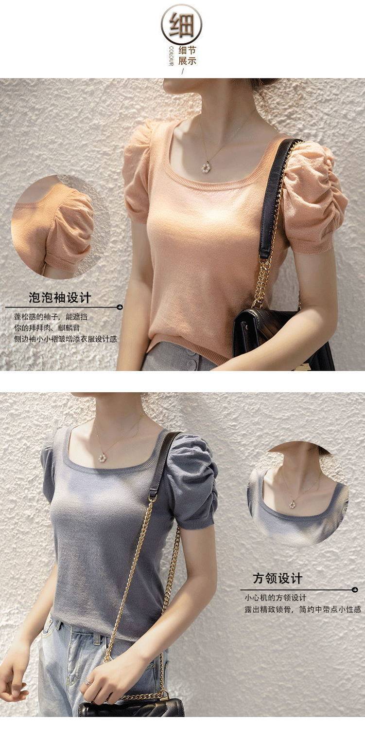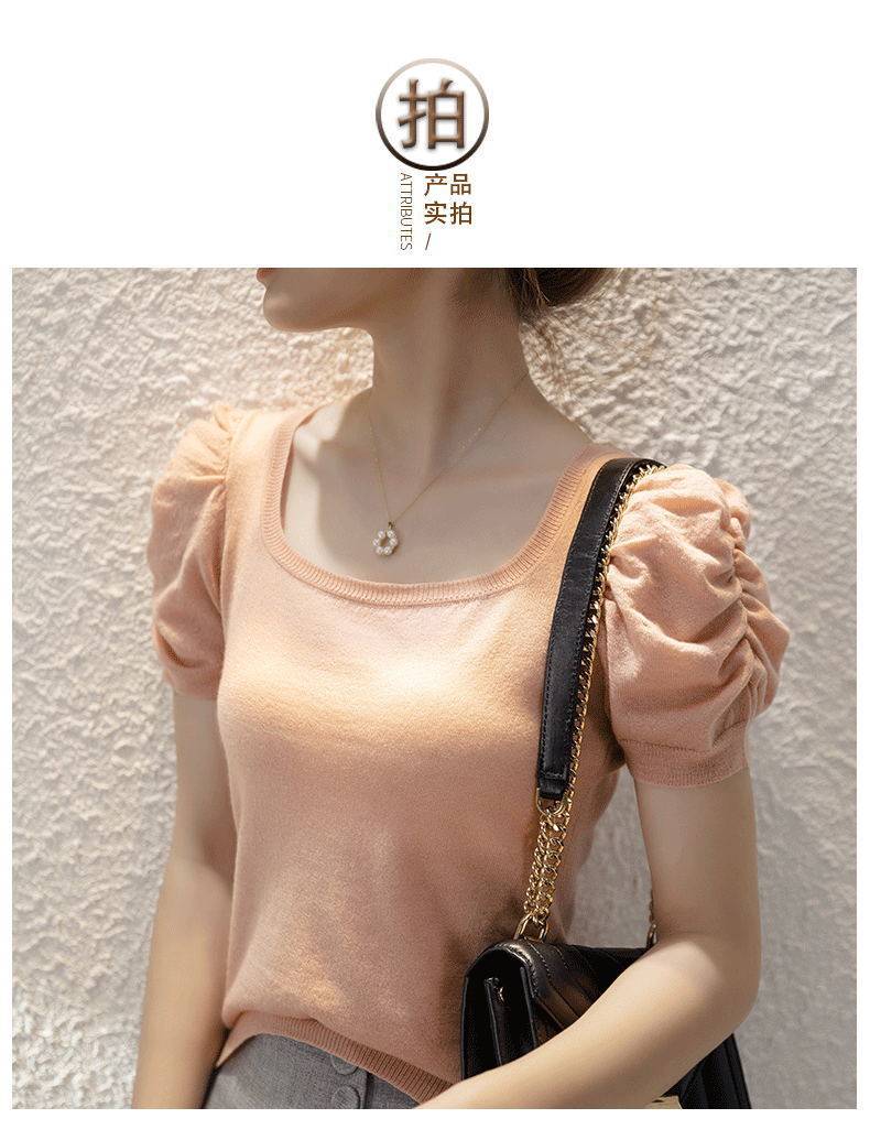 Трикотажный летний тонкий свитер, трикотажная футболка, квадратный вырез, рукава фонарики, облегающий крой