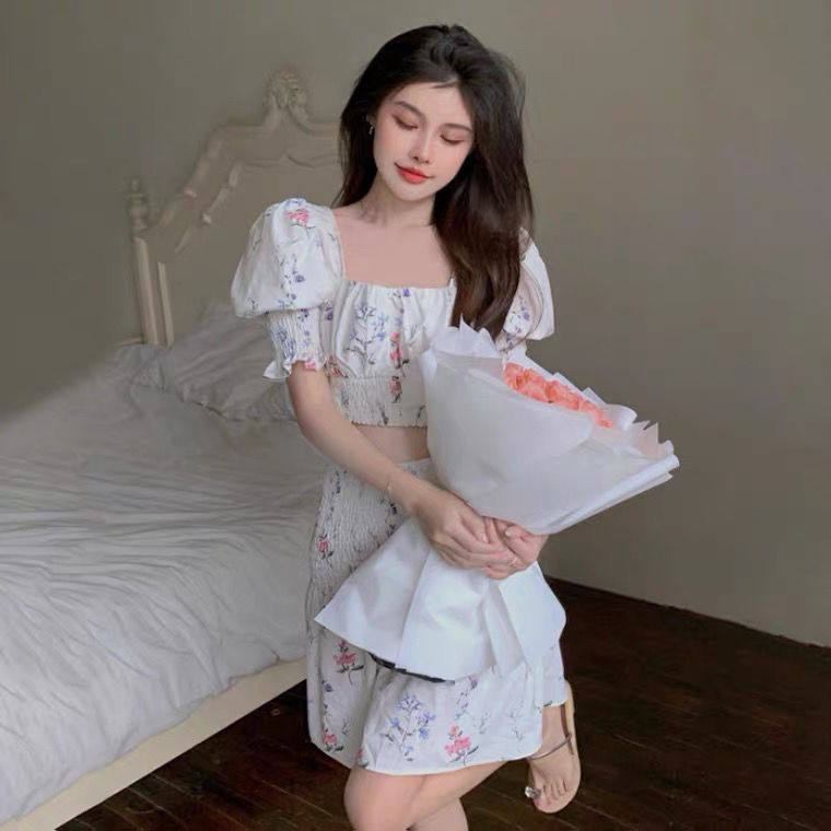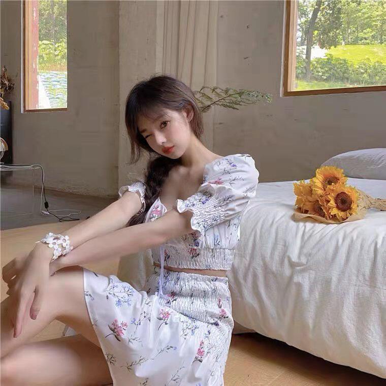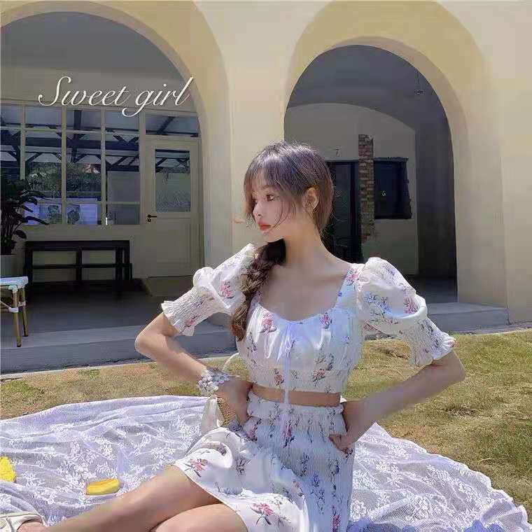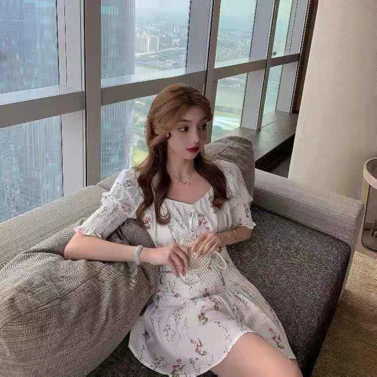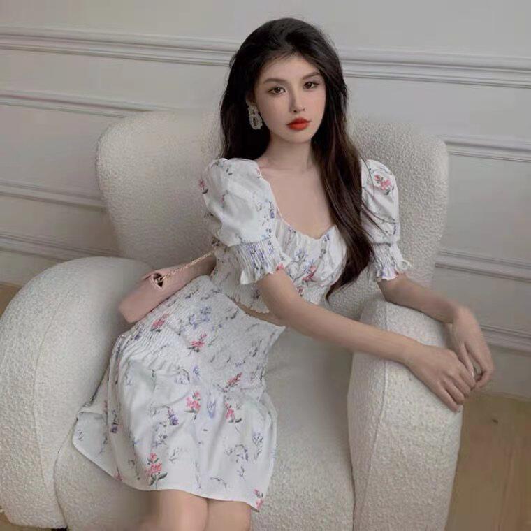 Платье, комплект, 2021 года, французский стиль, цветочный принт, квадратный вырез, подходит для подростков