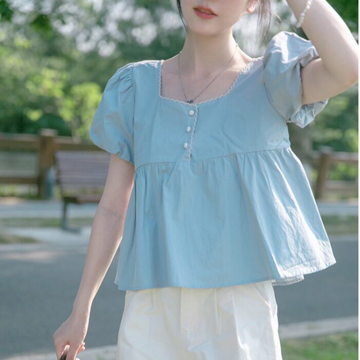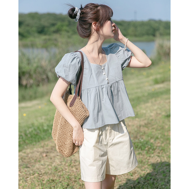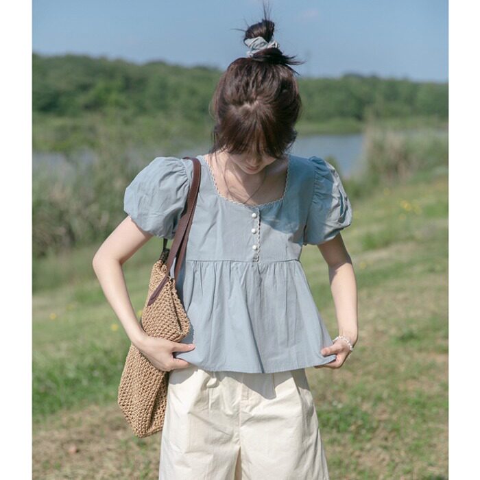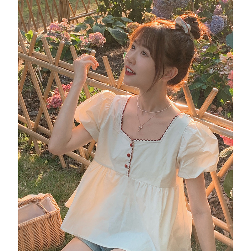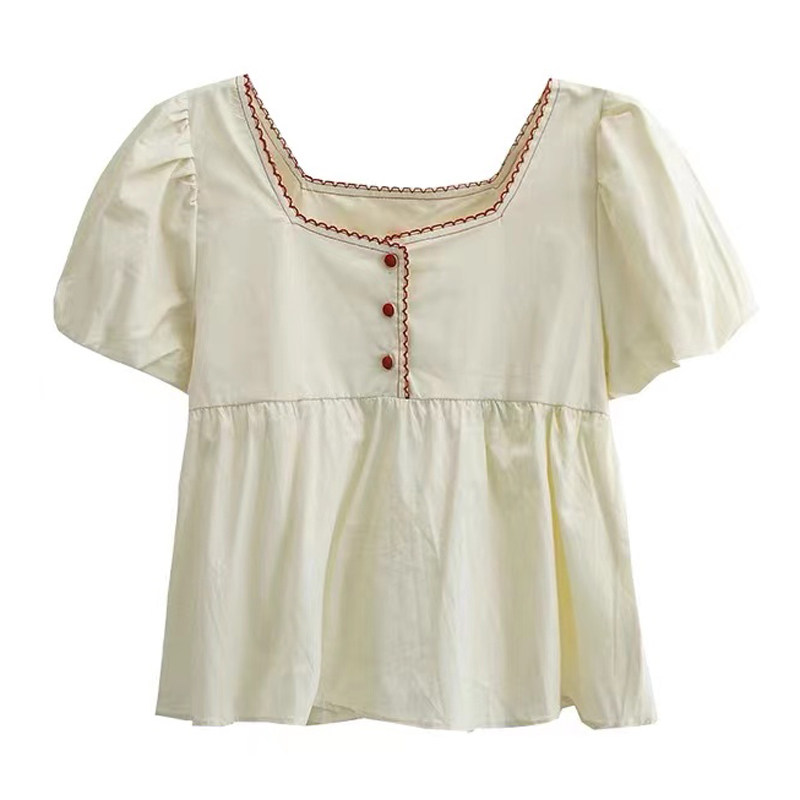 Летняя короткая рубашка, квадратный вырез, с вышивкой, оверсайз, рукава фонарики