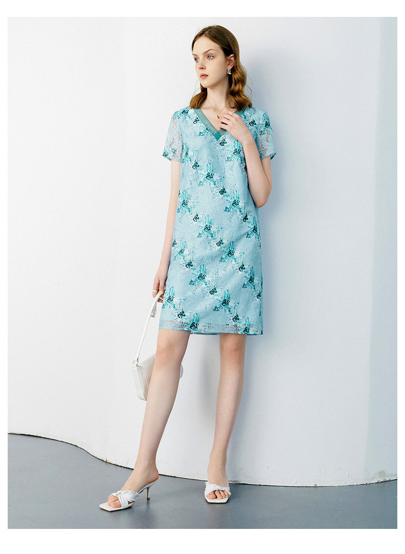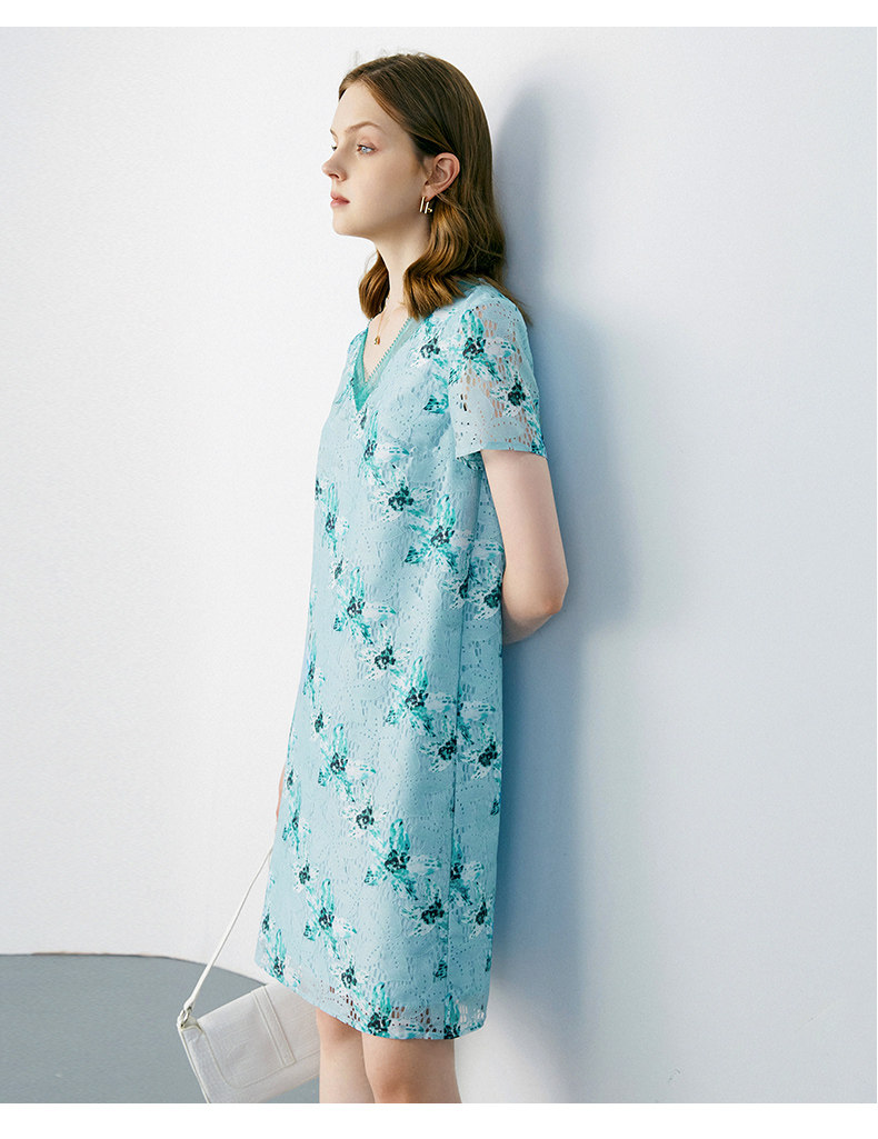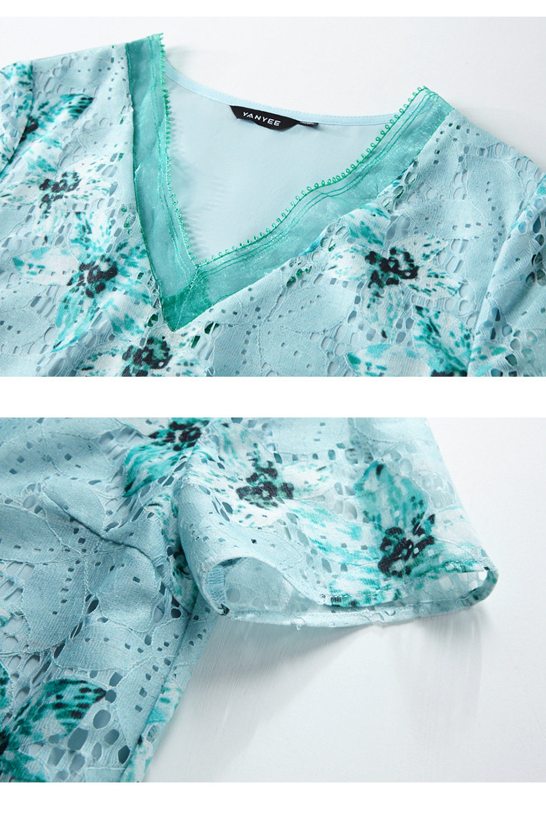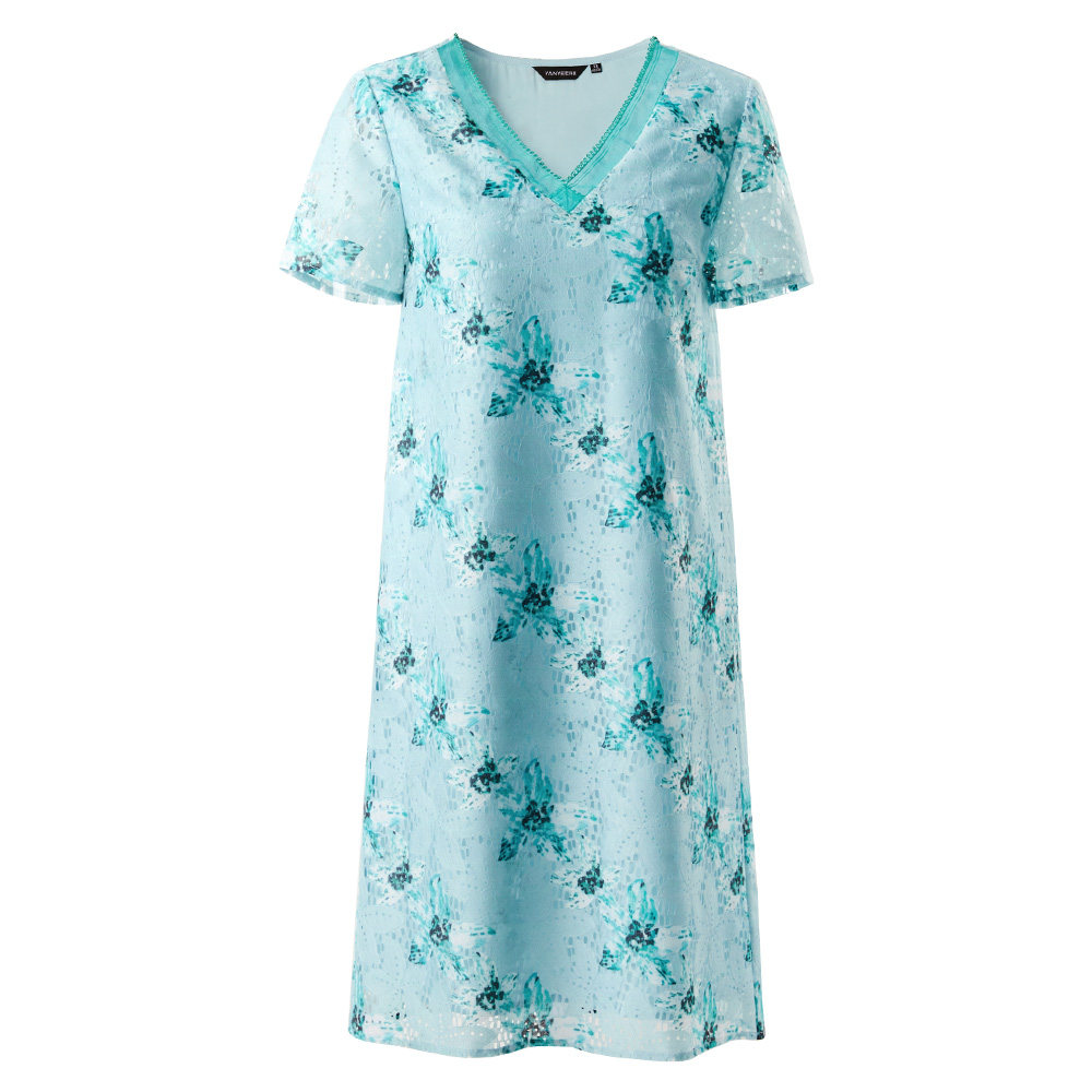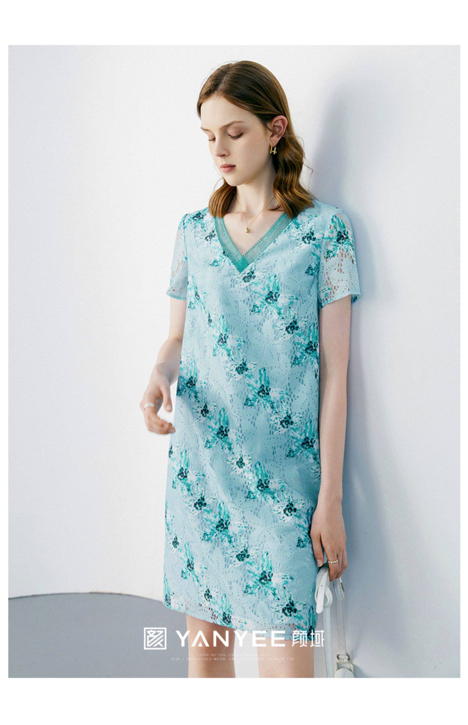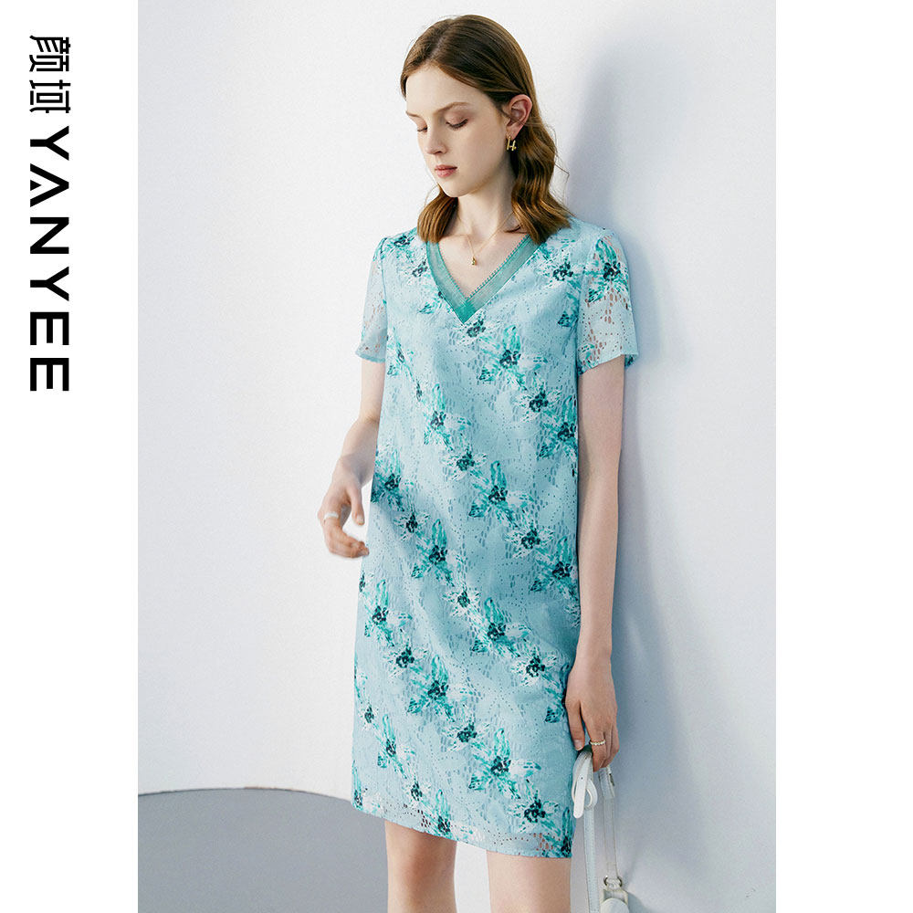 颜域 Кружевное летнее платье, длинная юбка, короткий рукав, V-образный вырез, свободный прямой крой, стройный силуэт, средней длины