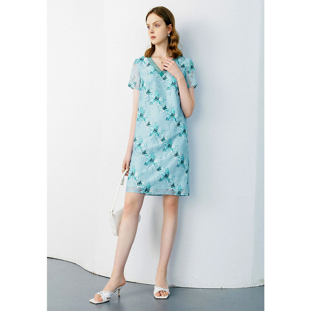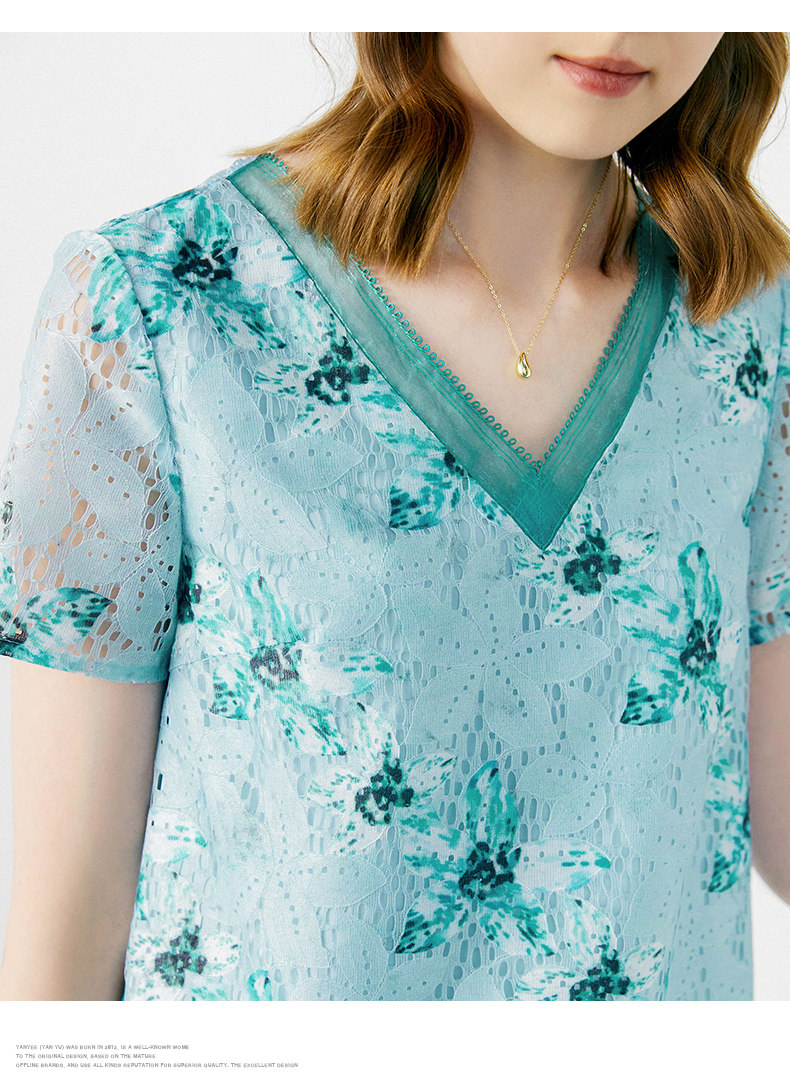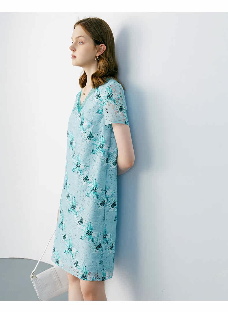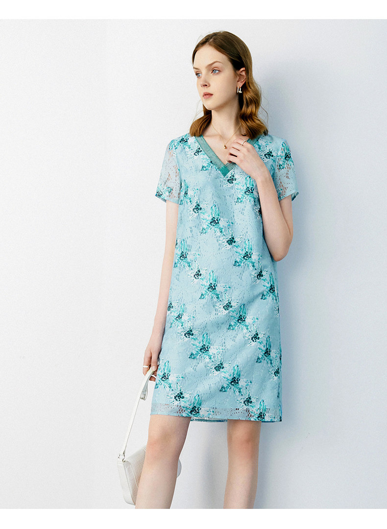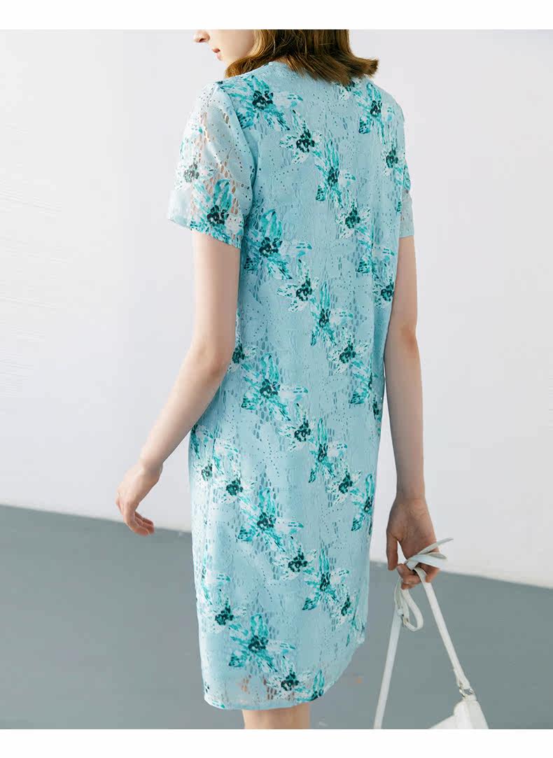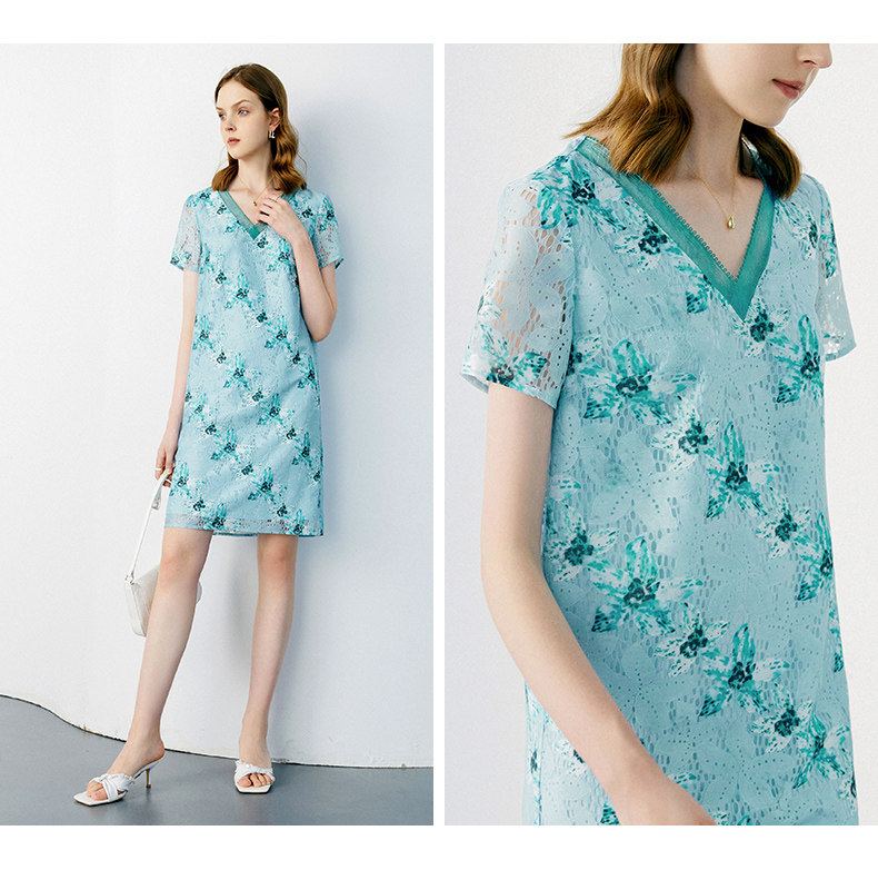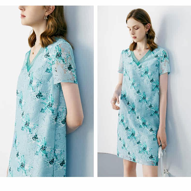 颜域 Кружевное летнее платье, длинная юбка, короткий рукав, V-образный вырез, свободный прямой крой, стройный силуэт, средней длины