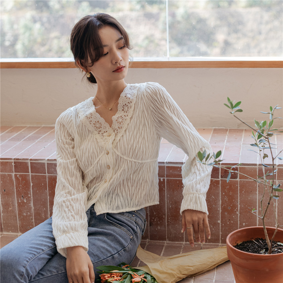 Tide, кружевная осенняя модная базовая приятная телу короткая рубашка, в западном стиле, кружевное платье, V-образный вырез