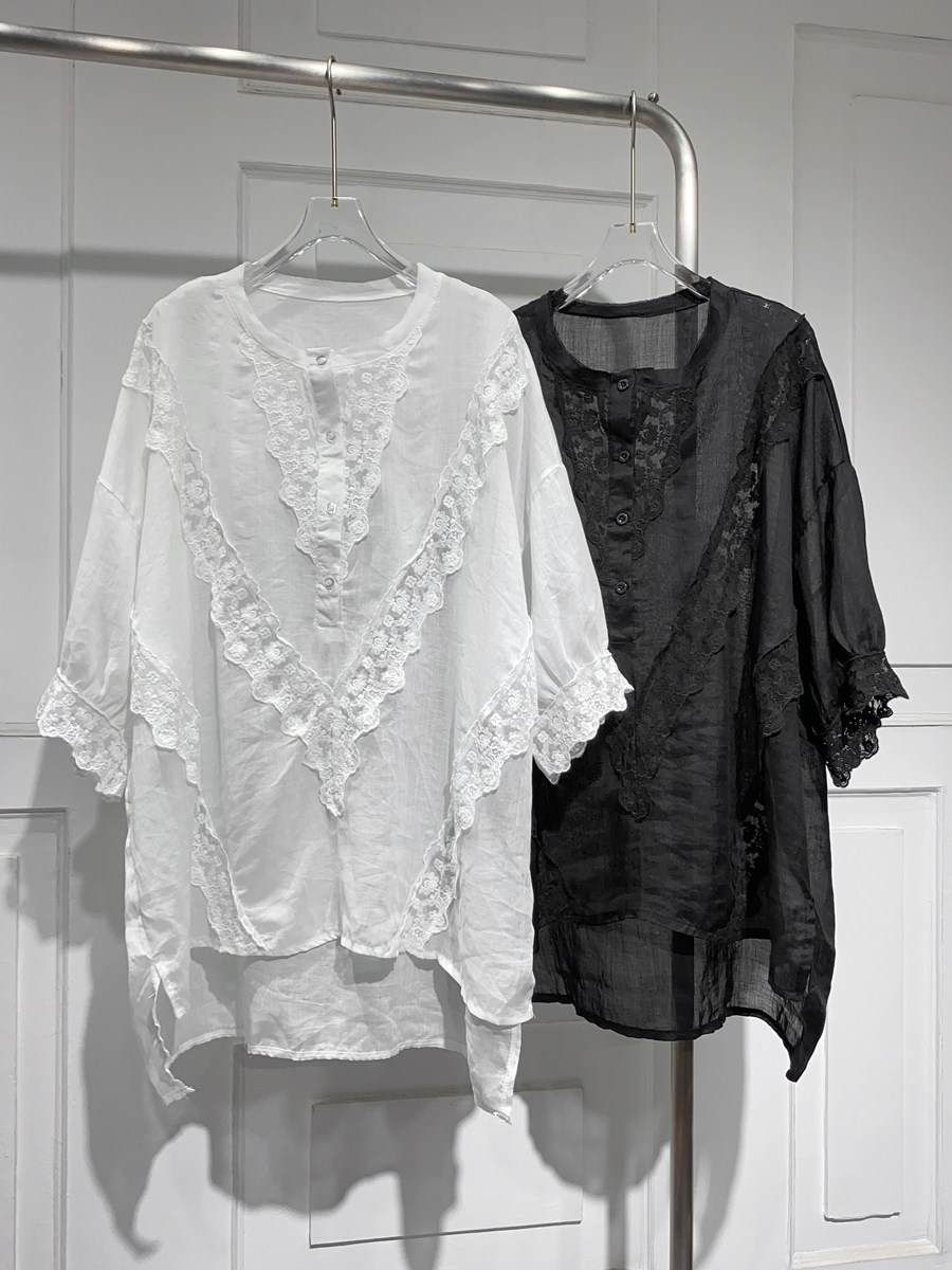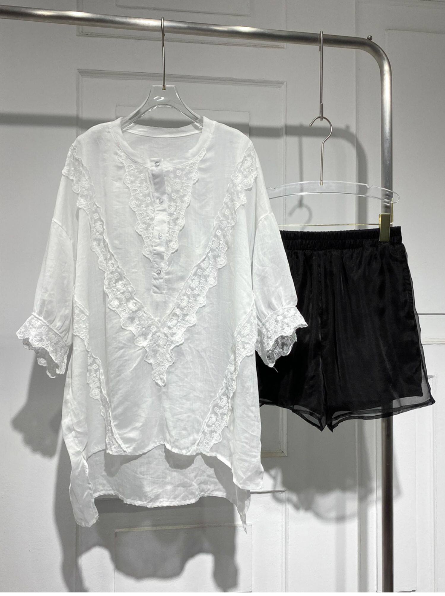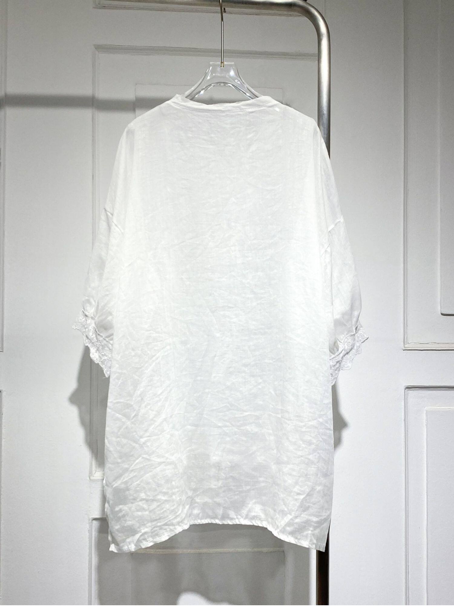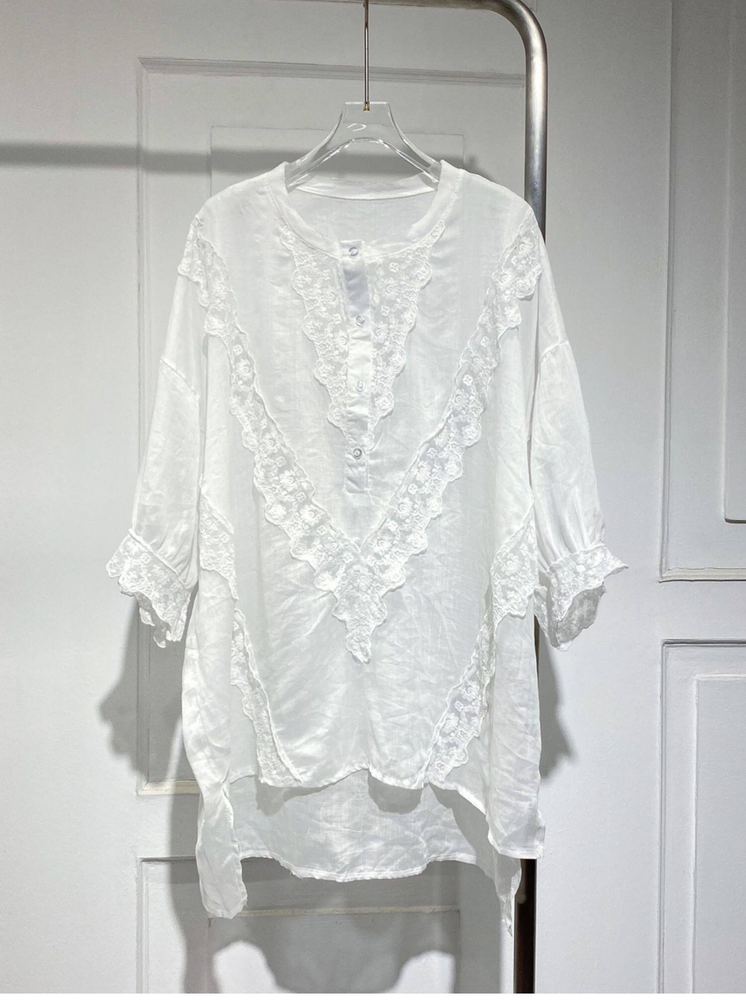 Длинная кружевная летняя рубашка с круглым воротником, средней длины, короткий рукав