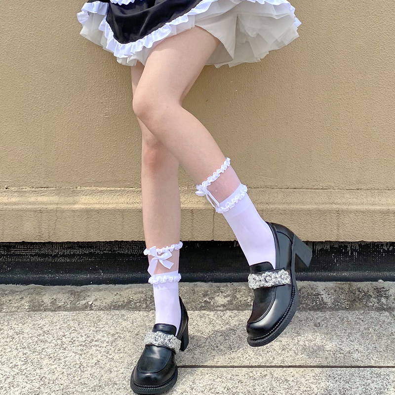 Японские белые кружевные летние тонкие носки с бантиком, стиль Лолита, средней длины, кружевное платье