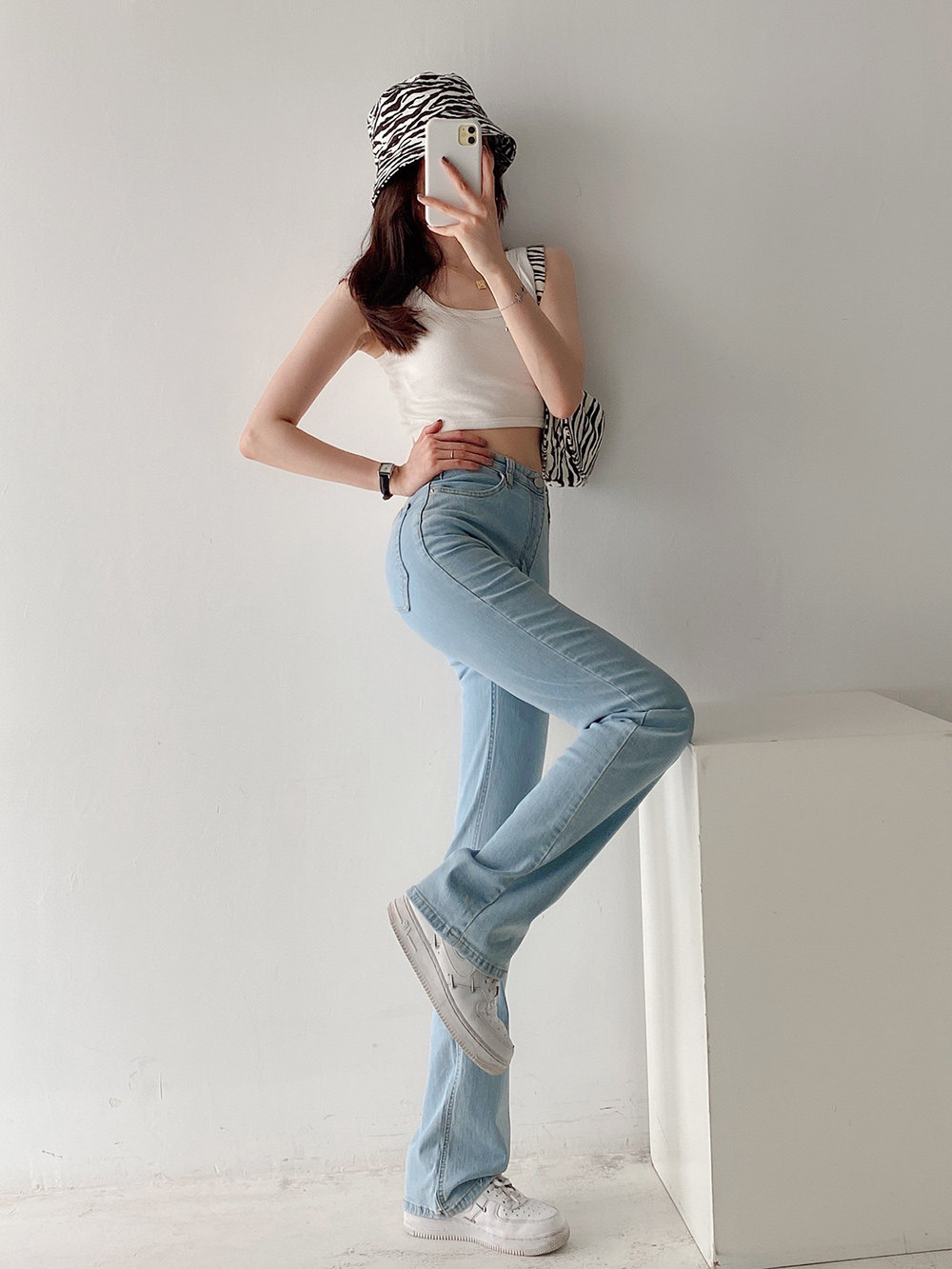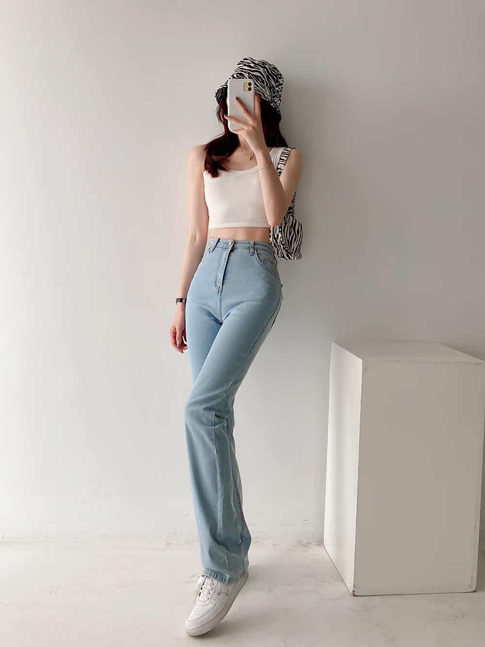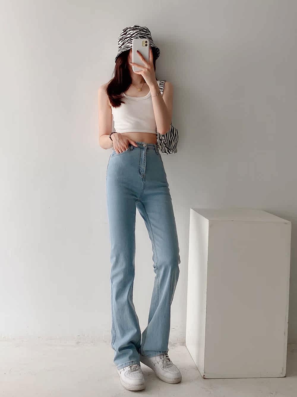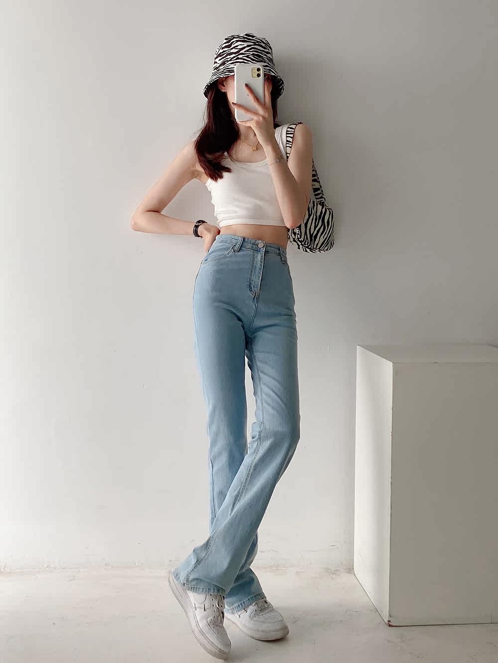 Эластичные приталенные длинные джинсовые штаны для отдыха, свободный прямой крой, высокая талия, с акцентом на бедрах