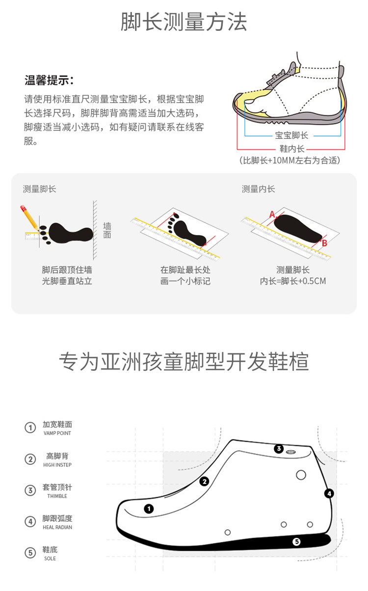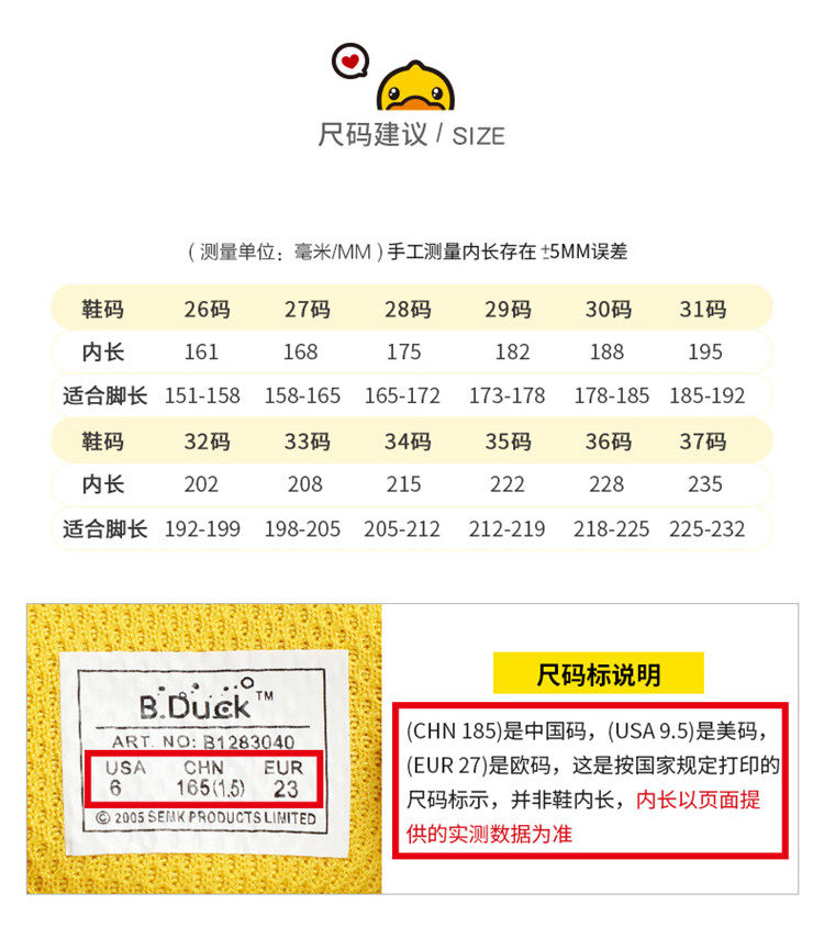 | Размер обуви: | [26码/内长16.1cm], [27码/内长16.8cm], [28码/内长17.5cm], [29码/内长18.2cm], [30码/内长18.8cm], [31码/内长19.5cm], [32码/内长20.2cm], [33码/内长20.8cm], [34码/内长21.5cm], [35码/内长22.2cm], [37码/内长23.5cm] |