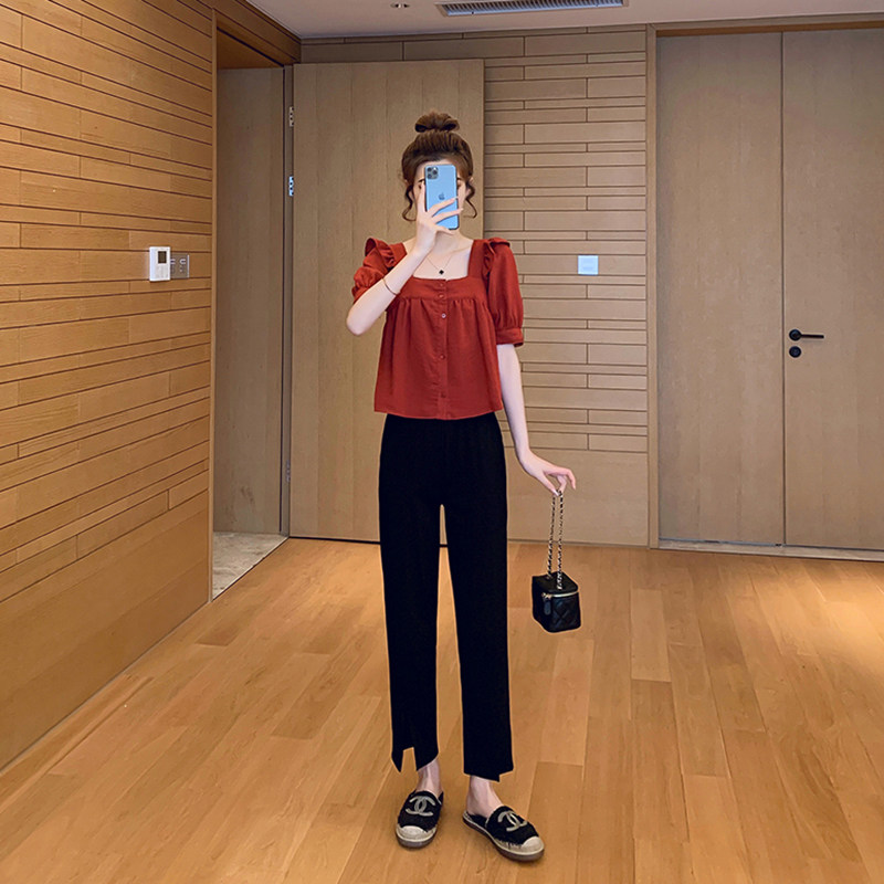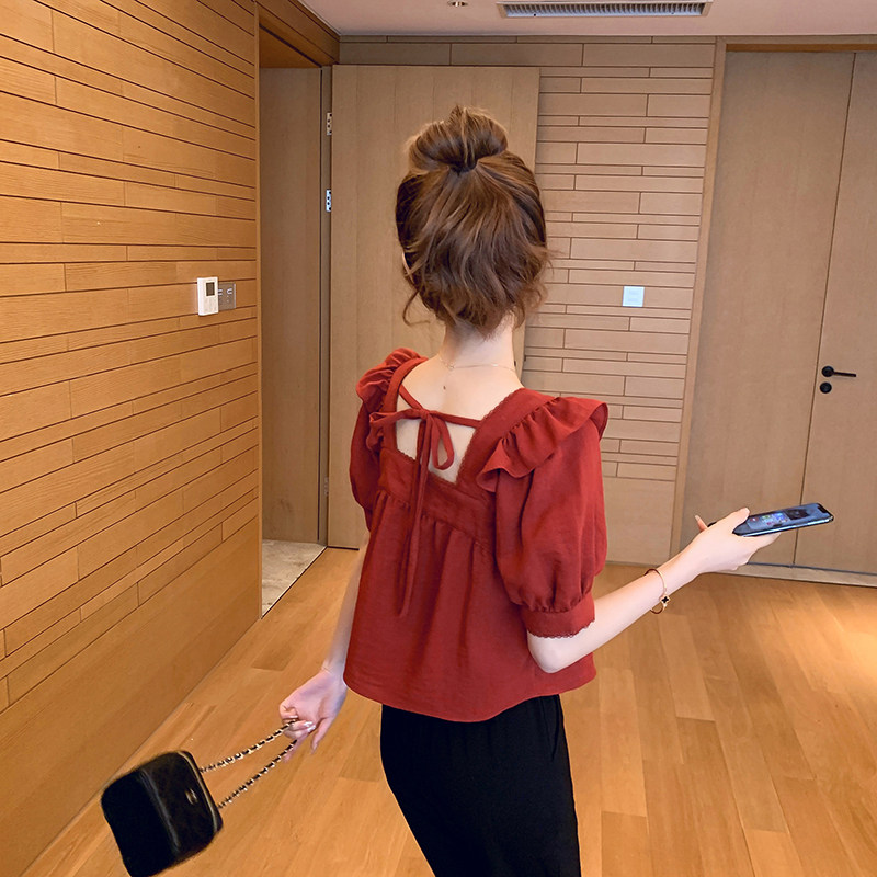 Тонкая дизайнерская рубашка, квадратный вырез, рукава фонарики, короткий рукав, тренд сезона, французский стиль, яркий броский стиль