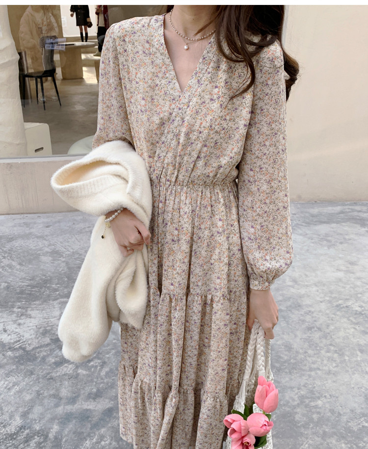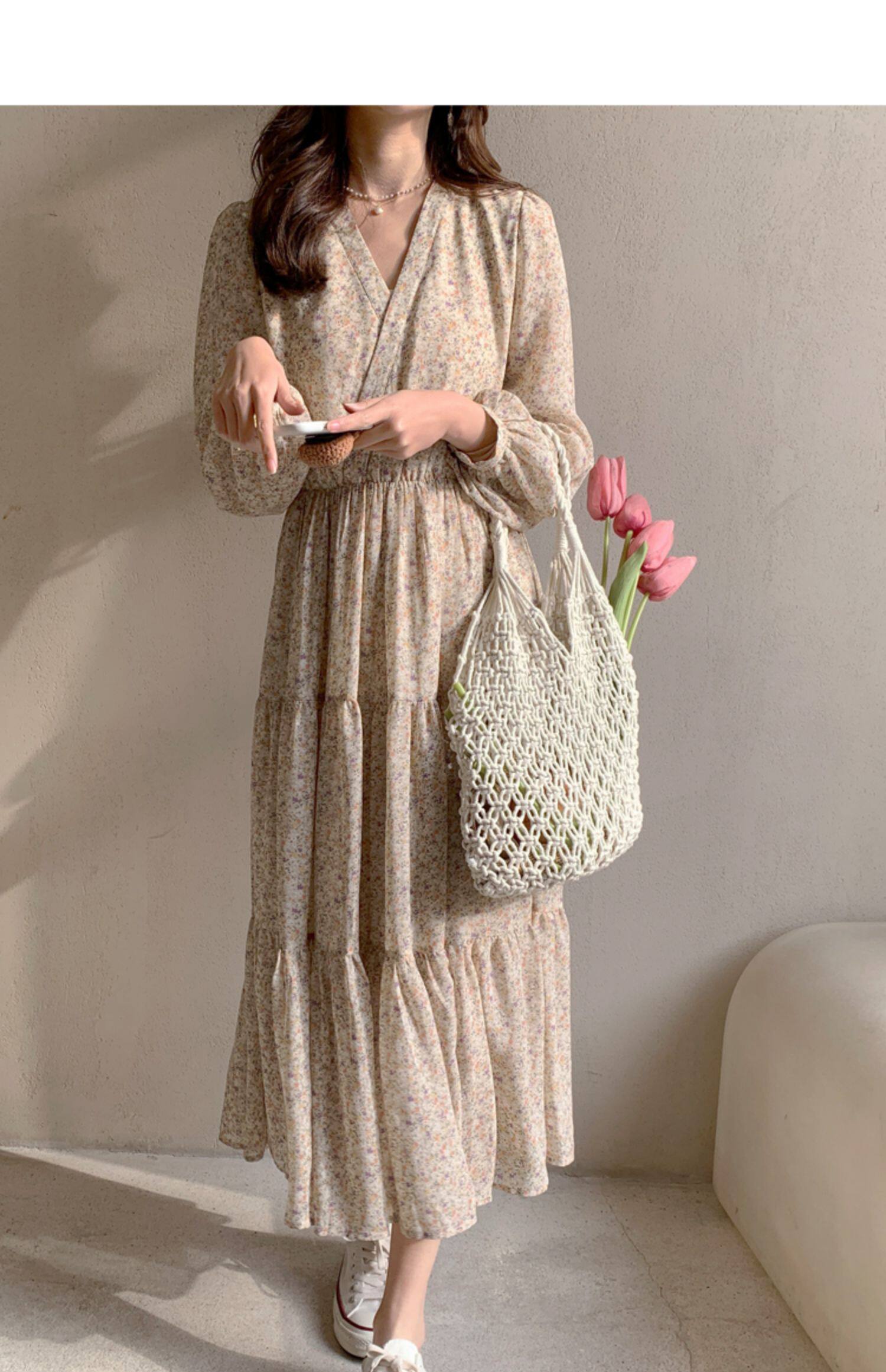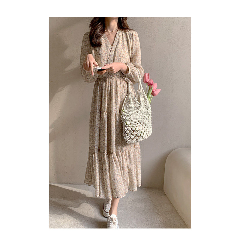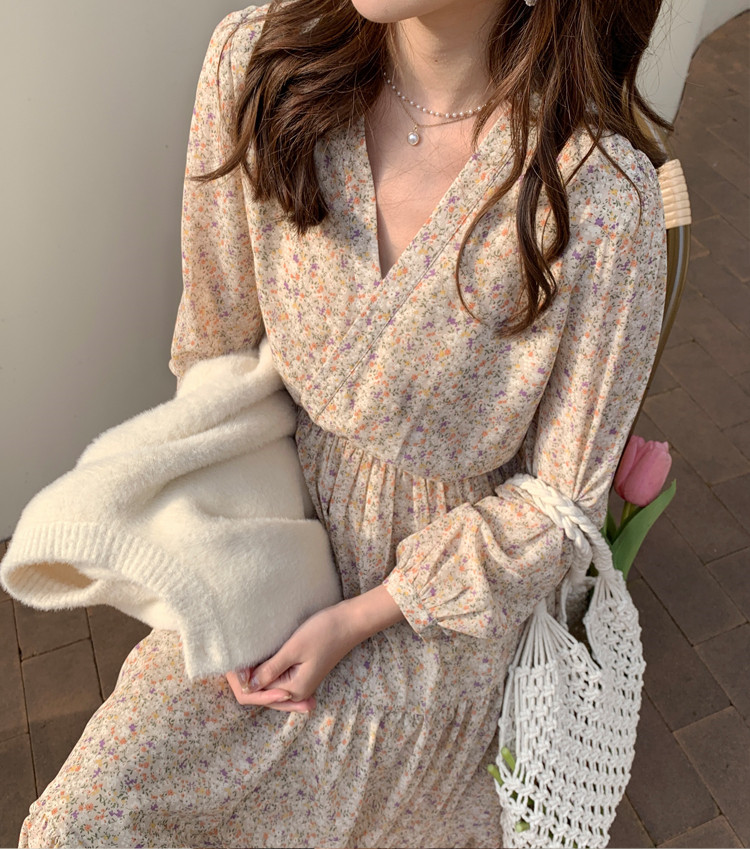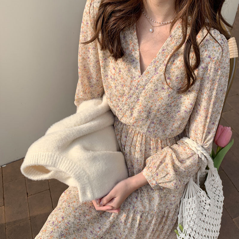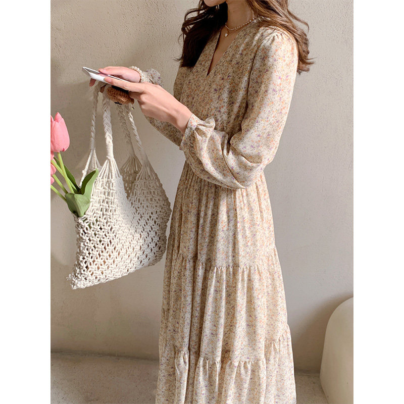 Шифоновый лонгслив, приталенное платье, корсет, осенняя длинная юбка, подходит для подростков, французский стиль, цветочный принт, V-образный вырез