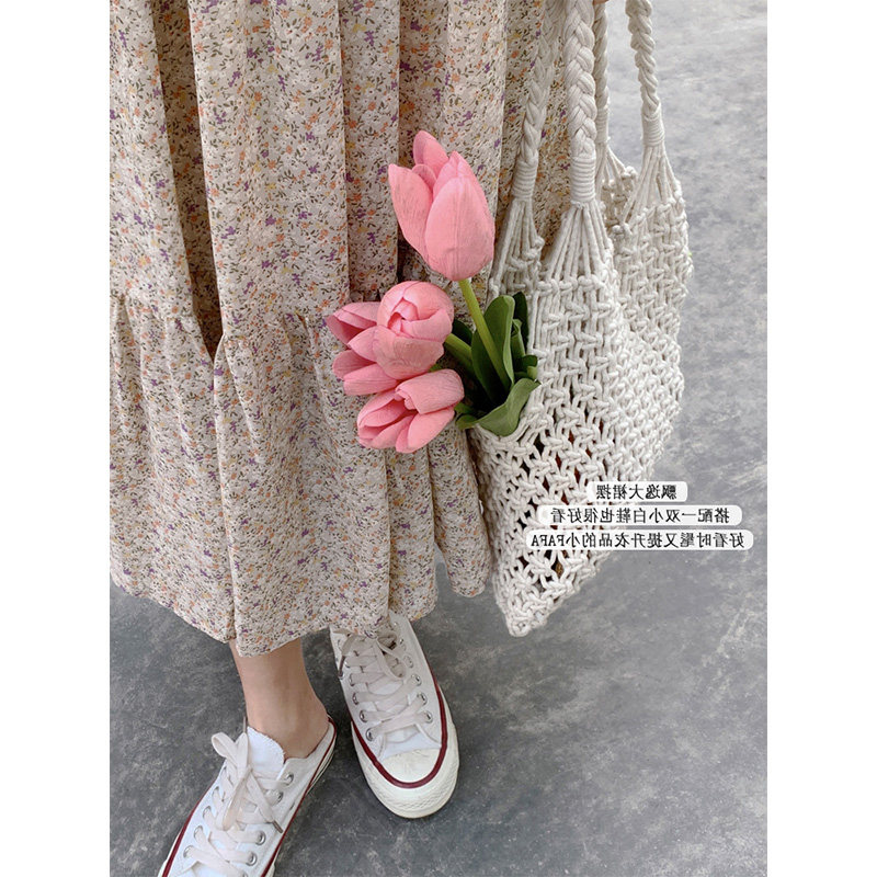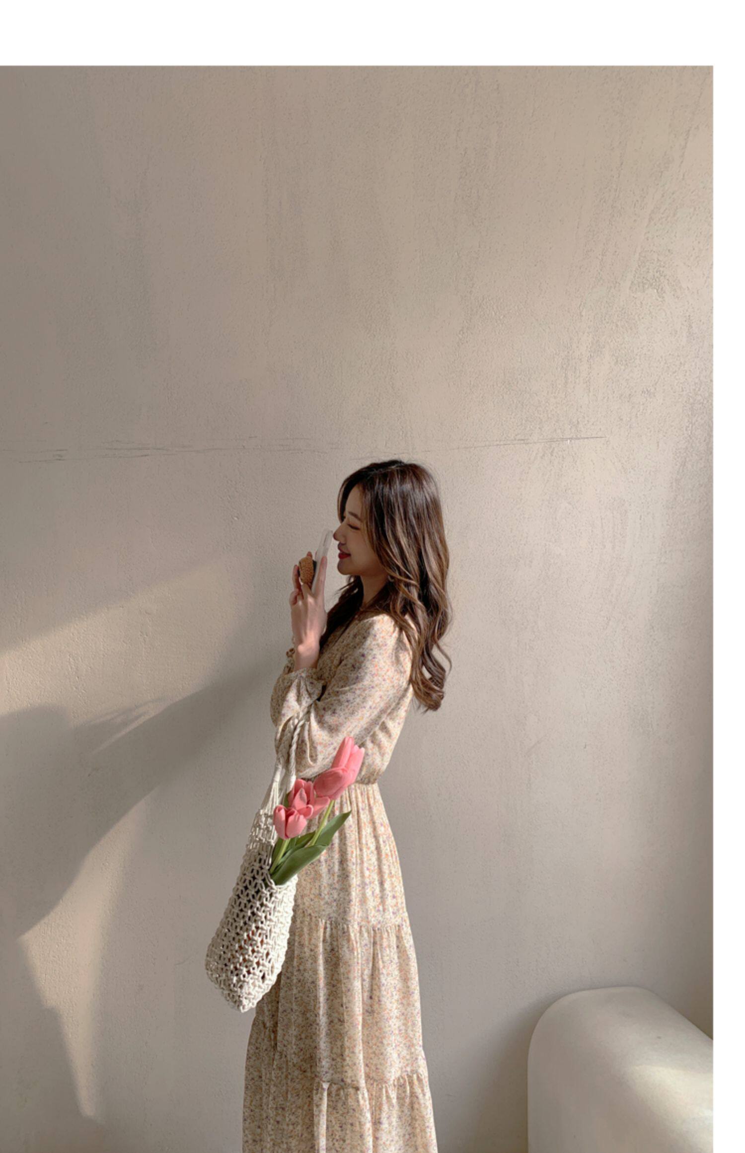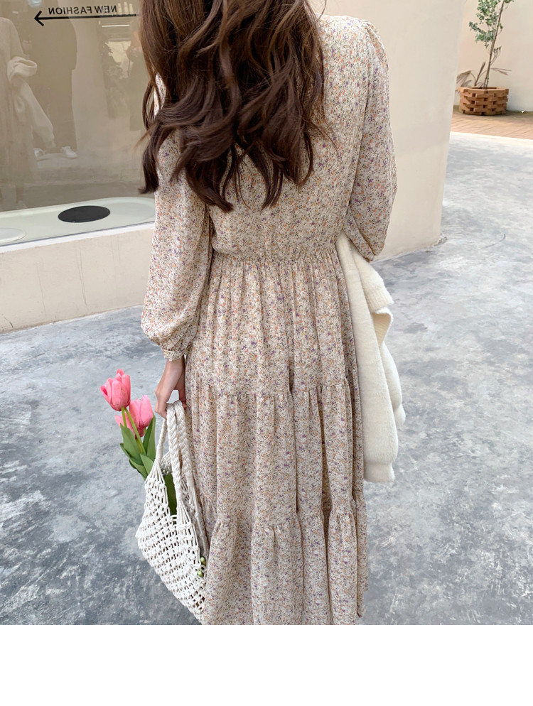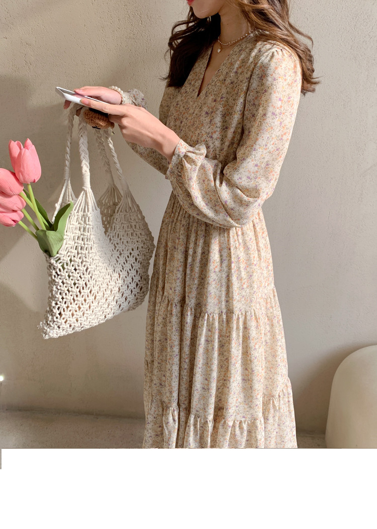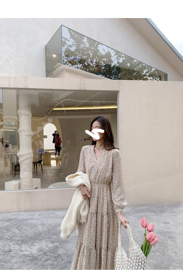 Шифоновый лонгслив, приталенное платье, корсет, осенняя длинная юбка, подходит для подростков, французский стиль, цветочный принт, V-образный вырез