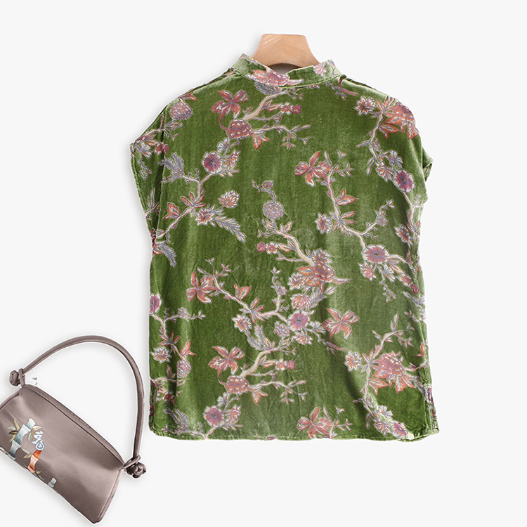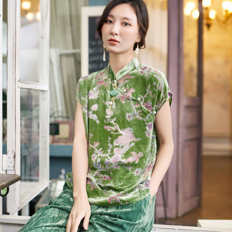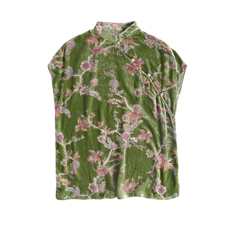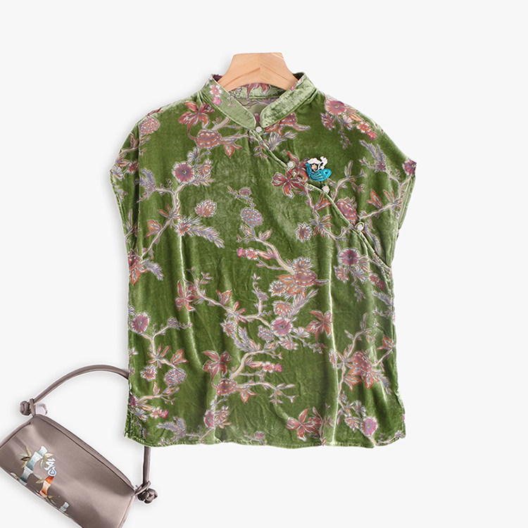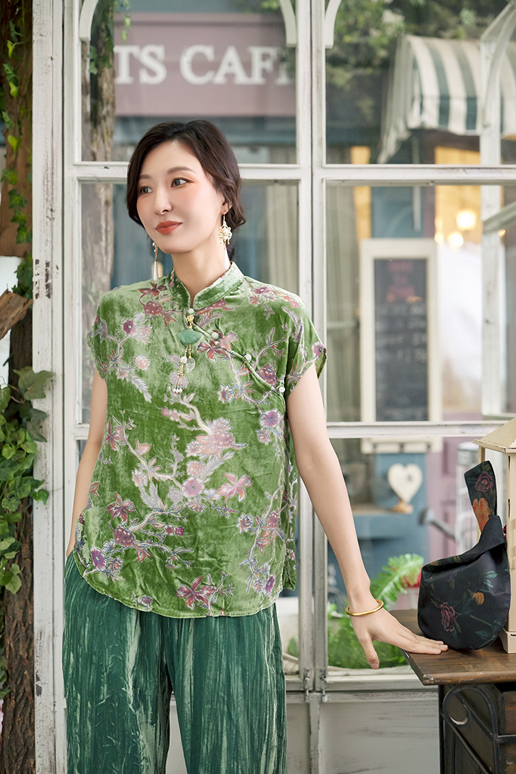 Шелковая бархатная ретро летняя футболка, тонкое плетение, китайский стиль, короткий рукав