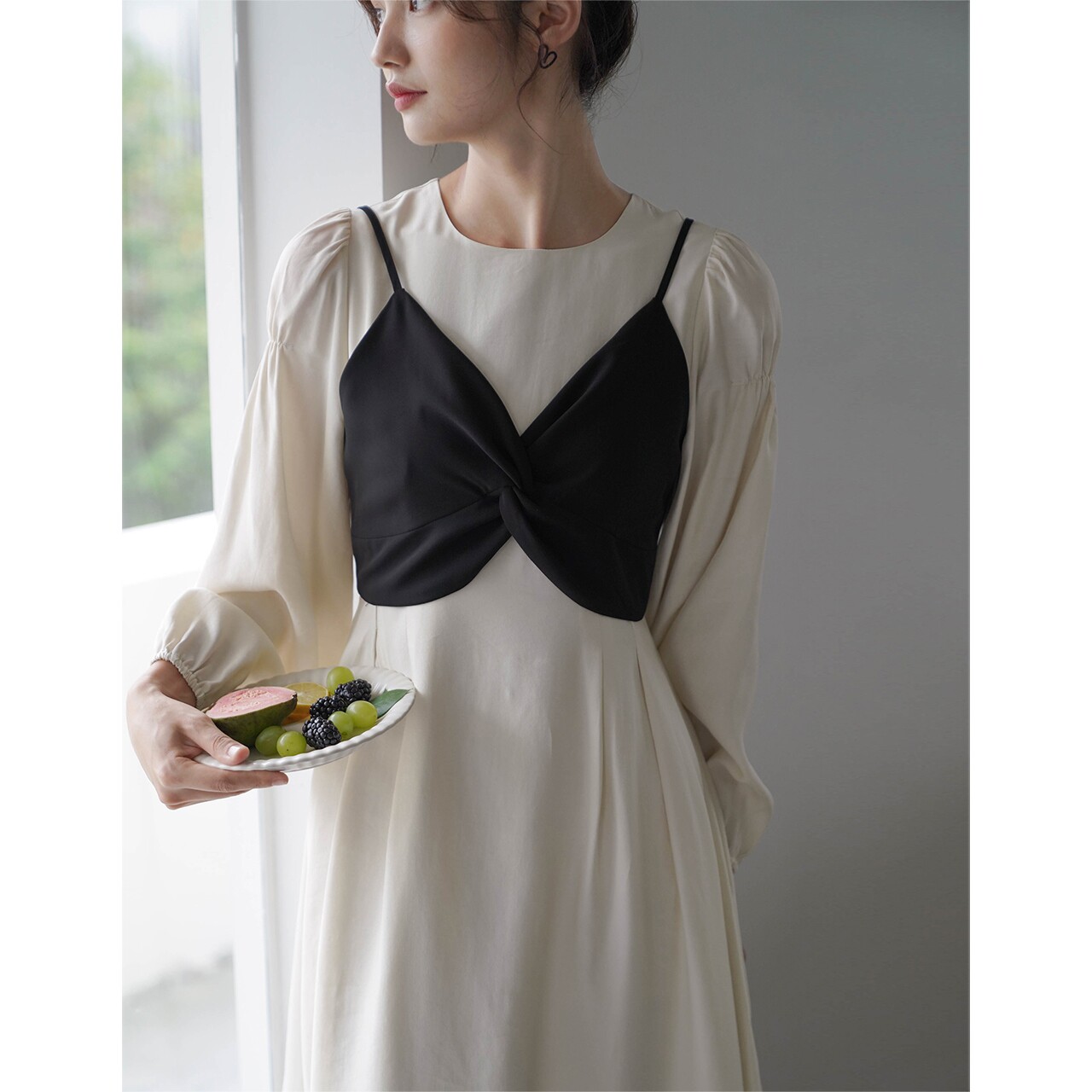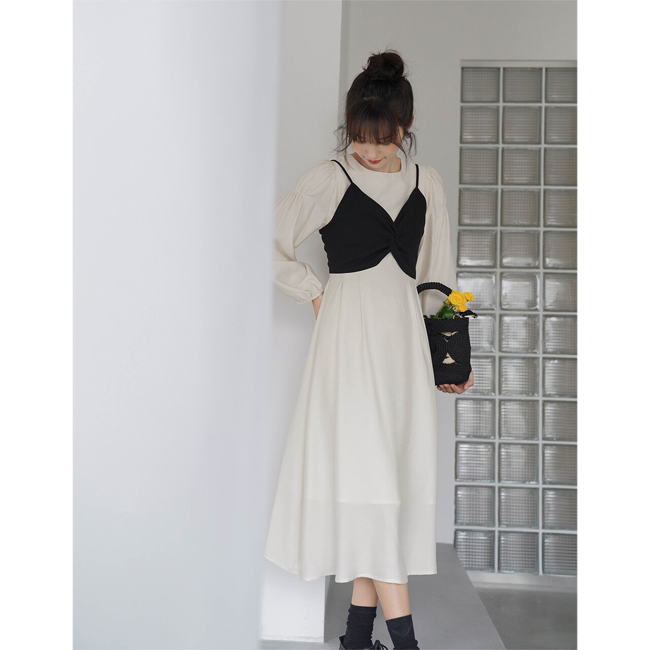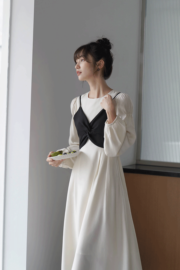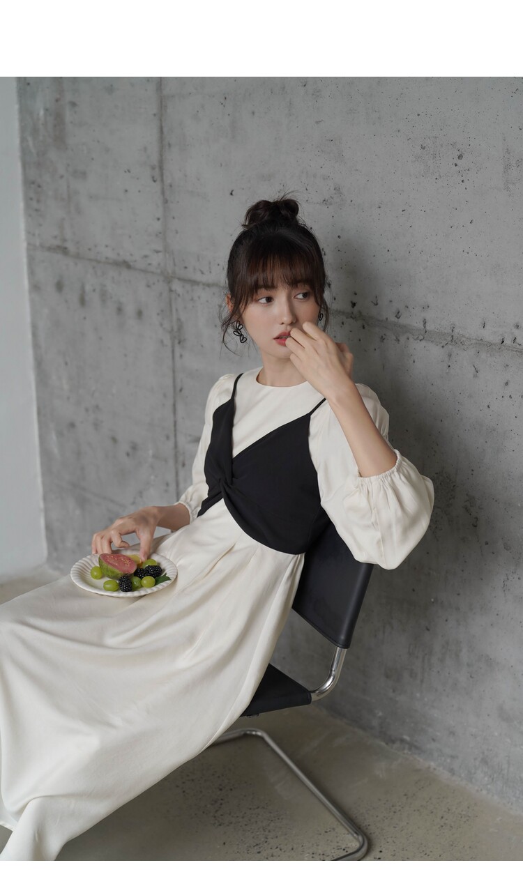 Платье с круглым воротником, комплект, весенняя длинная юбка, рукава фонарики, коллекция 2022, простой и элегантный дизайн, высокая талия