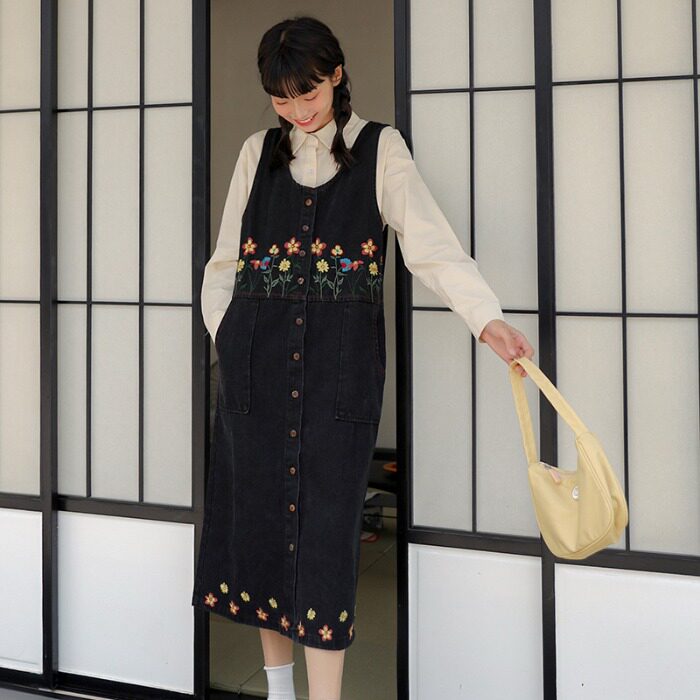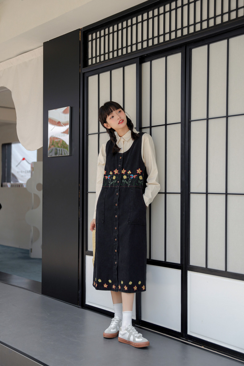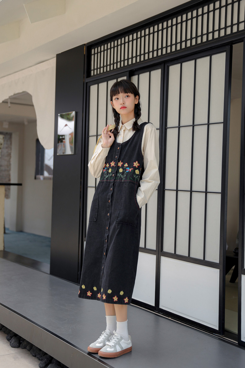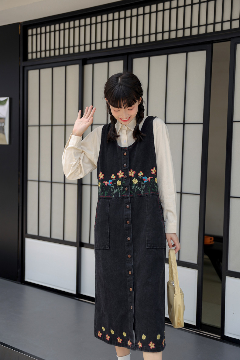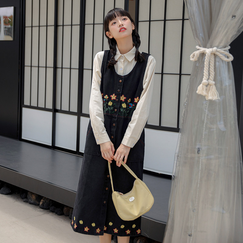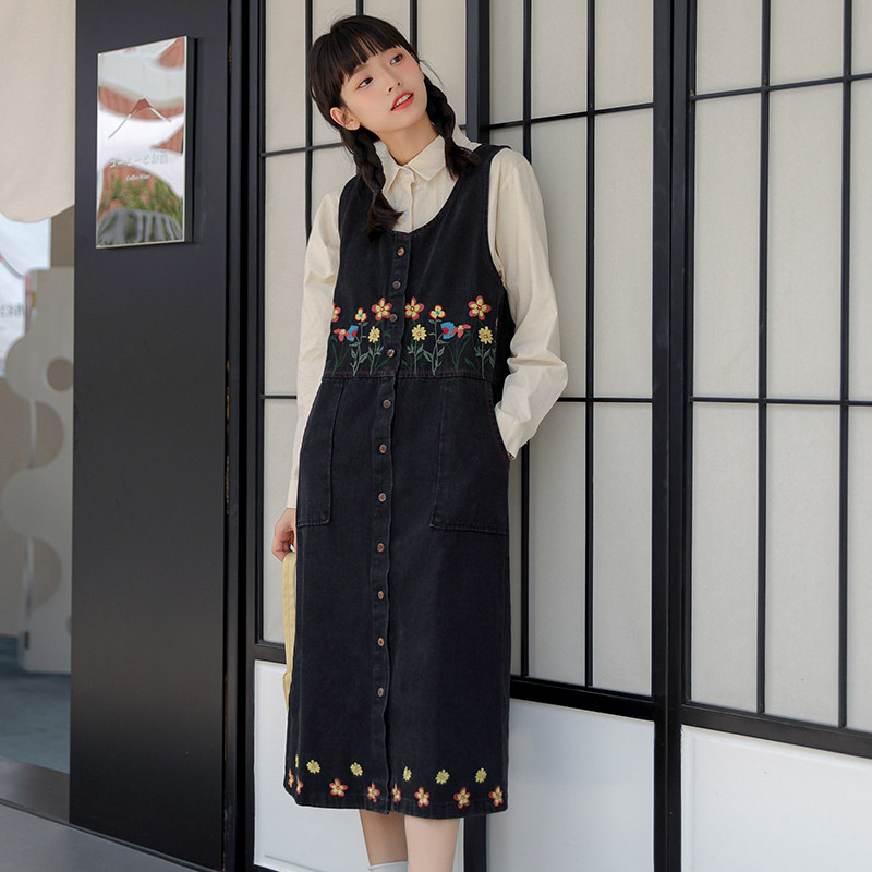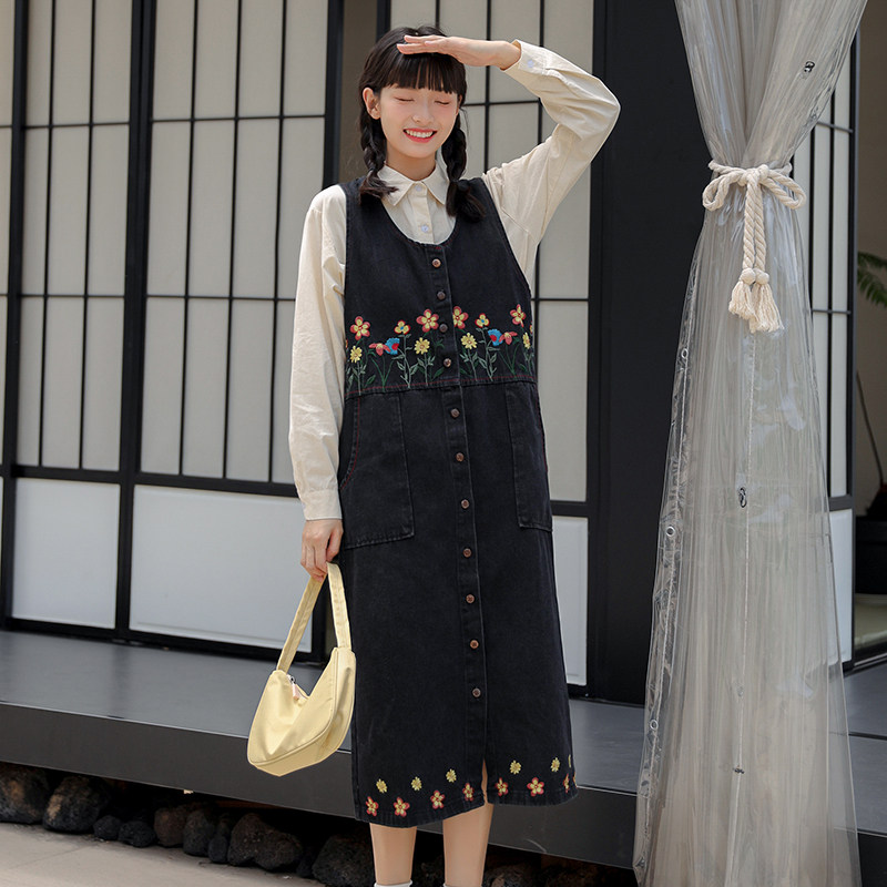 Черный жилет, осенний джинсовый сарафан, юбка, японское брендовое платье, с вышивкой, свободный крой, А-силуэт, длина макси