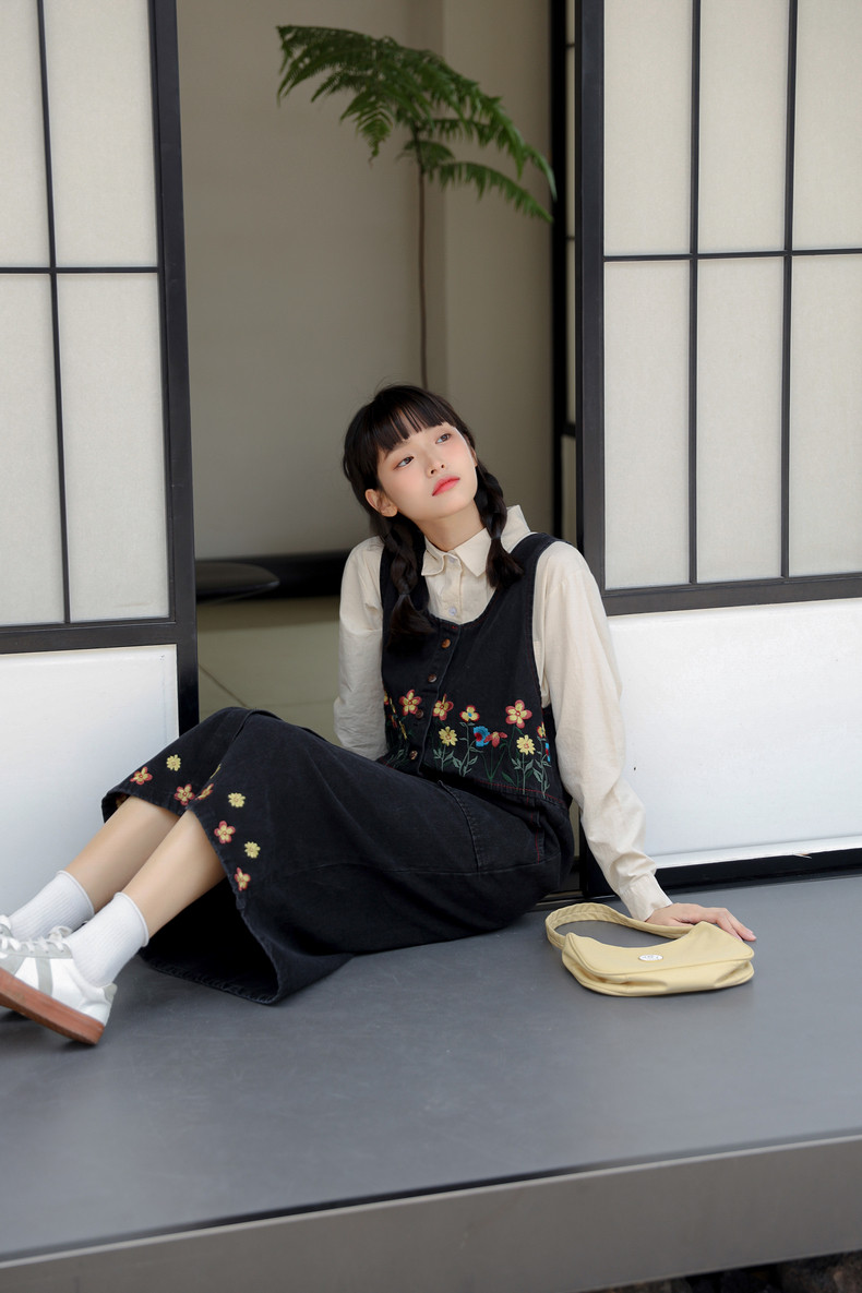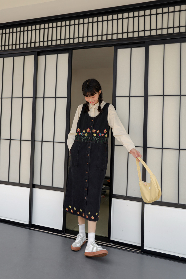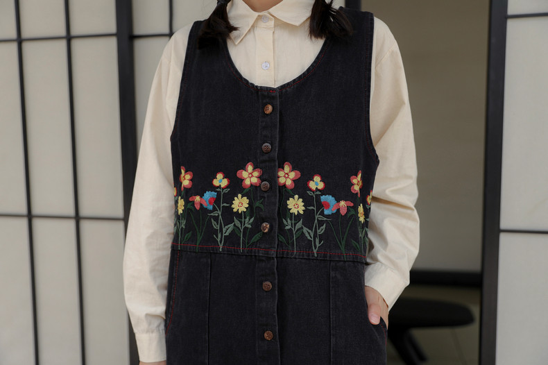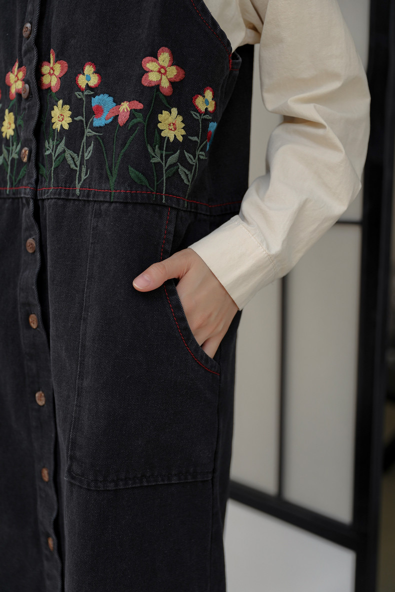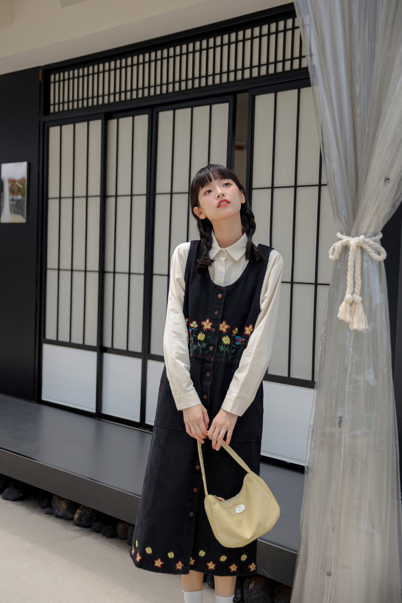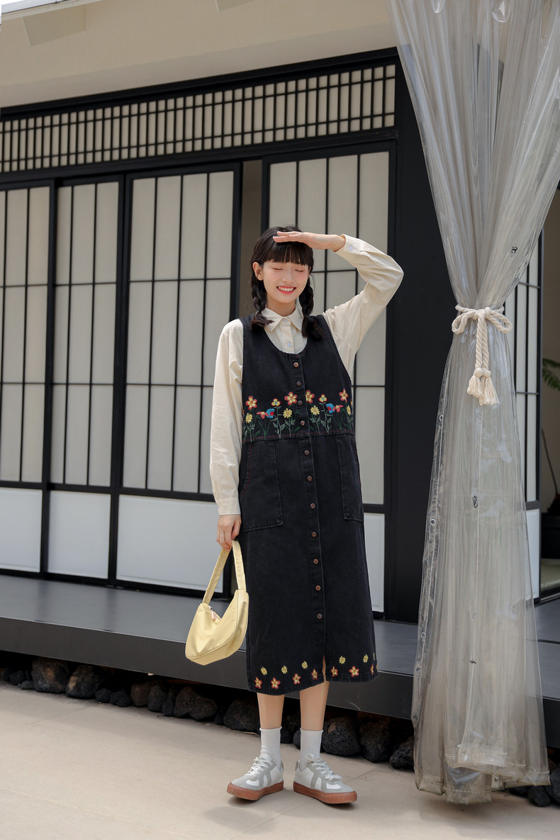 Черный жилет, осенний джинсовый сарафан, юбка, японское брендовое платье, с вышивкой, свободный крой, А-силуэт, длина макси
