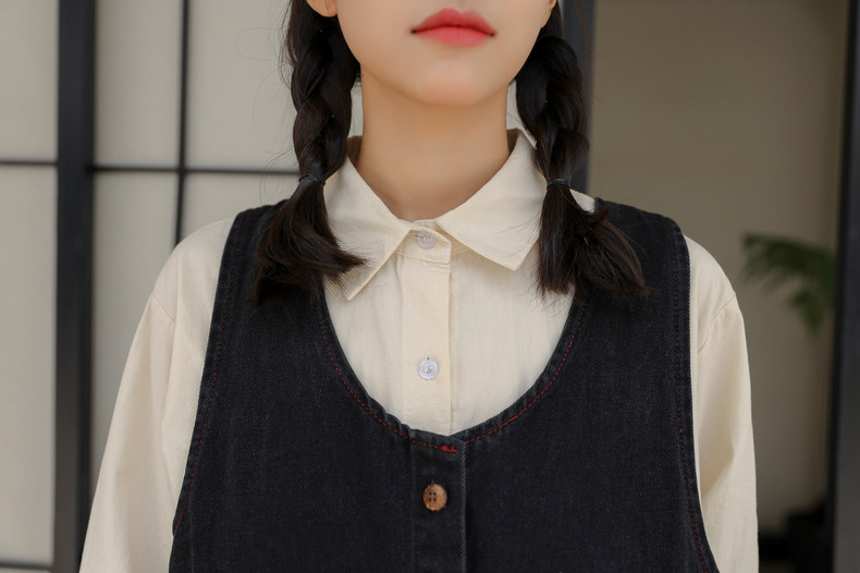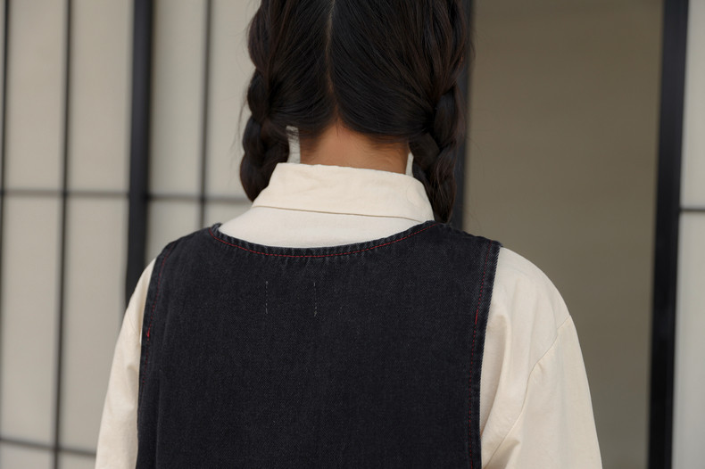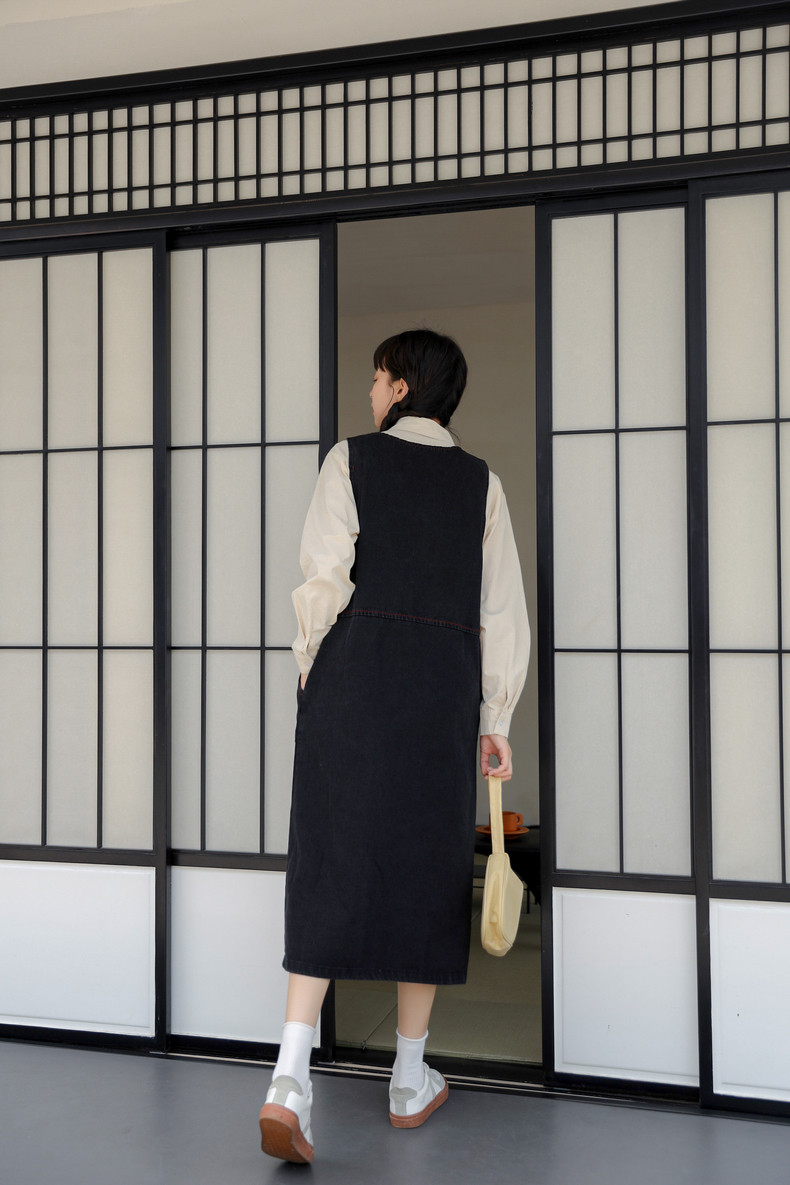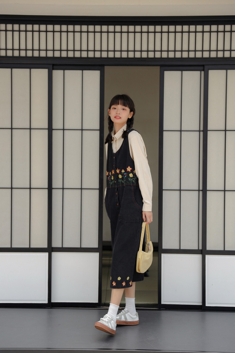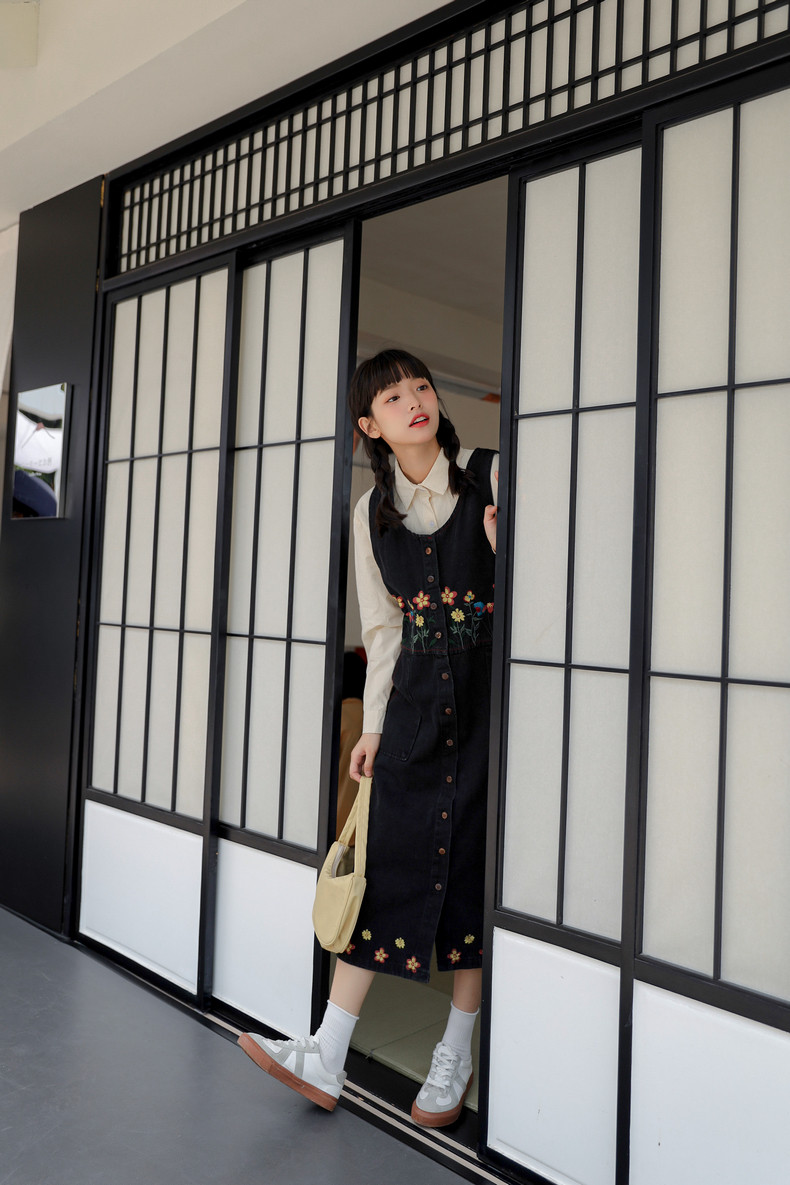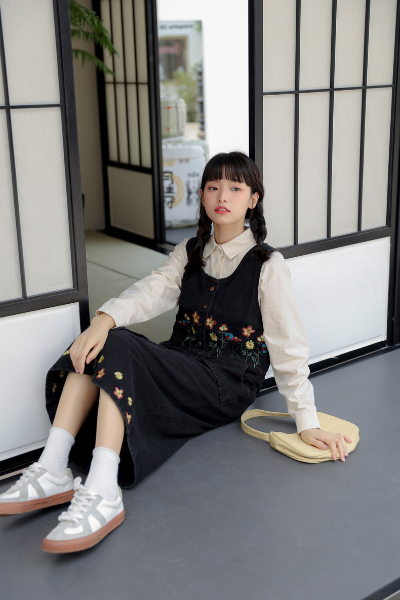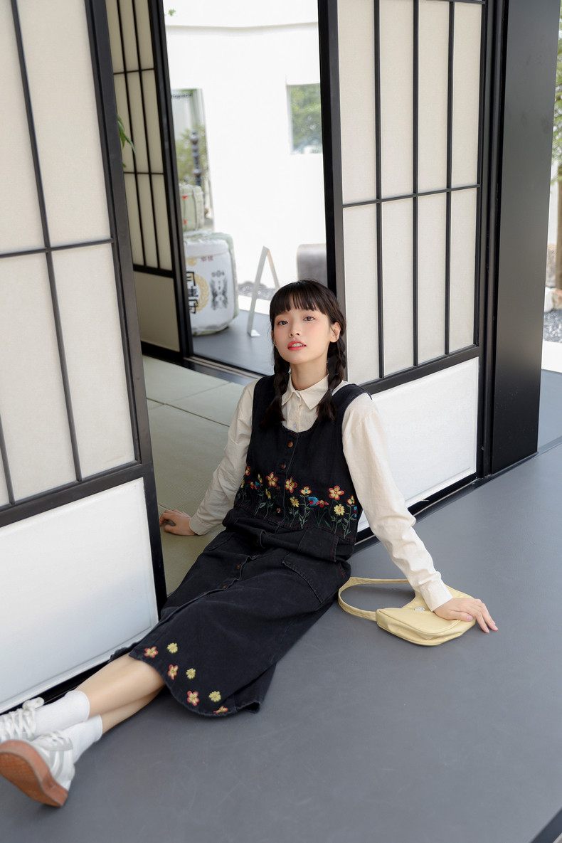 Черный жилет, осенний джинсовый сарафан, юбка, японское брендовое платье, с вышивкой, свободный крой, А-силуэт, длина макси
