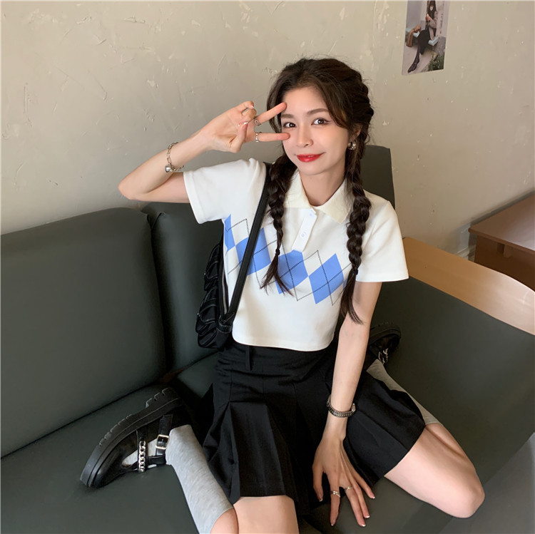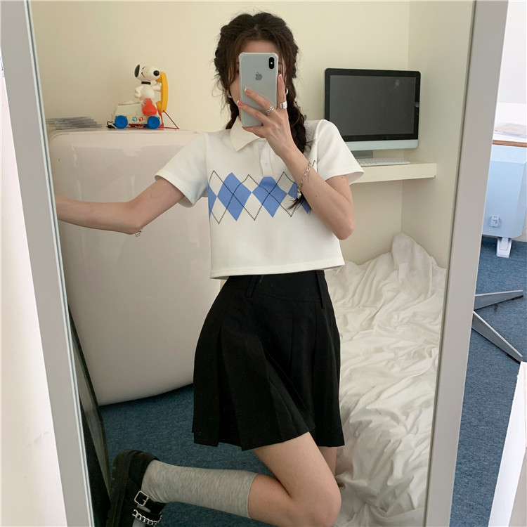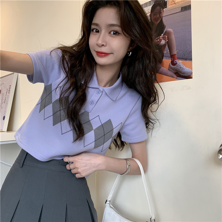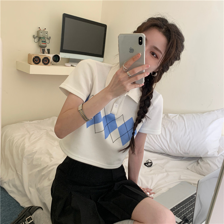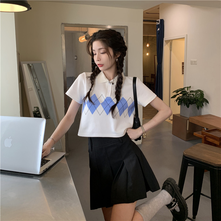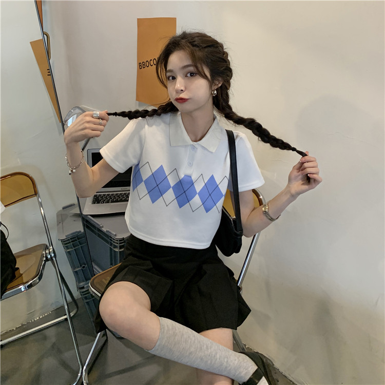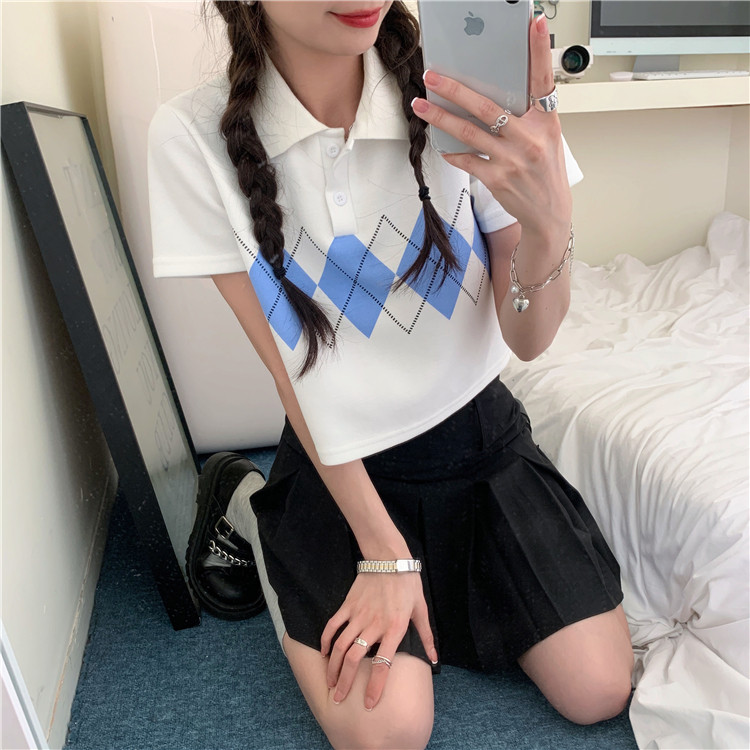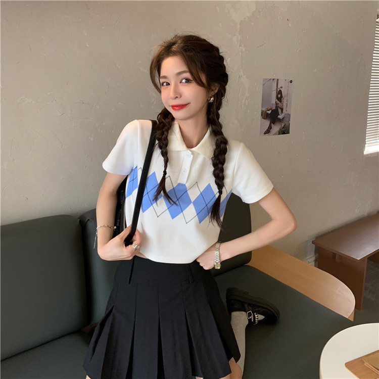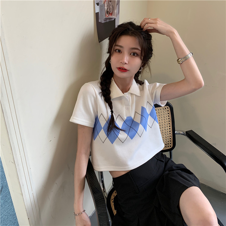 Tide, летняя ретро короткая дизайнерская футболка с коротким рукавом с ромбовидным узором, тренд сезона, воротник поло