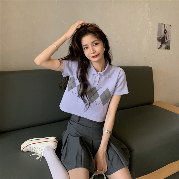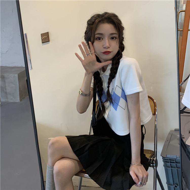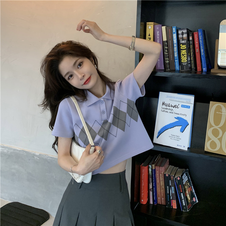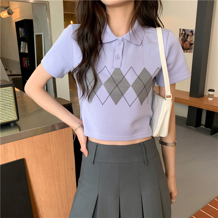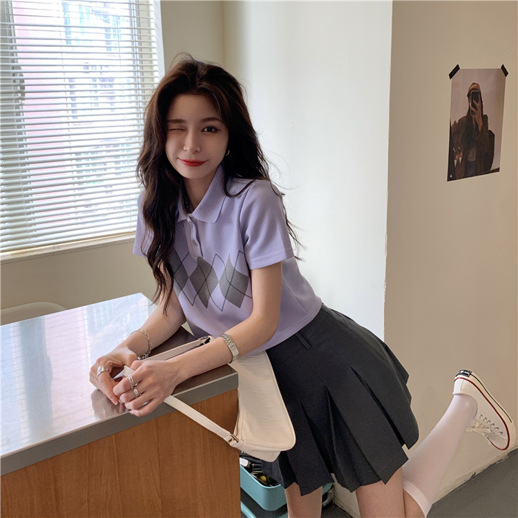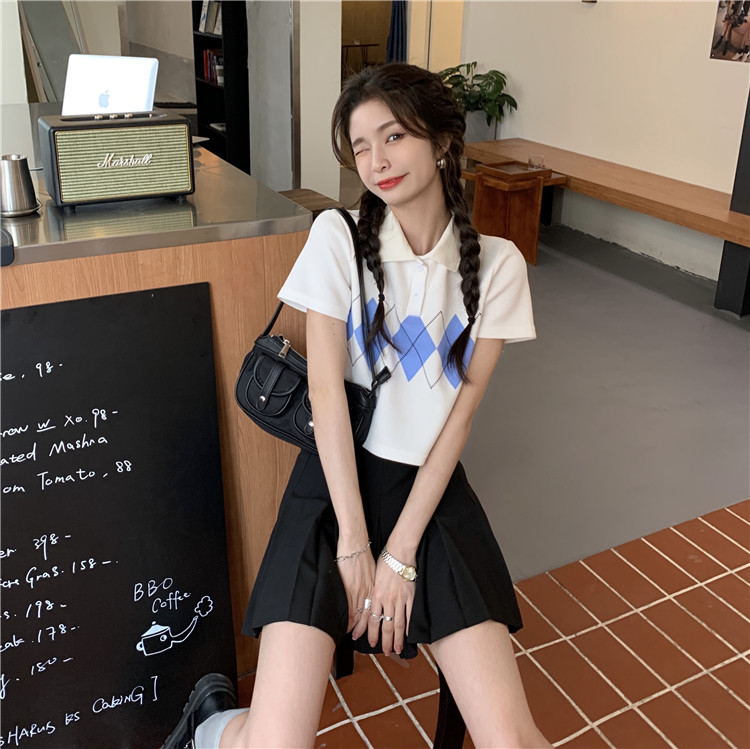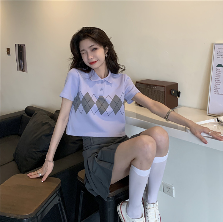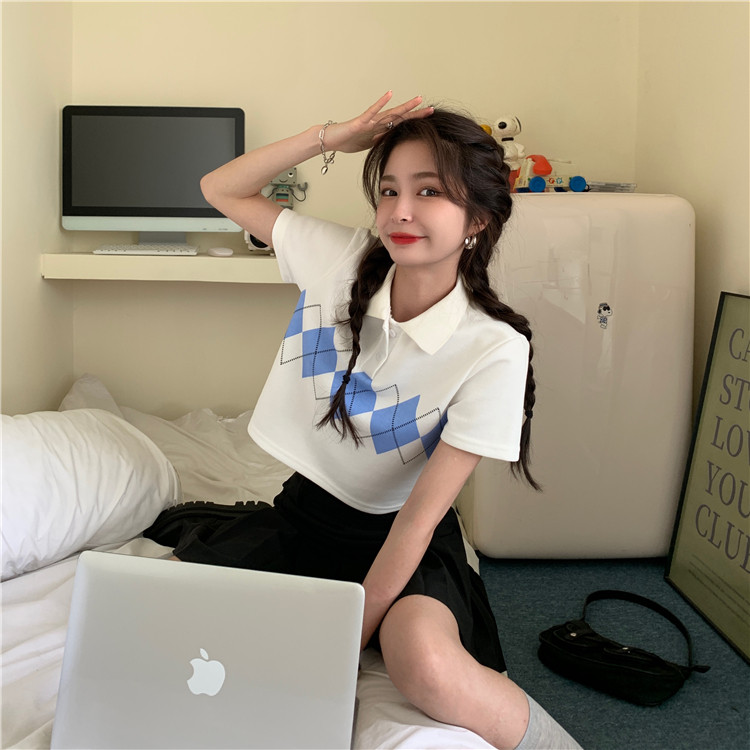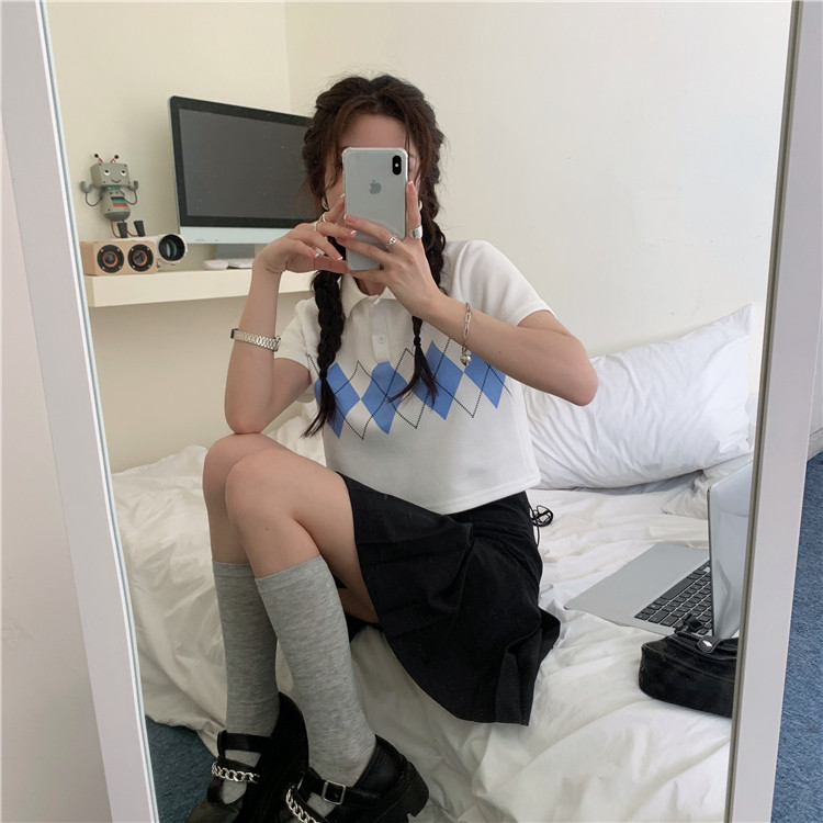Tide, летняя ретро короткая дизайнерская футболка с коротким рукавом с ромбовидным узором, тренд сезона, воротник поло