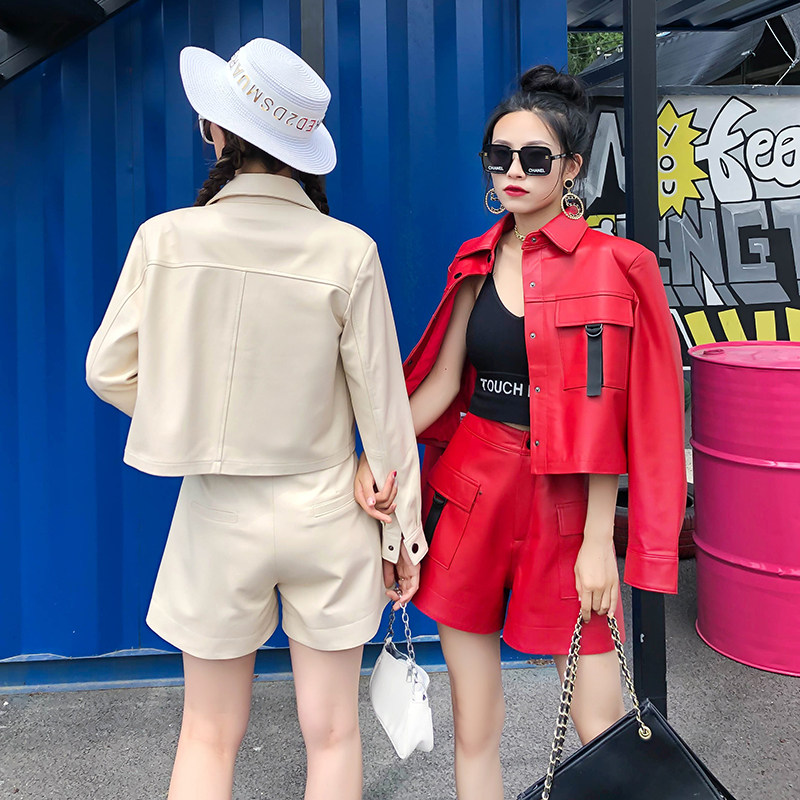 Штаны, демисезонный комплект, куртка, шорты, из натуральной кожи, 2 предмета, А-силуэт, свободный крой