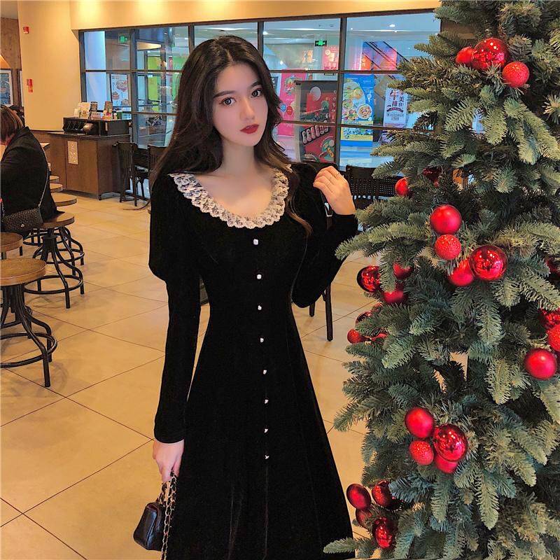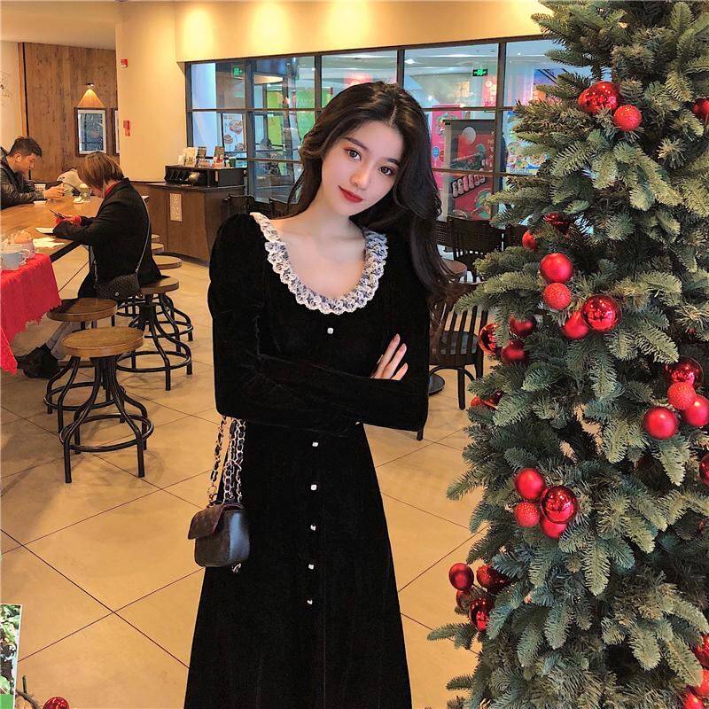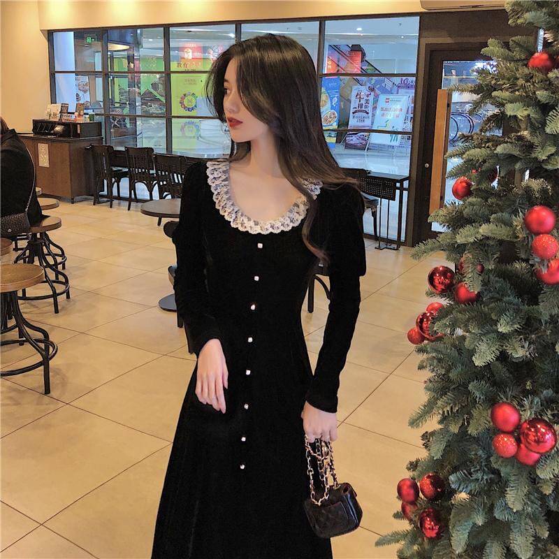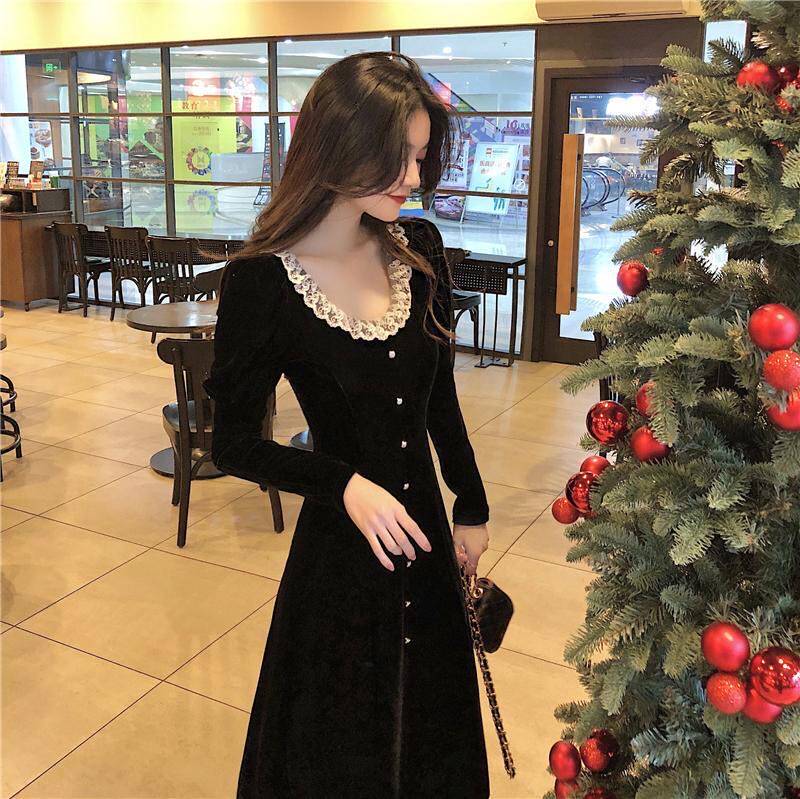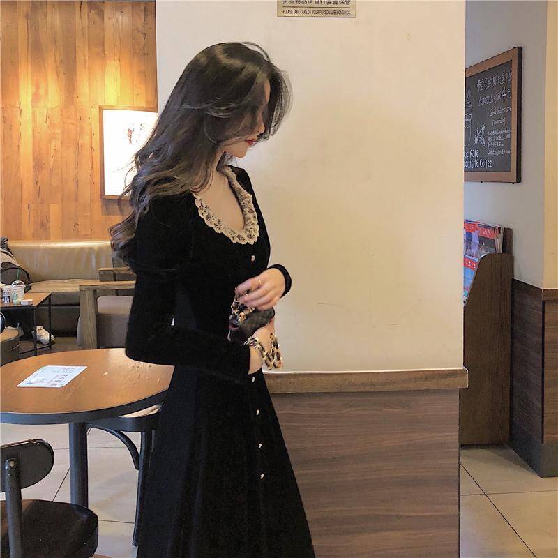 Кружевное платье, черный базовый лонгслив, ретро длинная юбка, кружевное платье, французский стиль, с акцентом на бедрах, средней длины, длина макси