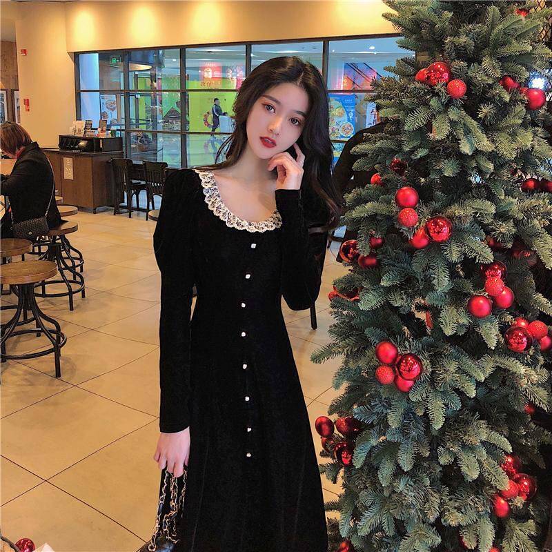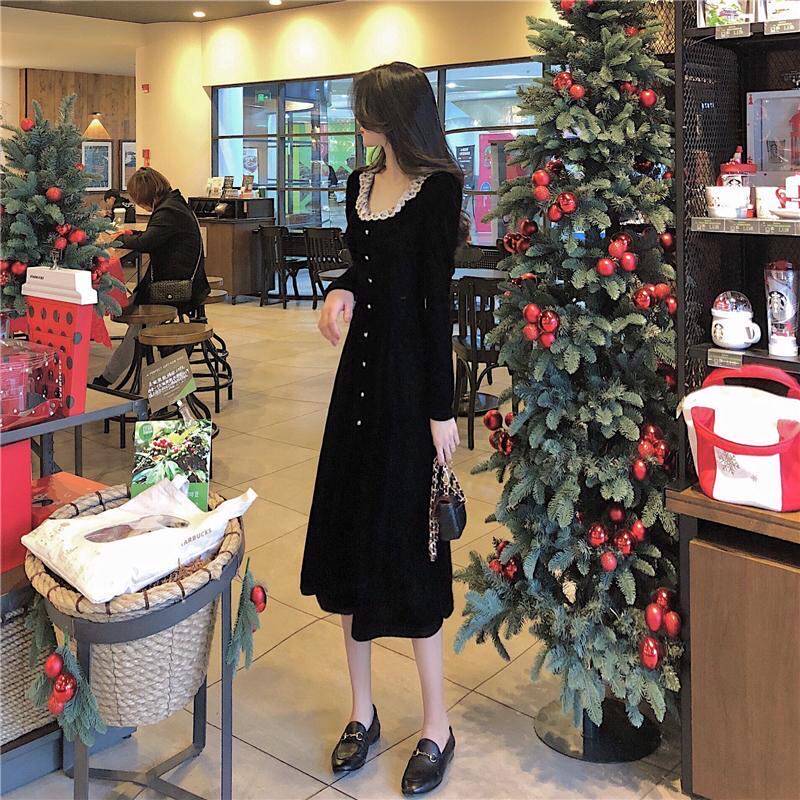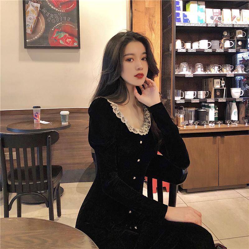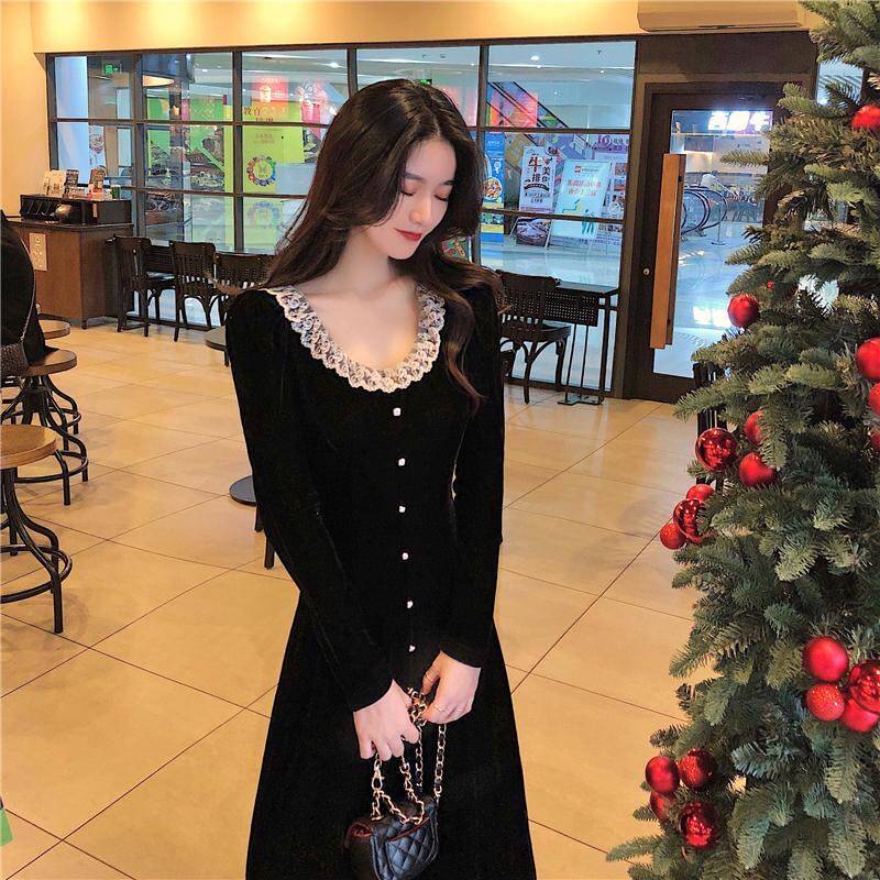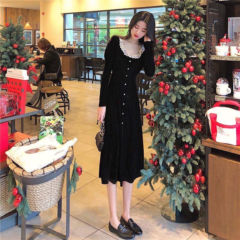 Кружевное платье, черный базовый лонгслив, ретро длинная юбка, кружевное платье, французский стиль, с акцентом на бедрах, средней длины, длина макси