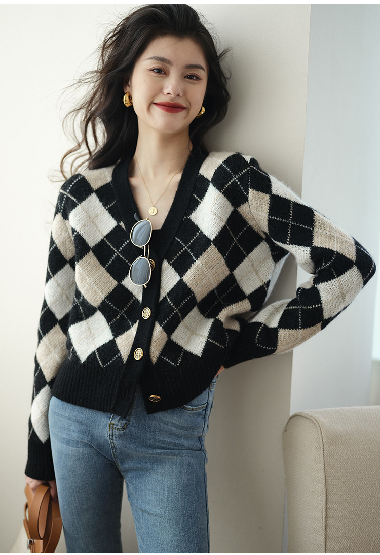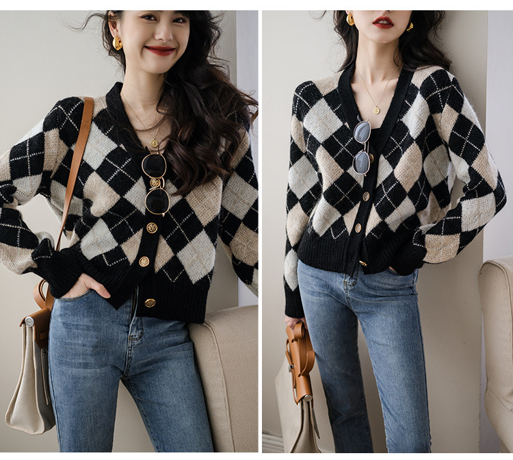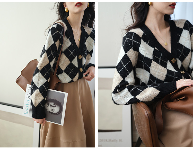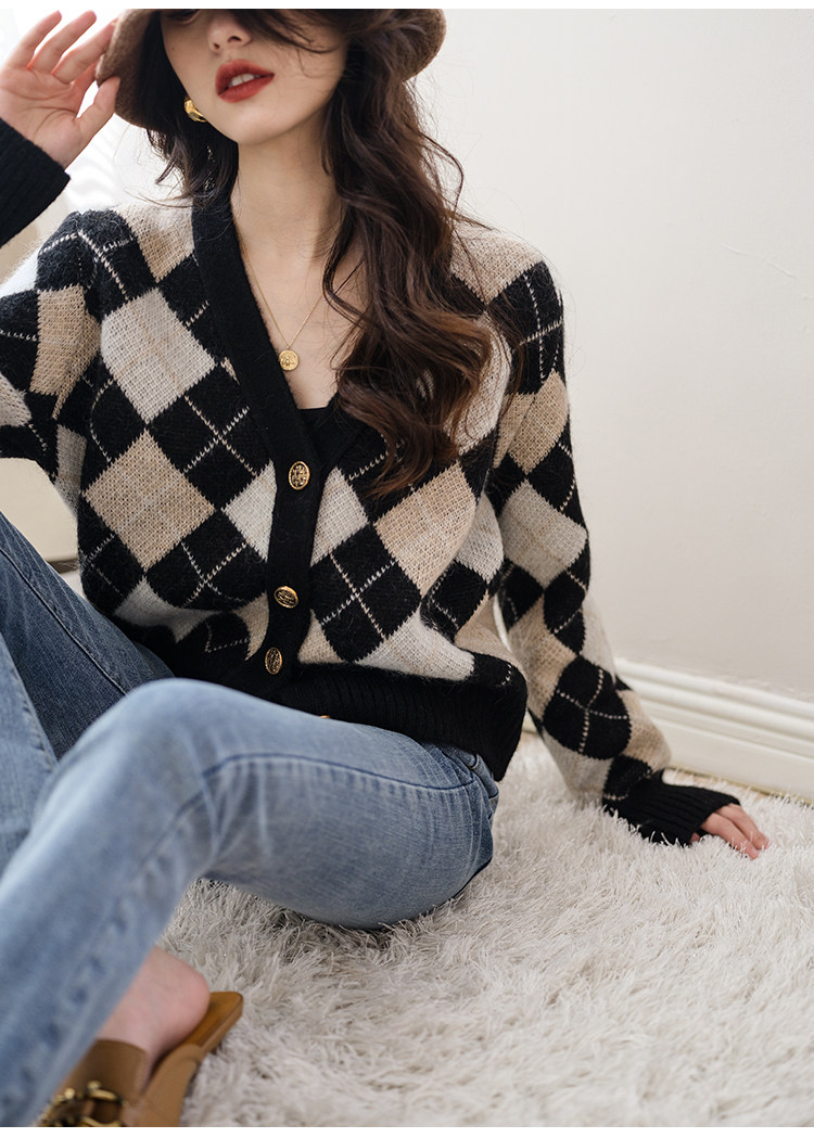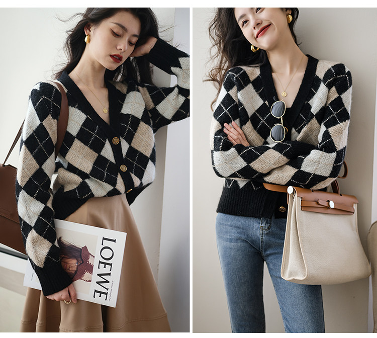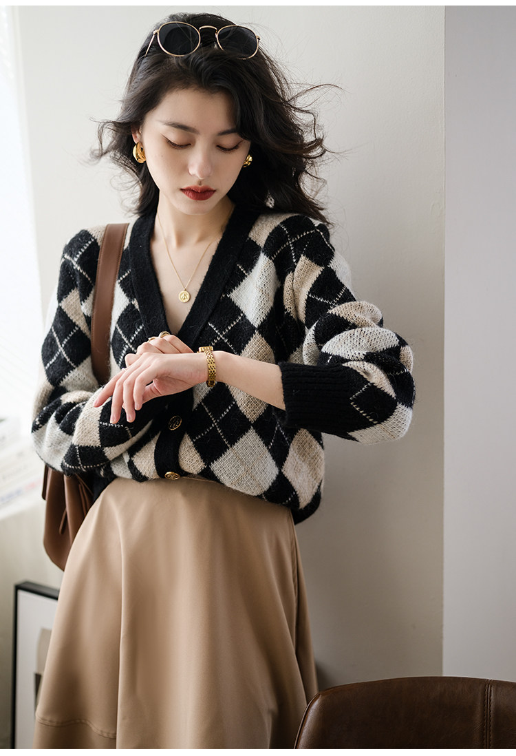Трикотажный кардиган, осенний шерстяной свитер с ромбовидным узором, коллекция 2021
