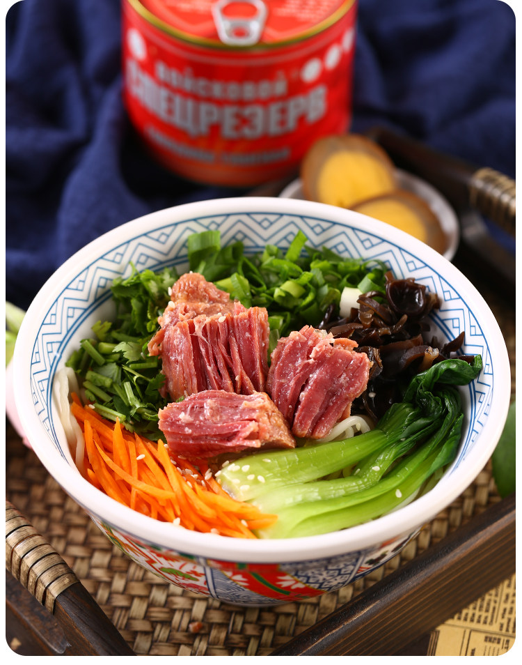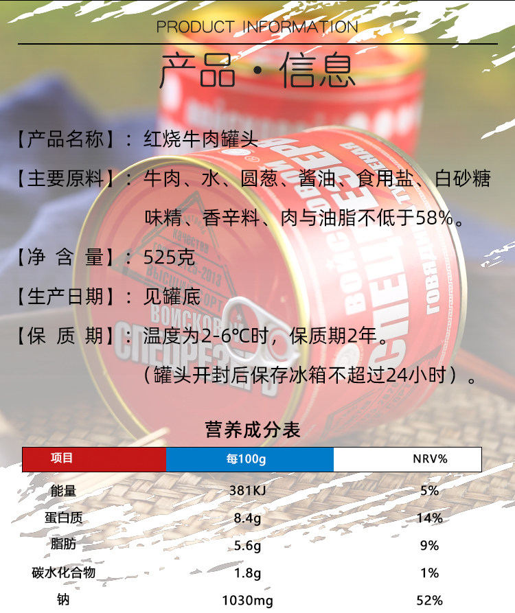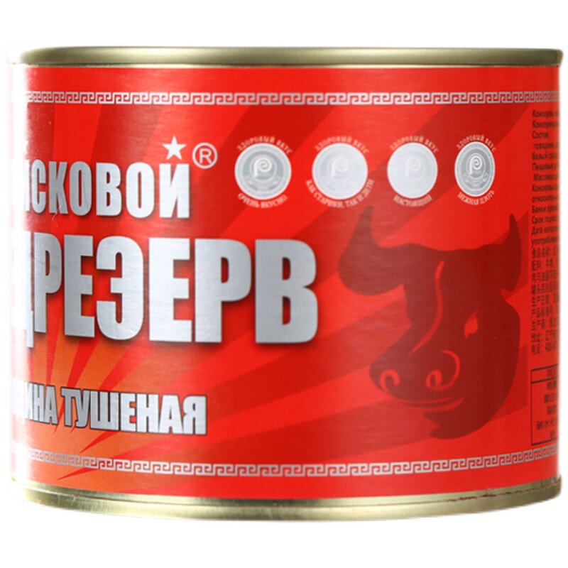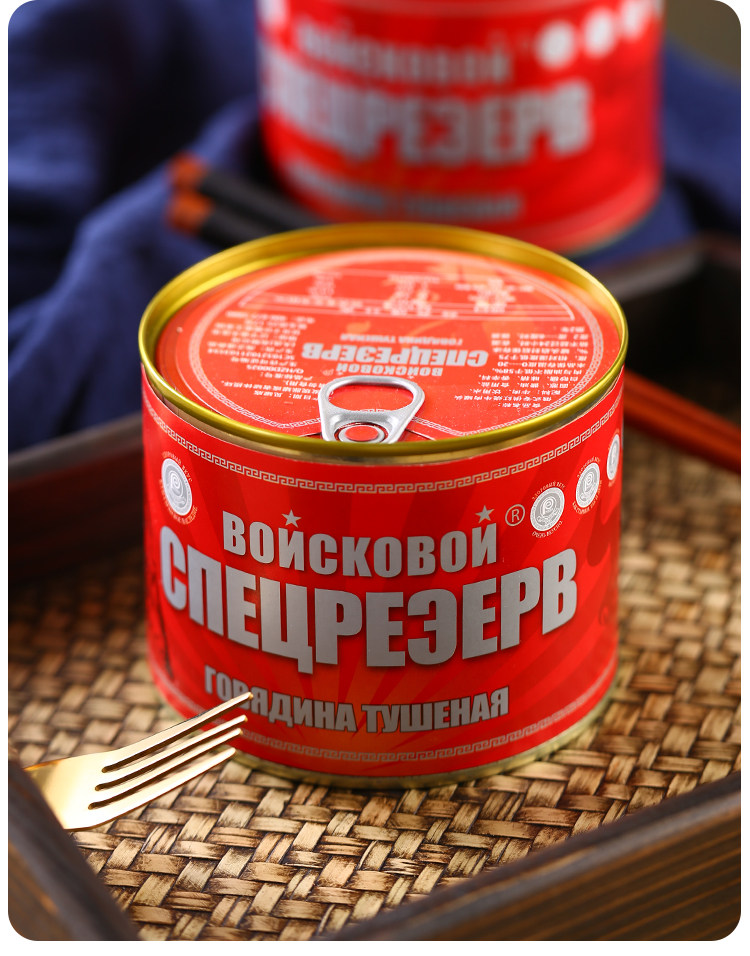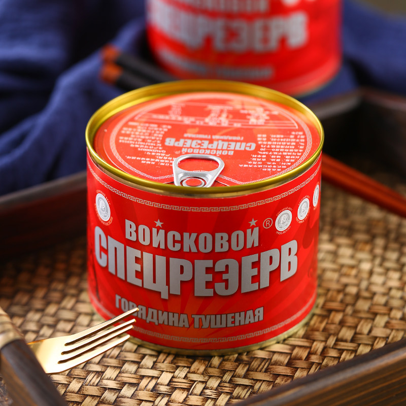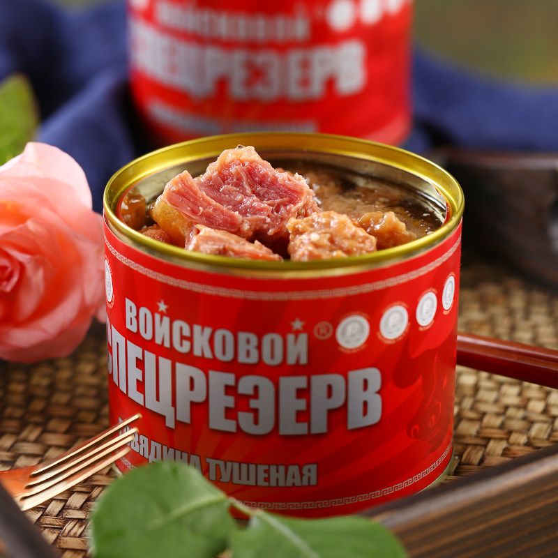Консервированная говядина русская аромат мгновенно есть большие кусочки красного жареного мяса без крахмала, фаст -фуда и овощей, приготовленная на еде 525 г пищи