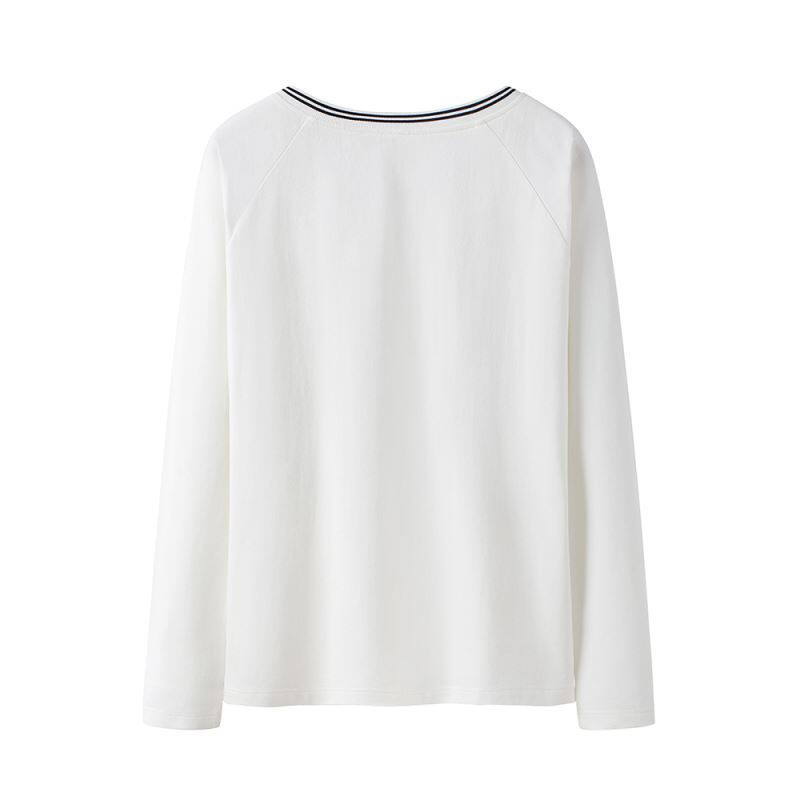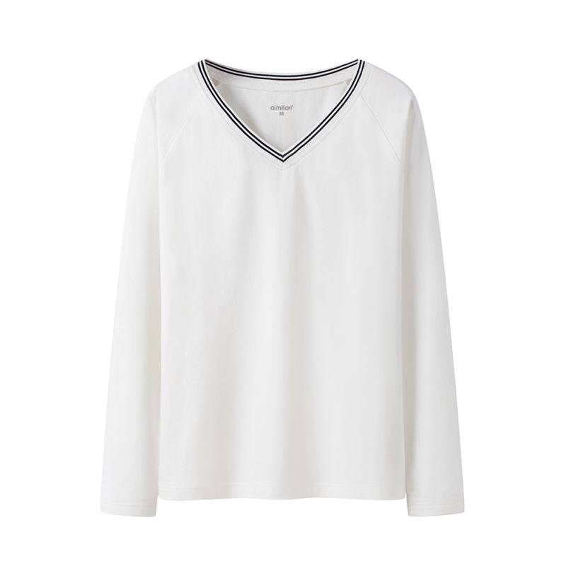 Осенний однотонный базовый приятный телу хлопковый белый лонгслив, V-образный вырез