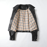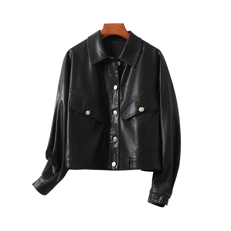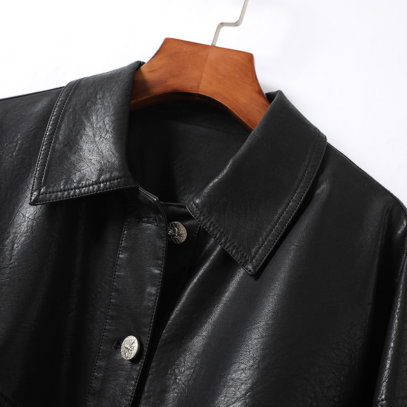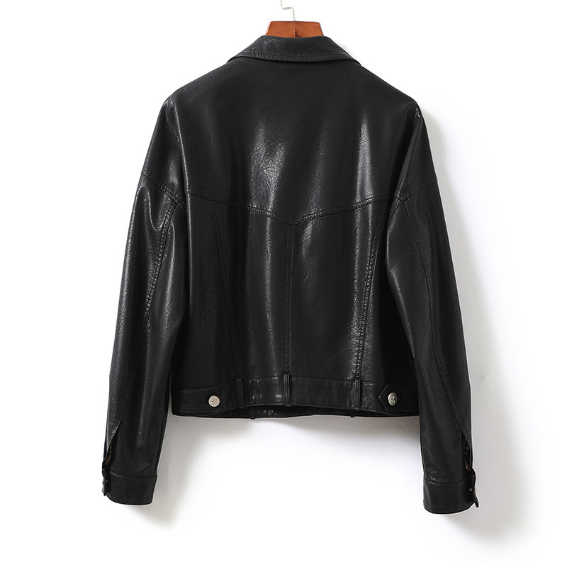 Короткая черная куртка, свободный крой, из натуральной кожи, коллекция 2023, в корейском стиле