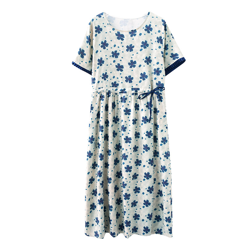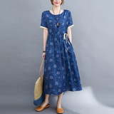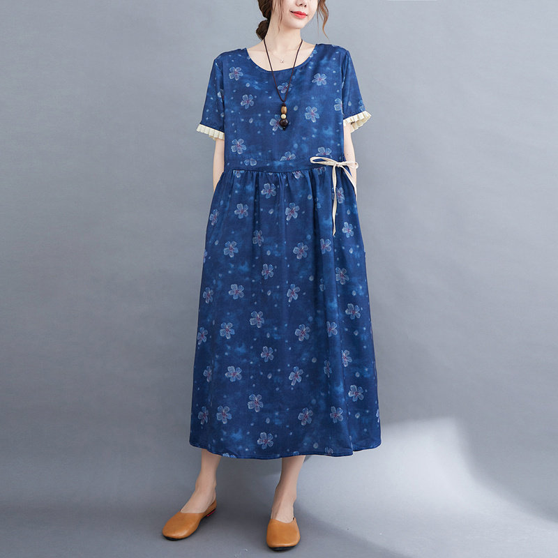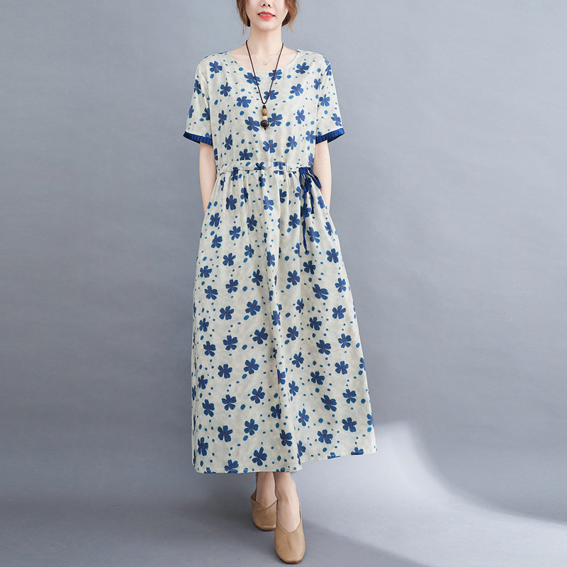 Платье для отдыха с круглым воротником, длинная юбка, из хлопка и льна, в цветочек, большой размер, по фигуре, короткий рукав