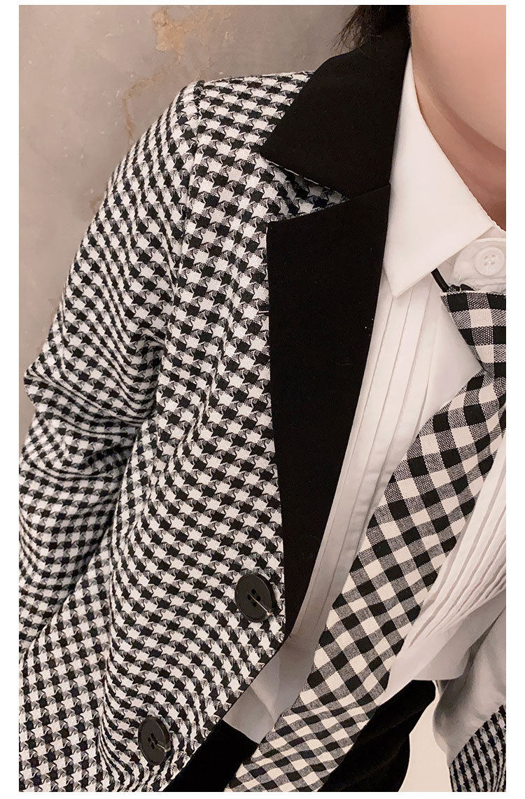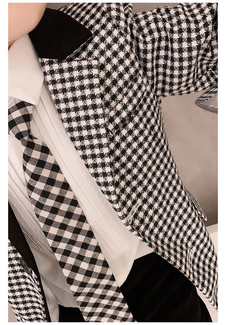 | Цвет: | Костюм одинарный с присборенным воротником в ломаную клетку, Костюм с сращенным воротником «гусиные лапки» + рубашка + брюки |