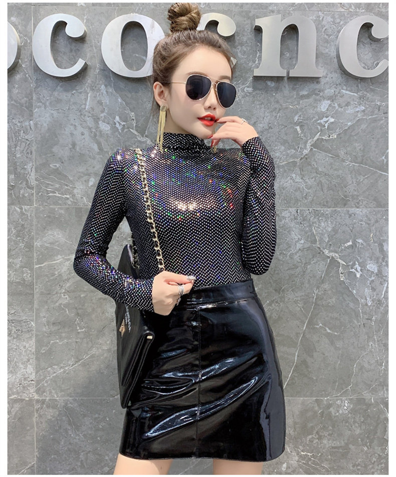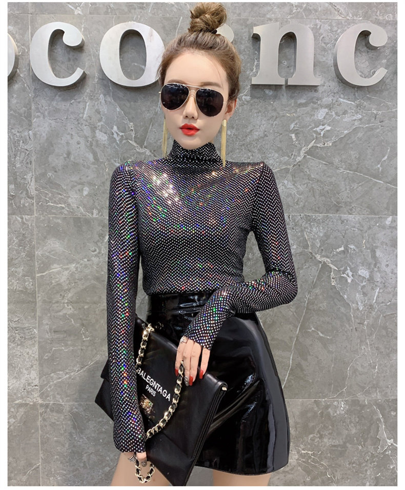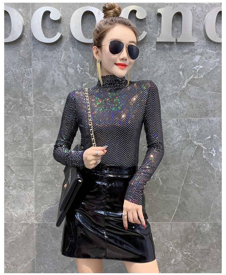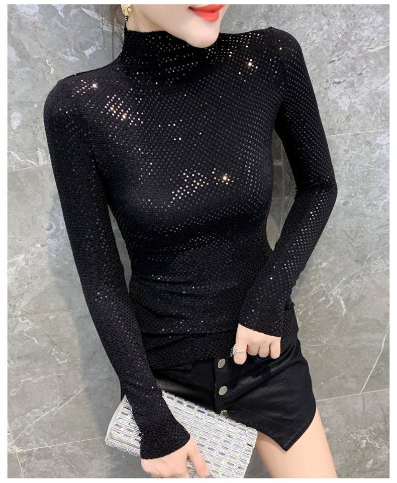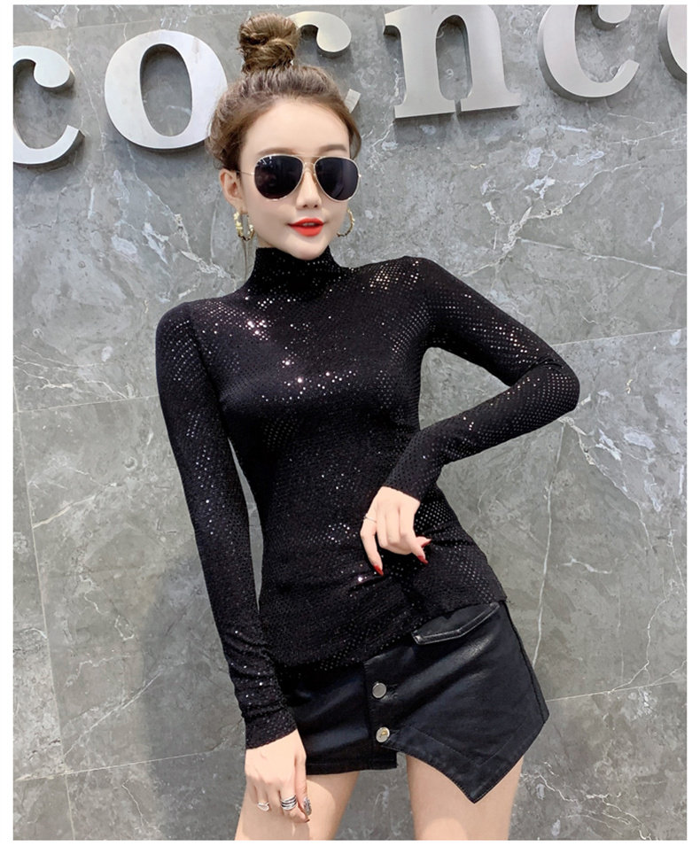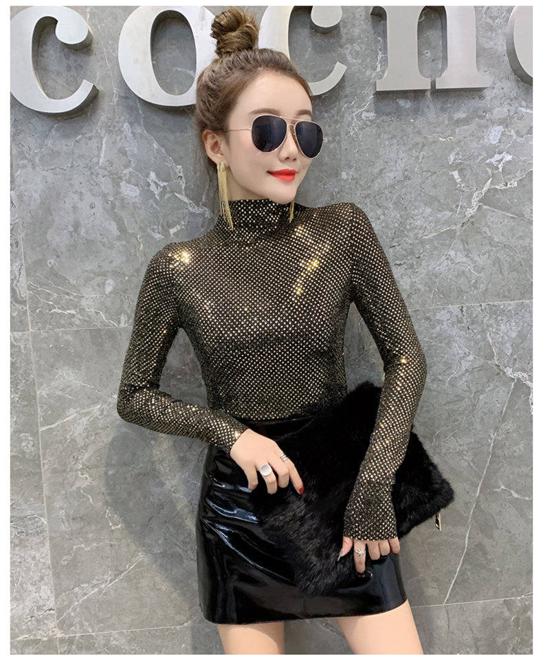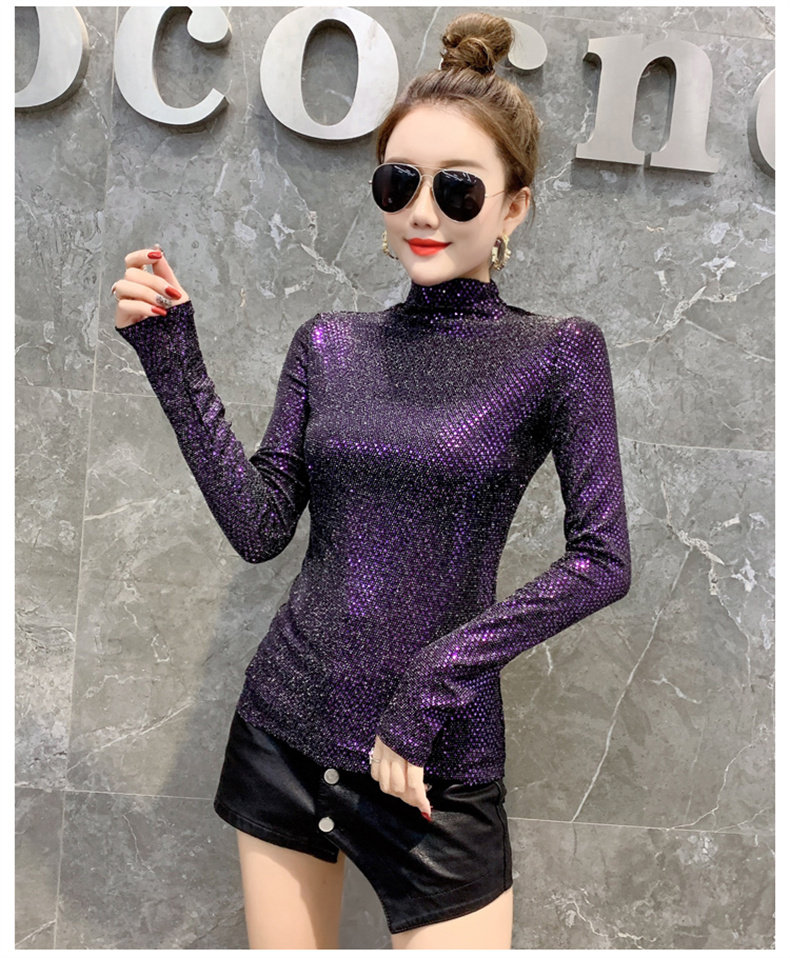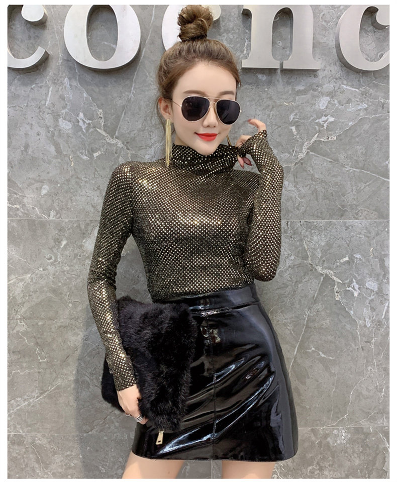 Базовая приятная телу осенняя блестящая футболка, лонгслив, высокий воротник, городской стиль, с рукавом, в западном стиле