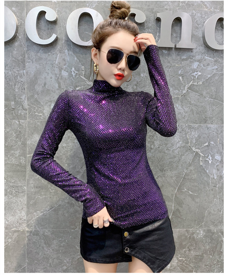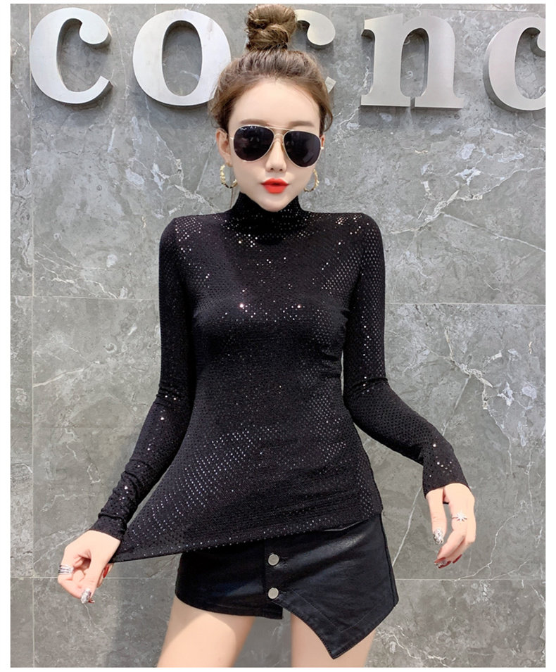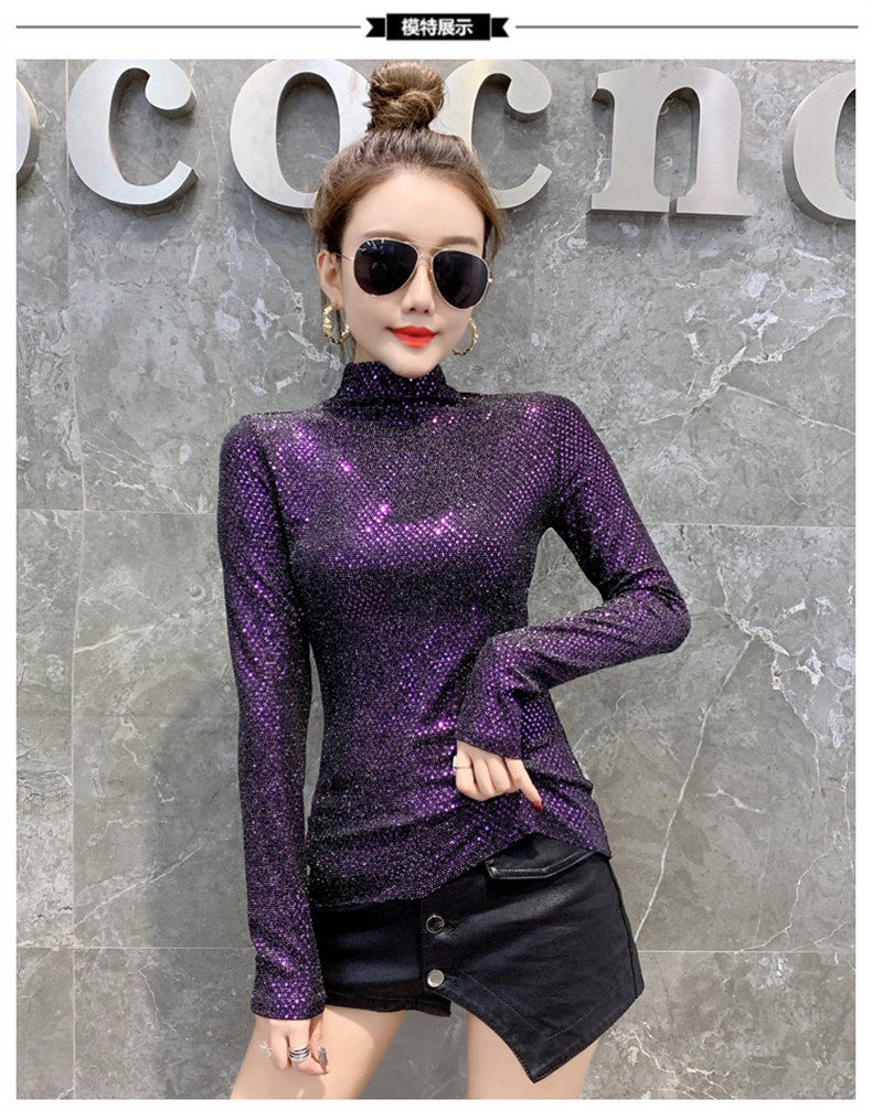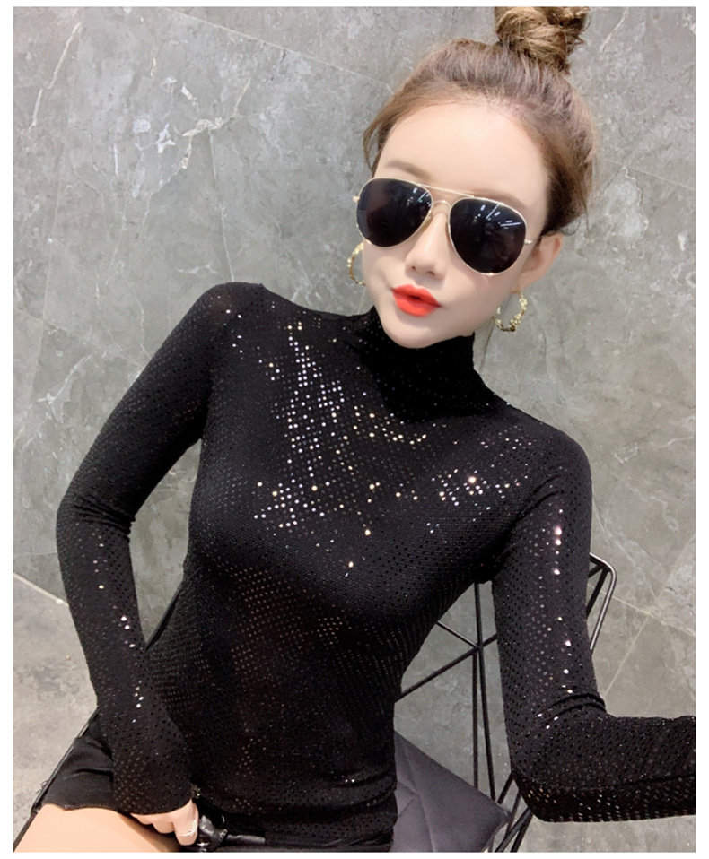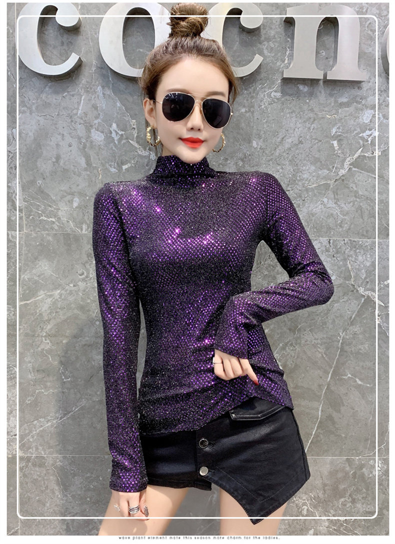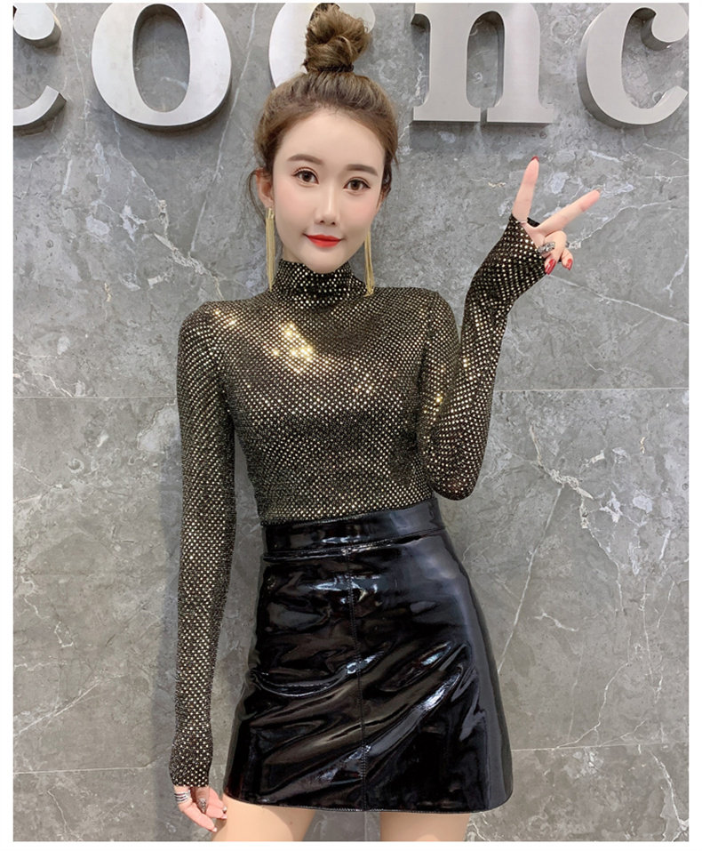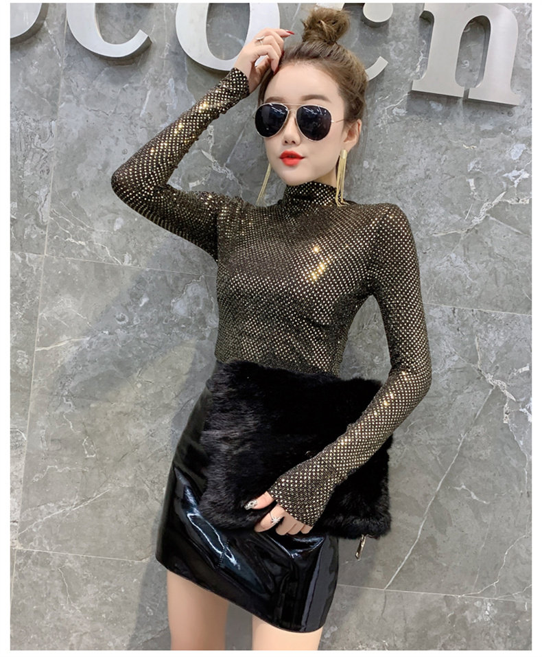 Базовая приятная телу осенняя блестящая футболка, лонгслив, высокий воротник, городской стиль, с рукавом, в западном стиле