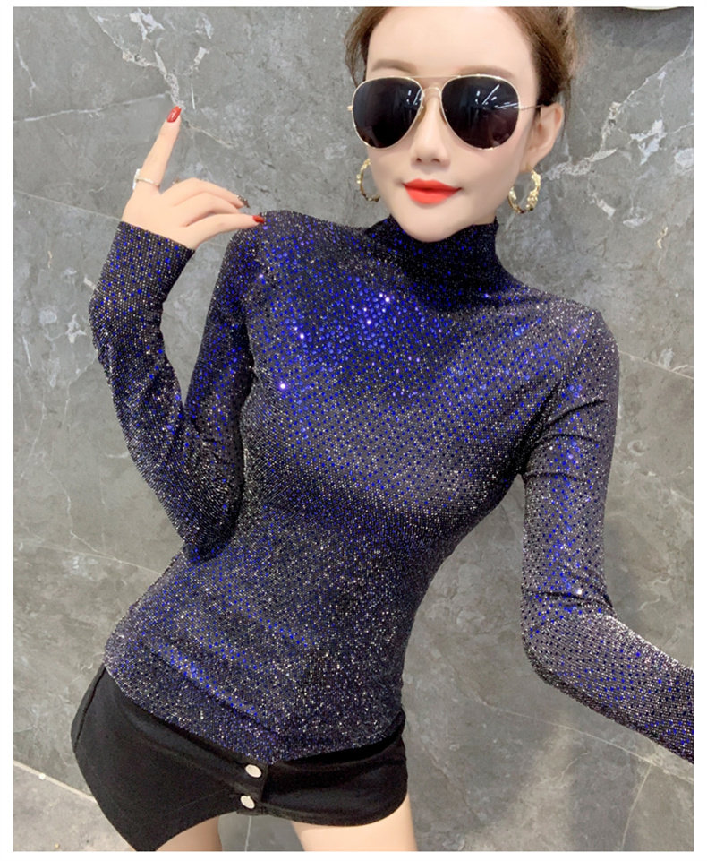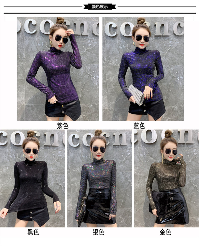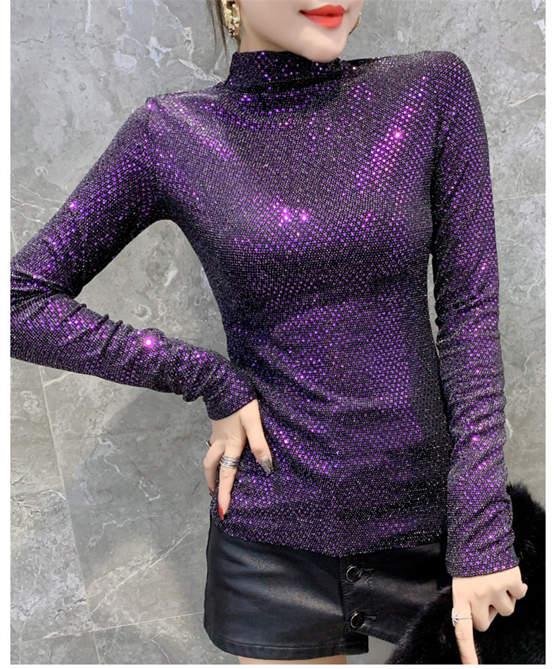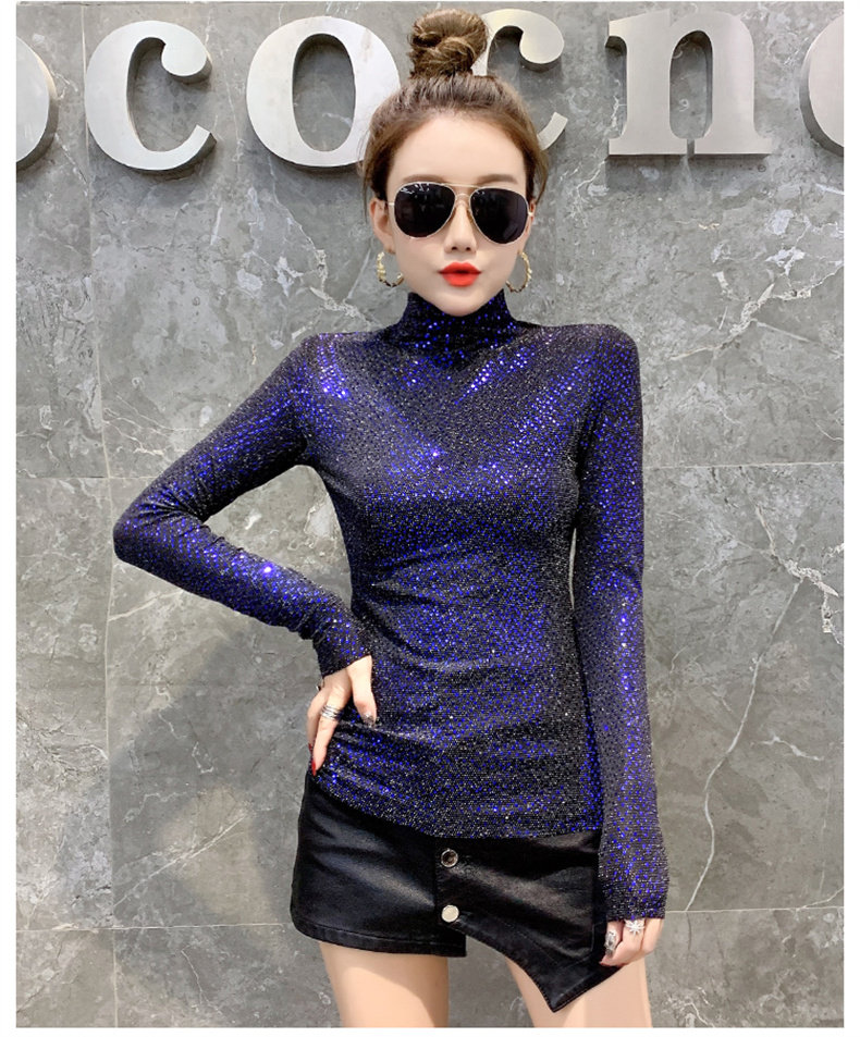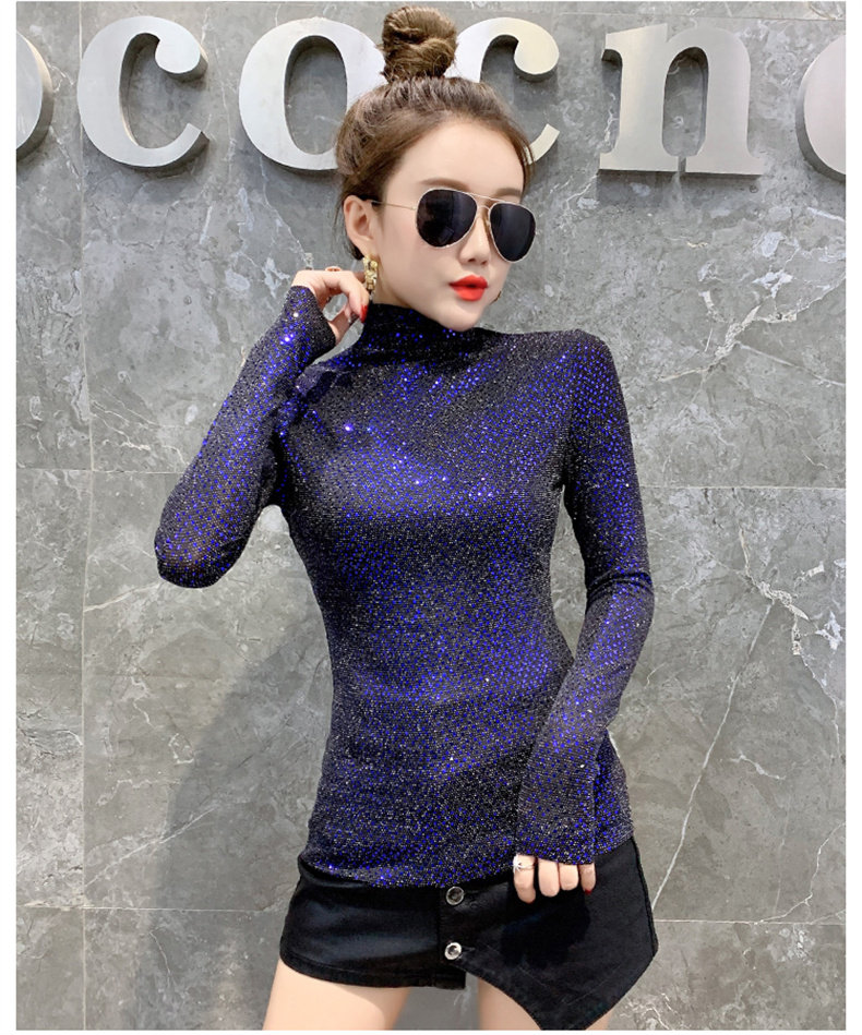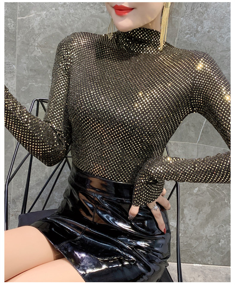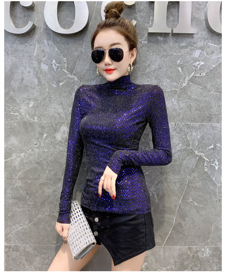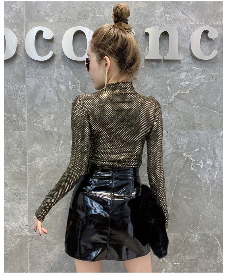 Базовая приятная телу осенняя блестящая футболка, лонгслив, высокий воротник, городской стиль, с рукавом, в западном стиле