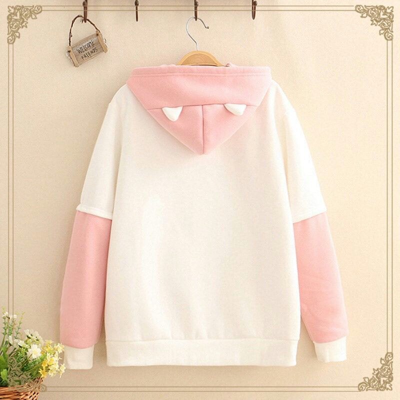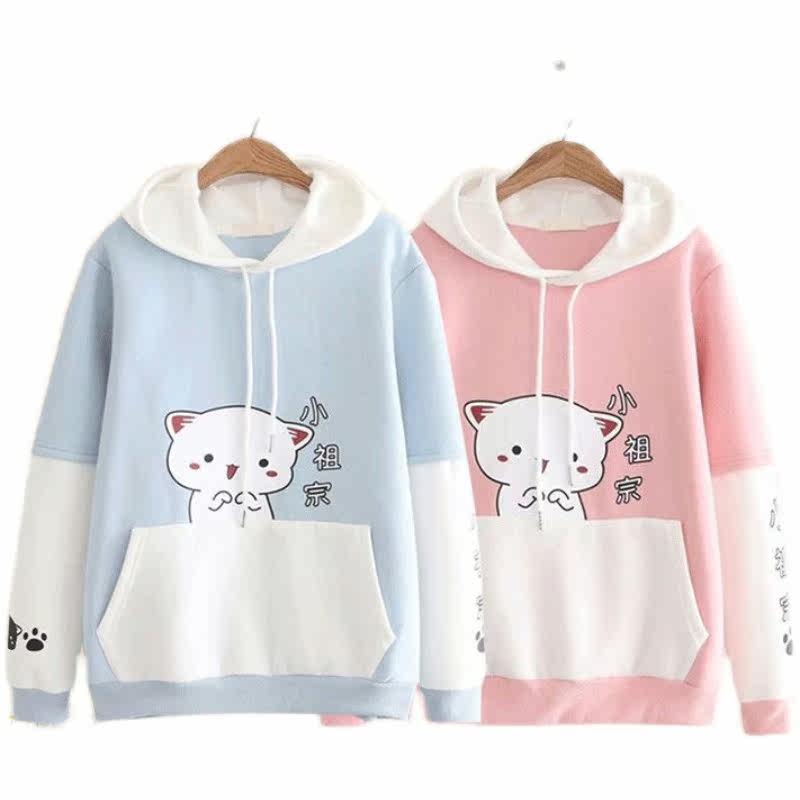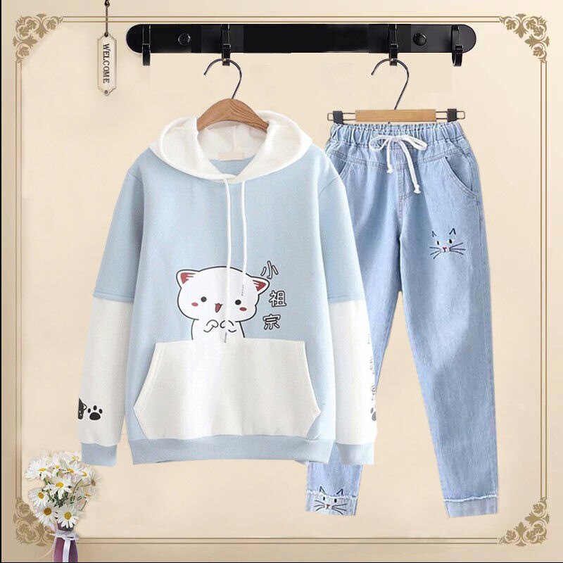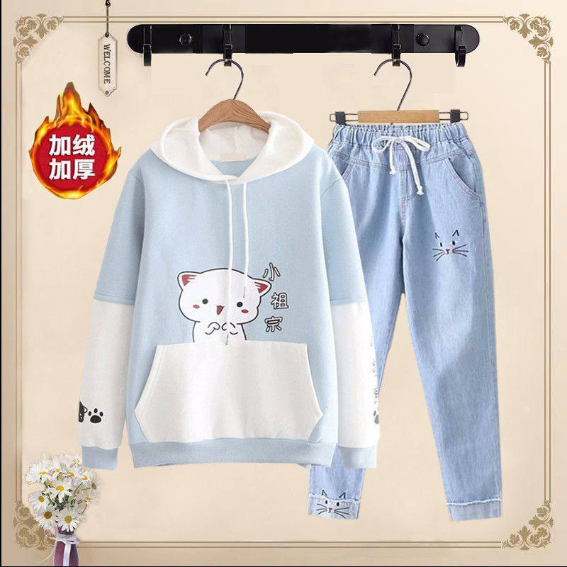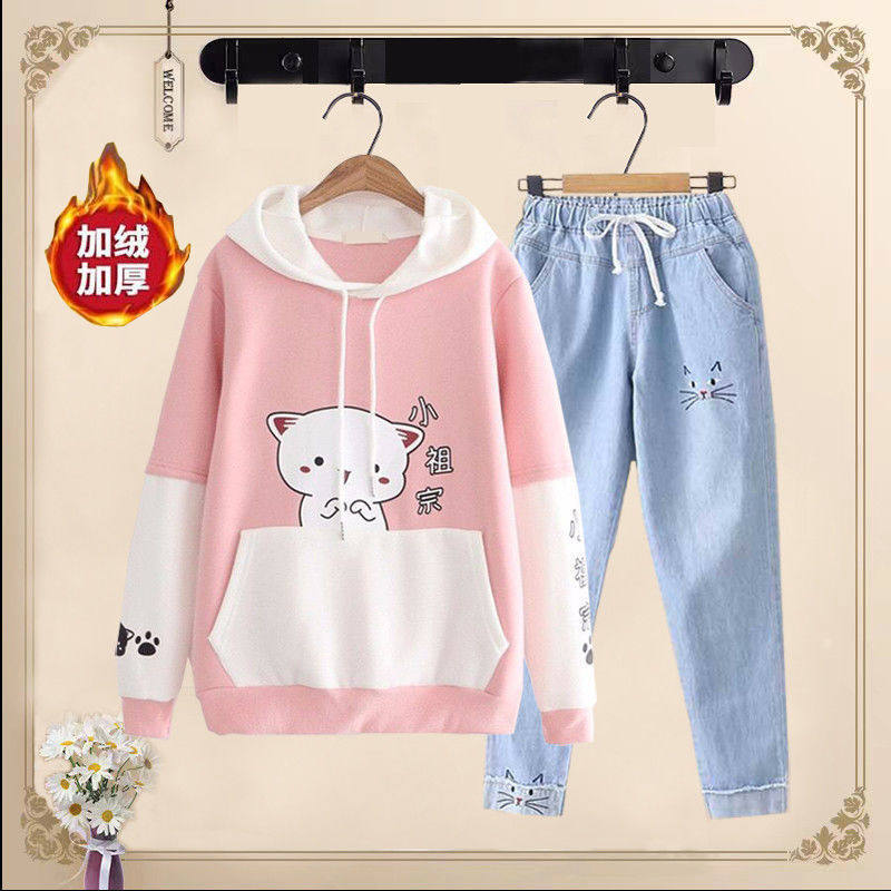 Комплект, флисовая милая толстовка для школьников и студентов, японские джинсы с капюшоном, штаны, для средней школы, свободный крой