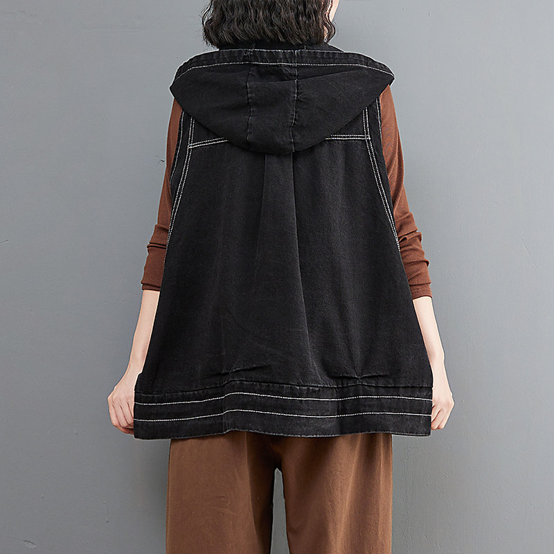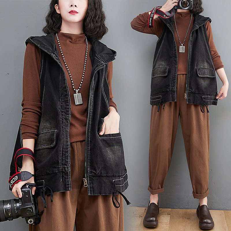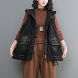 Ретро джинсовый жилет, плащ с капюшоном с молнией, большой размер, свободный крой, на шнурках