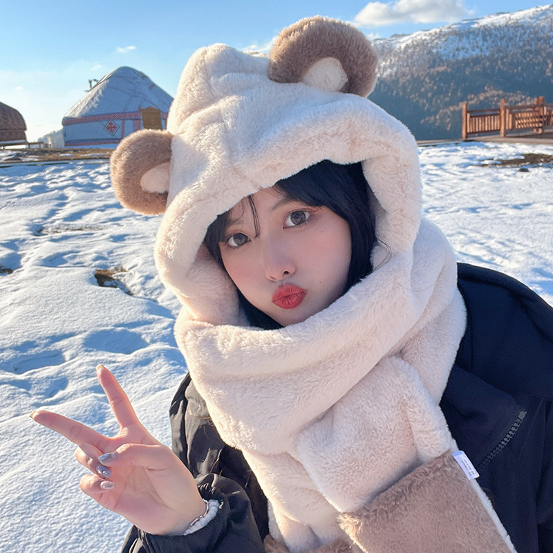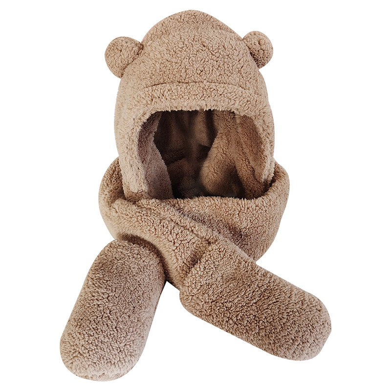 Демисезонная шапка, зимний шарф, удерживающие тепло бархатные перчатки, милый комплект с капюшоном, с медвежатами, 3 предмета