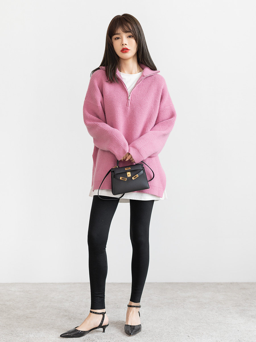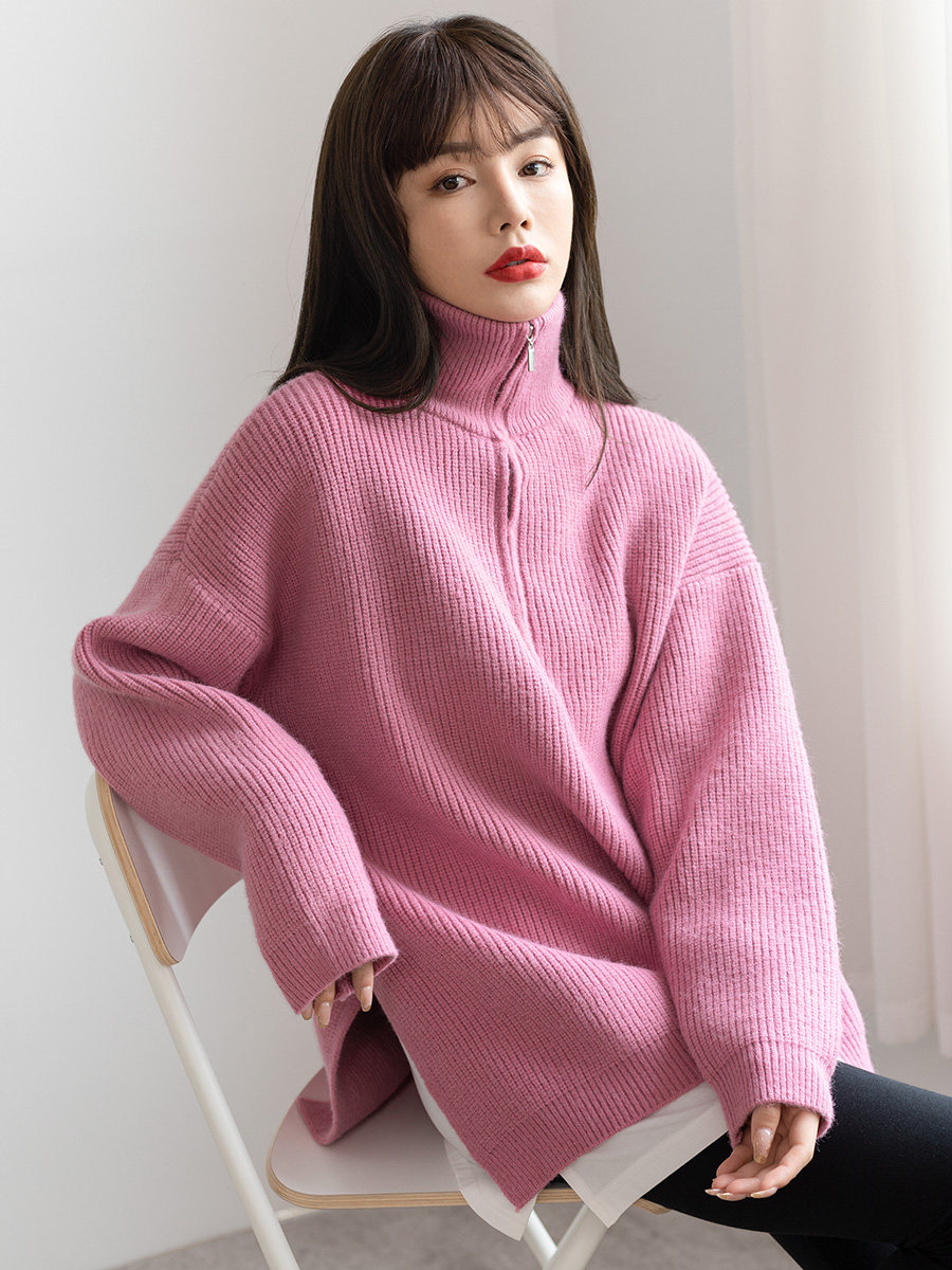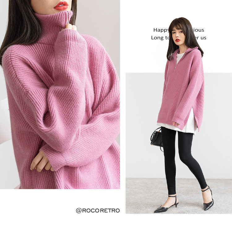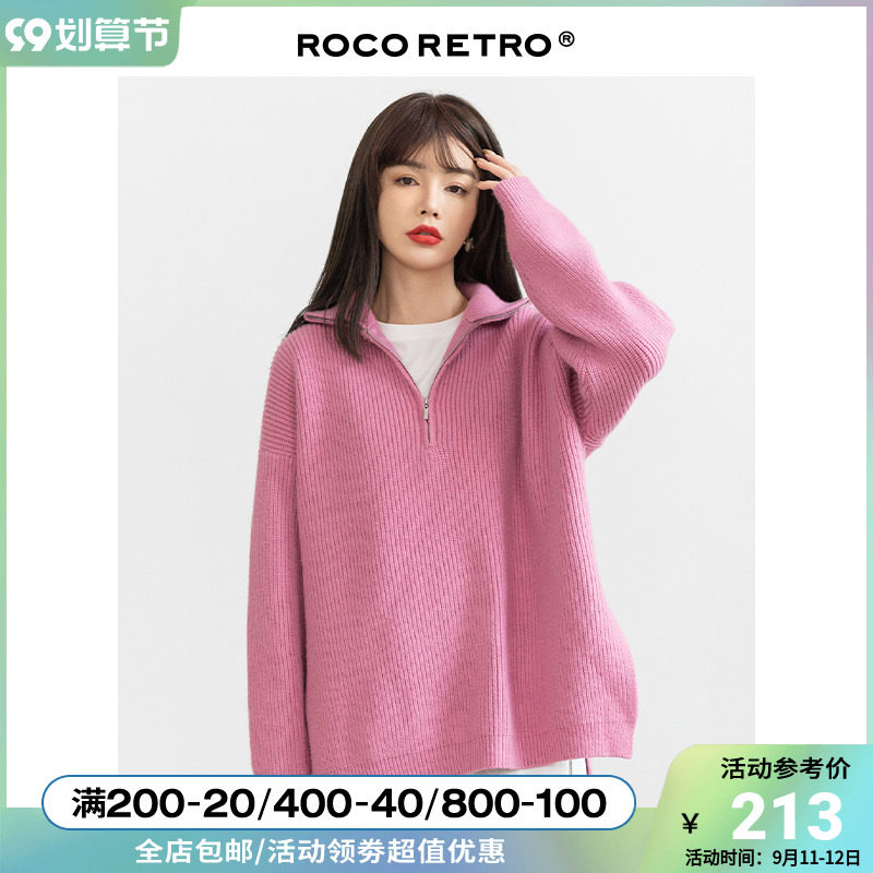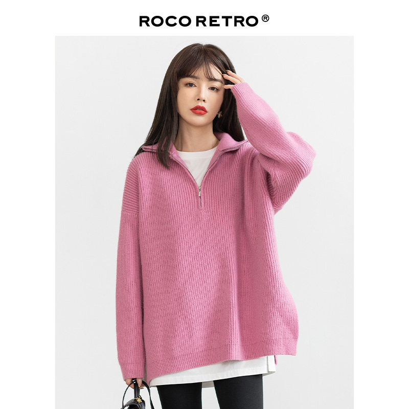 Розовый осенний ретро японский дизайнерский свитер с молнией, V-образный вырез, свободный крой, тренд сезона