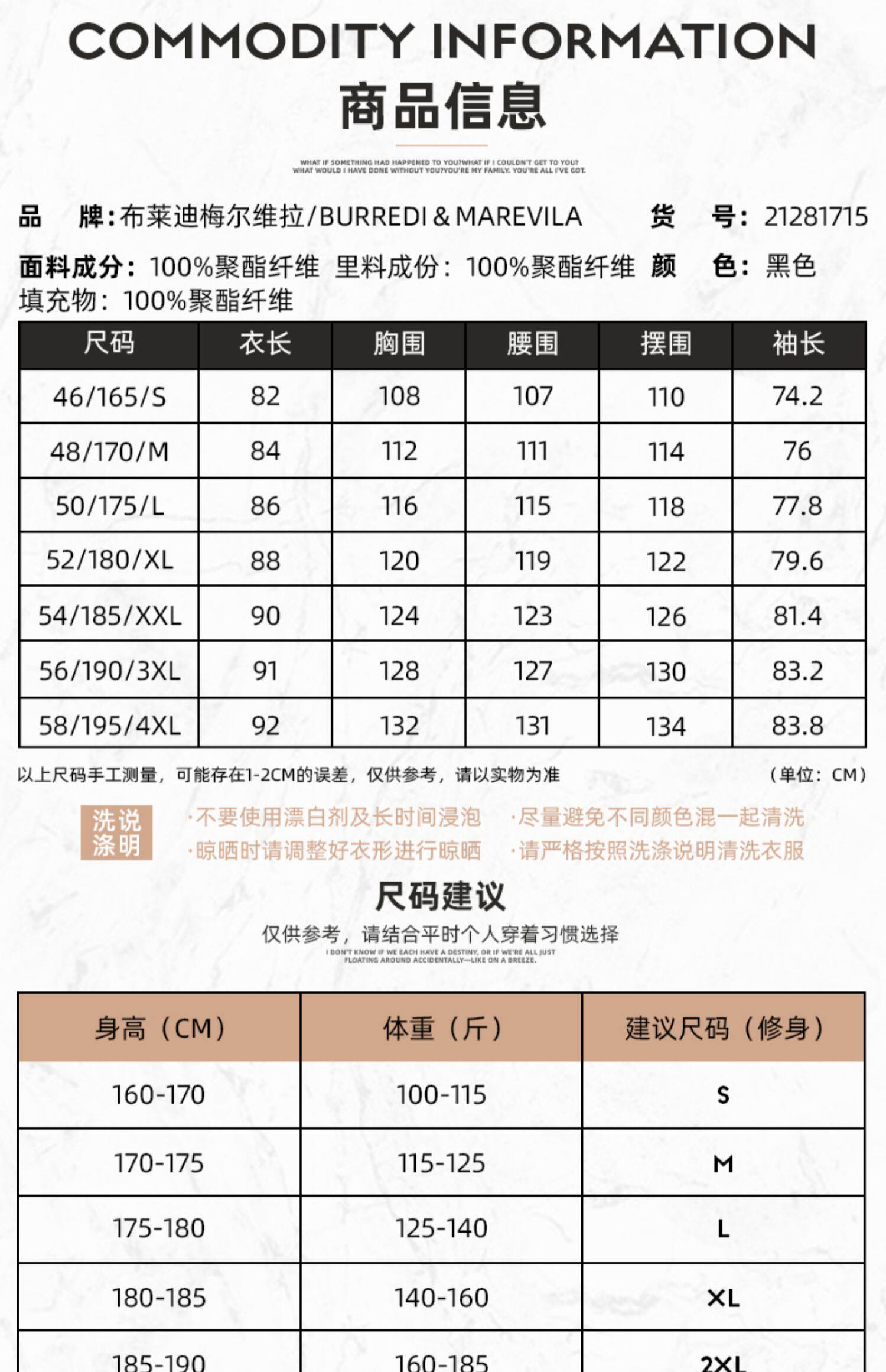 - 56/XXXL/190 46/S/165 54/XXL/185 52/XL/180