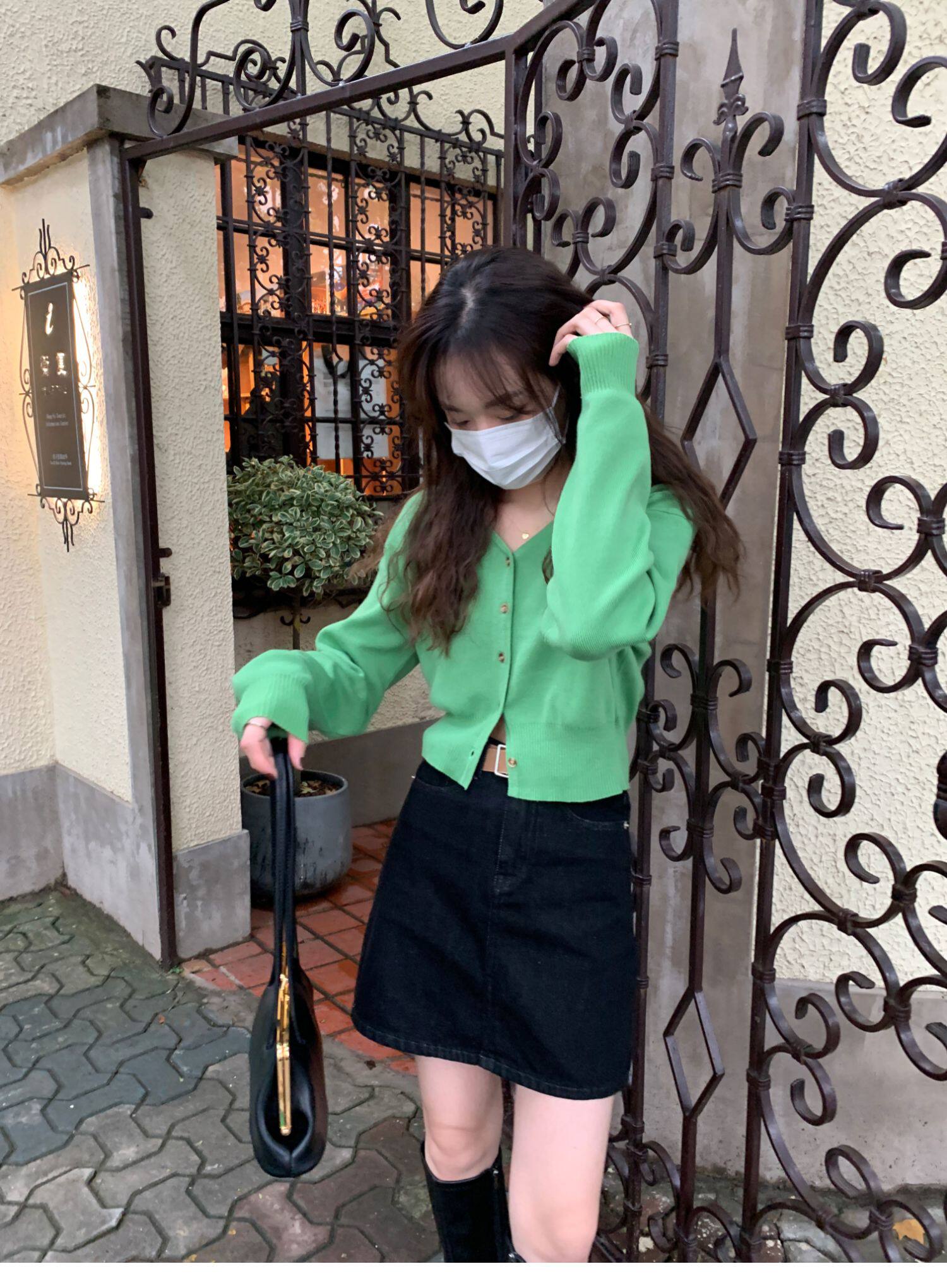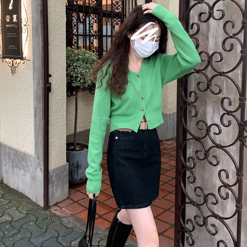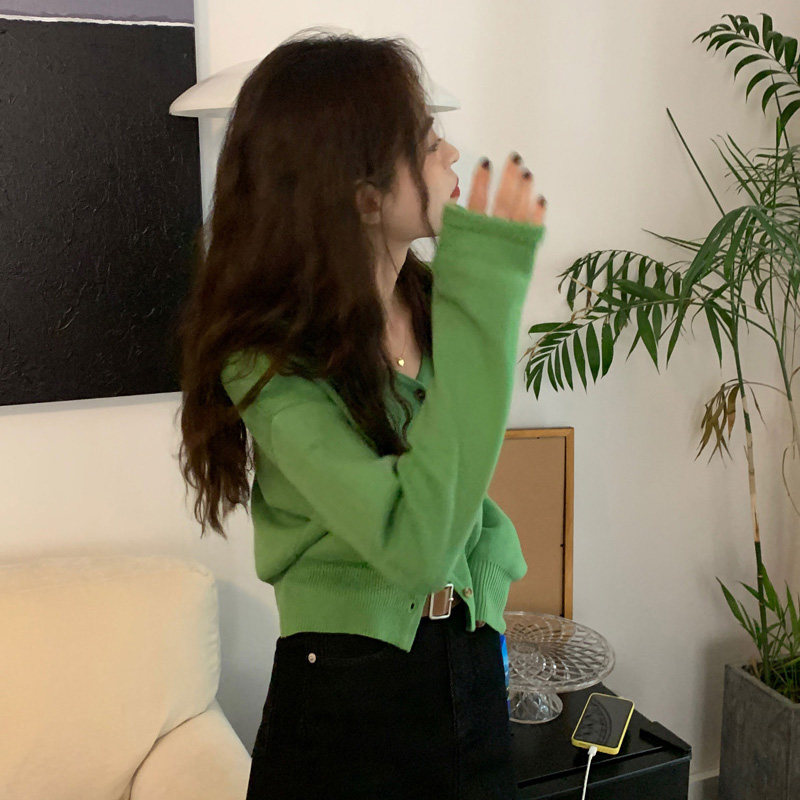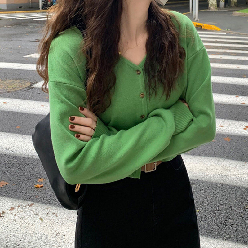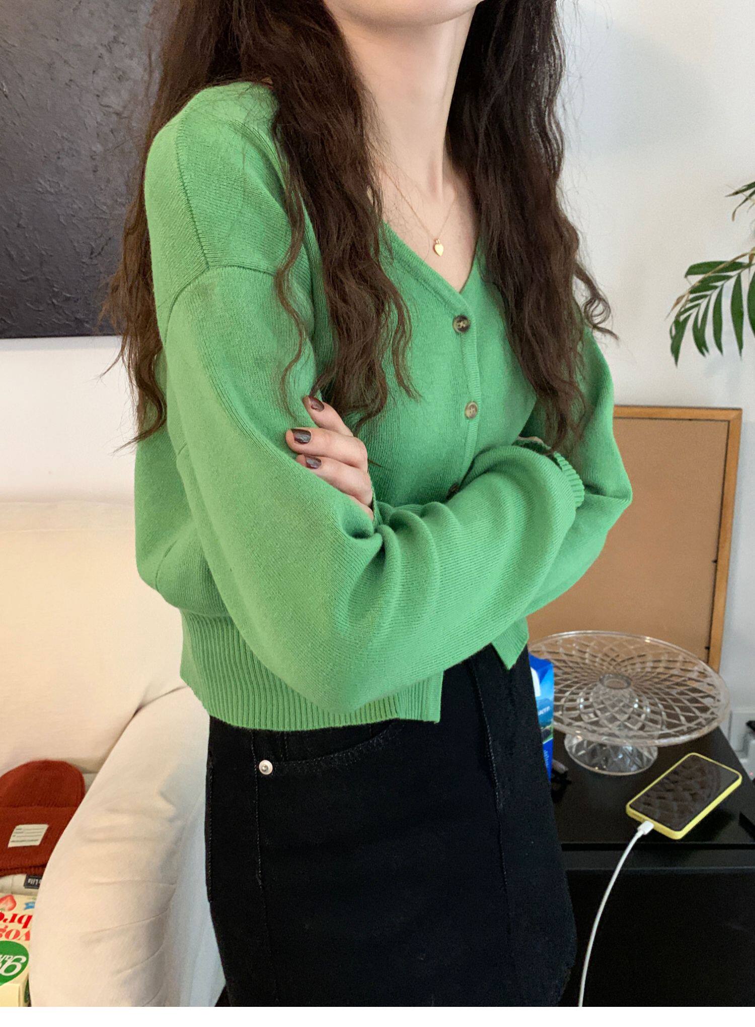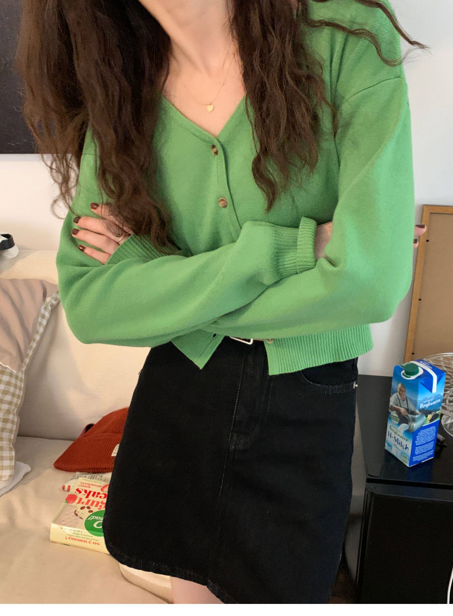 Зеленый свитер, короткий трикотажный осенний кардиган, высокая талия, V-образный вырез