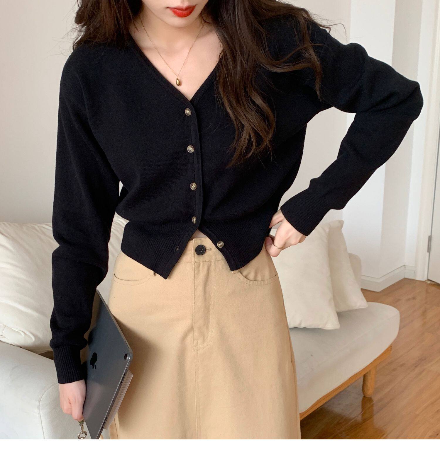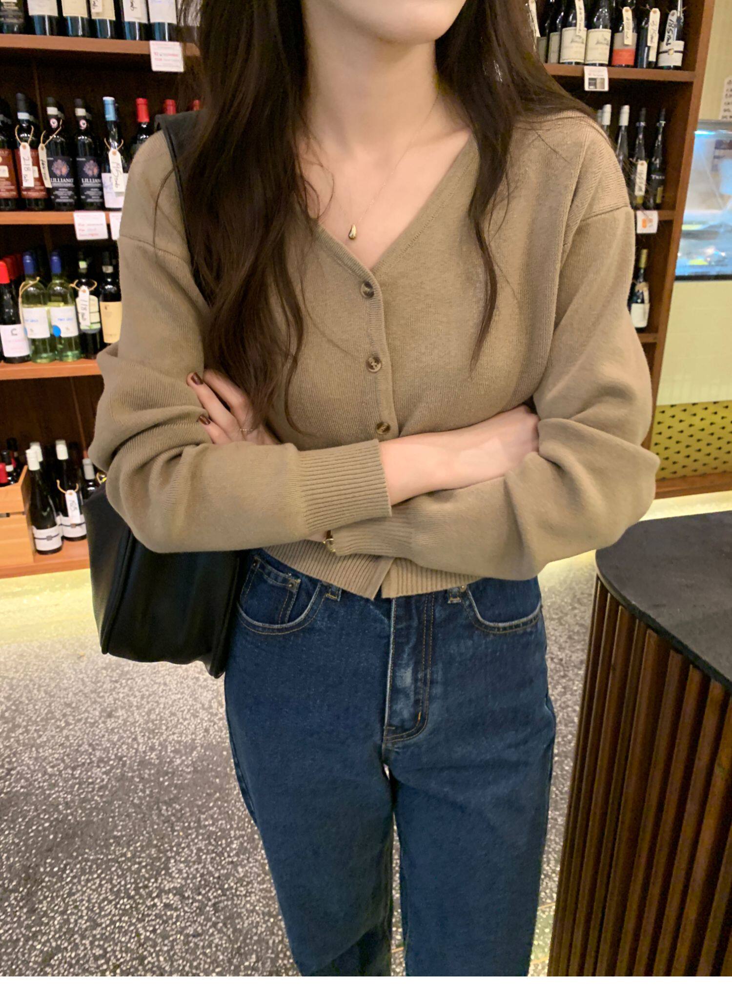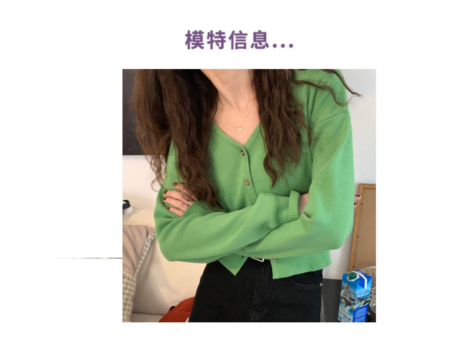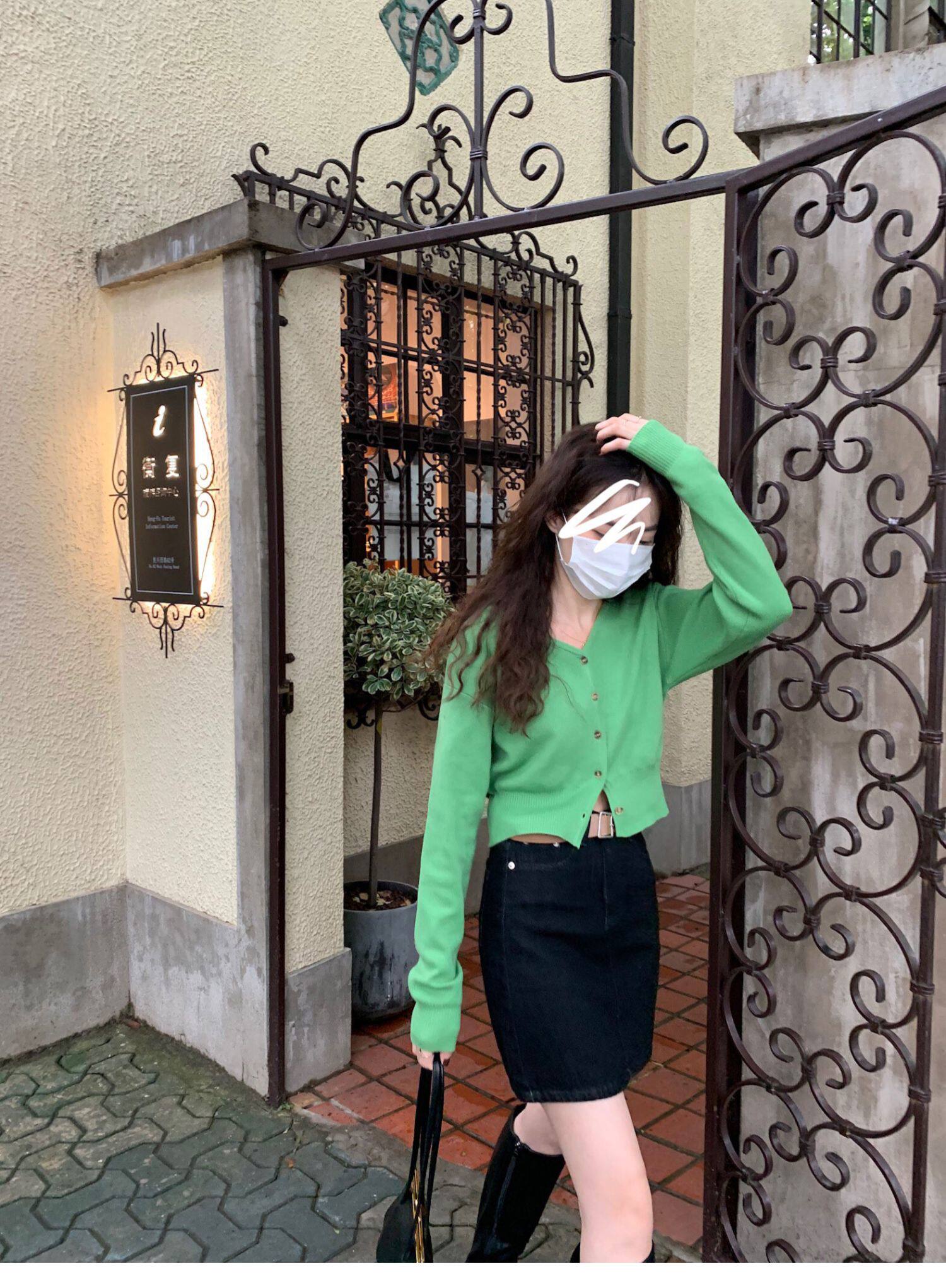 Зеленый свитер, короткий трикотажный осенний кардиган, высокая талия, V-образный вырез